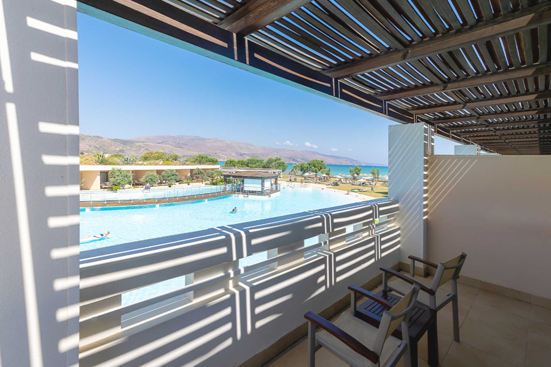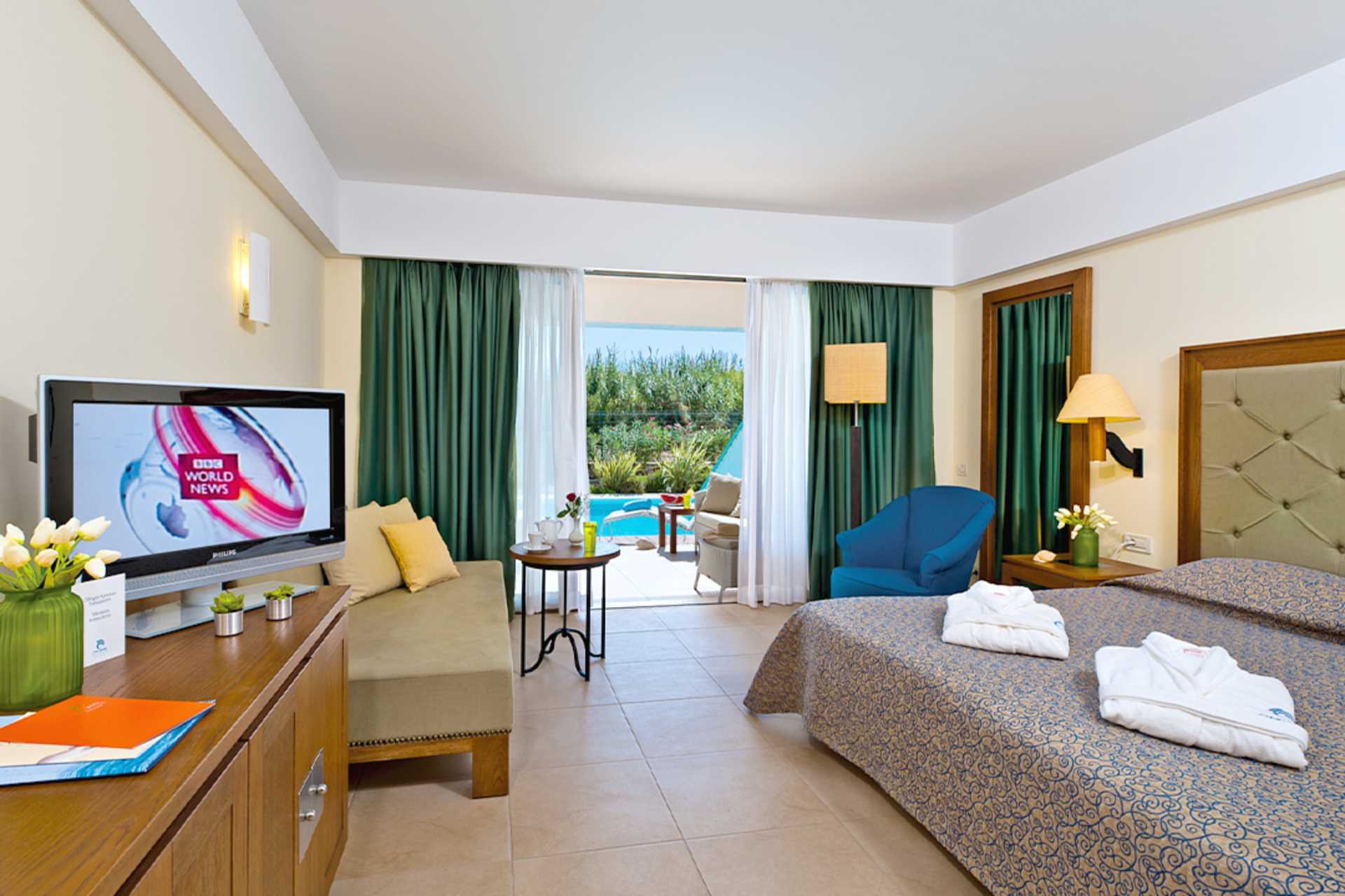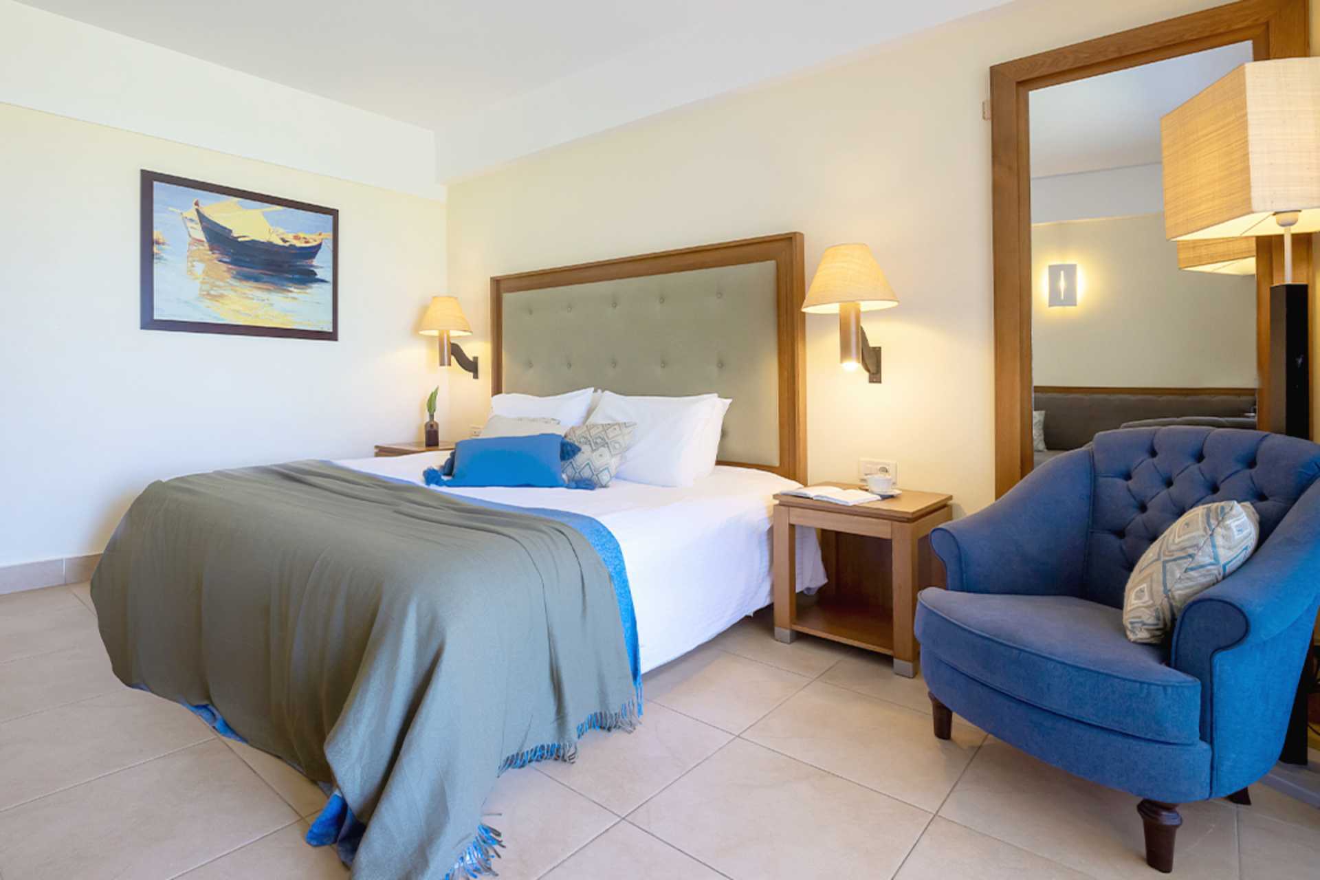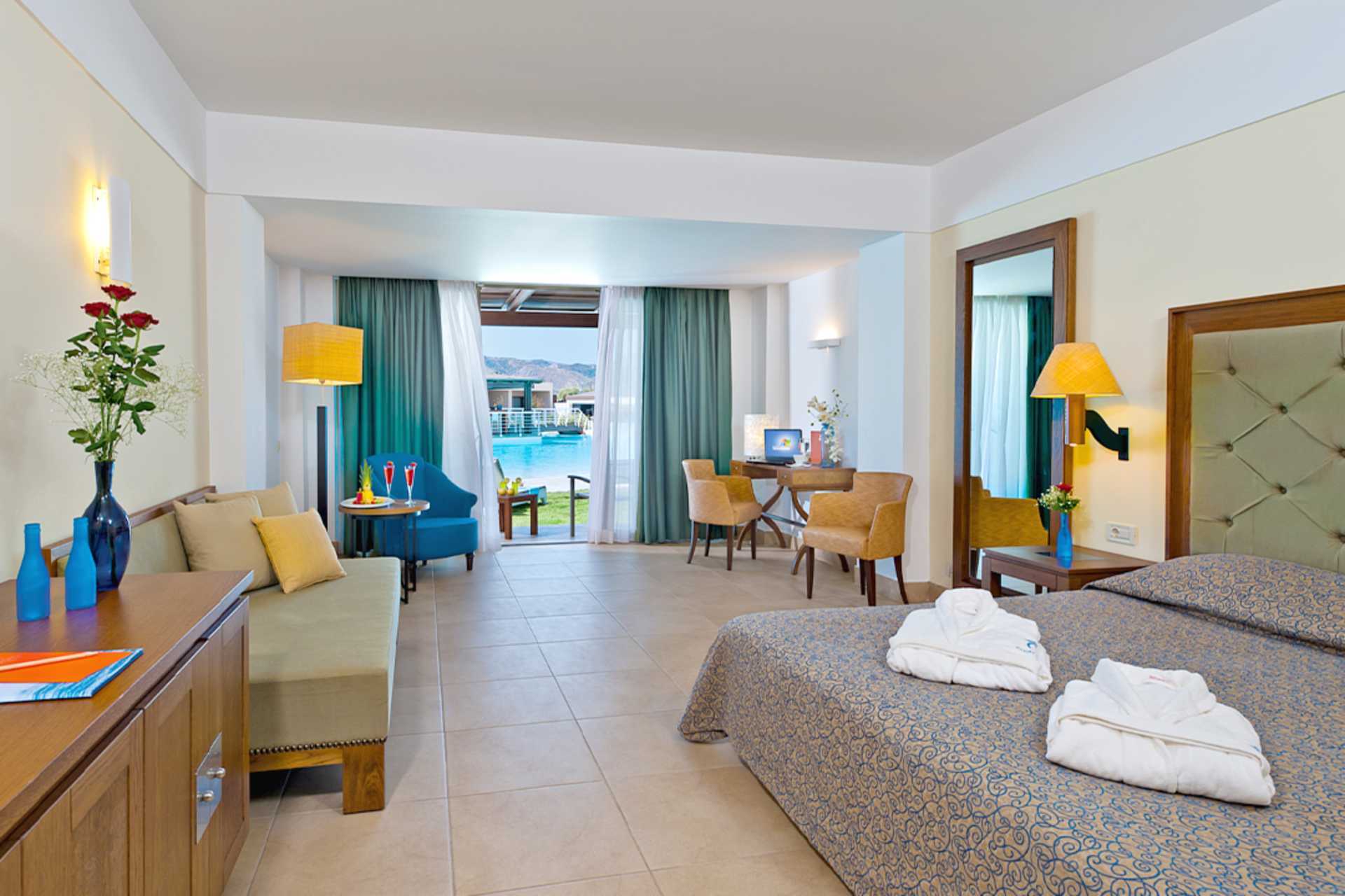 Junior-sviiteistä suora pääsy ulkotilasta suureen yhteiseen altaaseen, rajoitettu merinäköala. Terassilla on aurinkotuoleja sekä pöytiä ja tuoleja. Parivuode. Lisävuodemahdollisuus vuodesohvasta. Maksuton wifi, ilmastointi ja tallelokero. Minibaari lisämaksulla. Vedenkeitin, kahvia ja teetä. Espressokeitin, kapselit lisämaksusta. Tv kansainvälisillä kanavilla. Kylpytakit ja tossut. Hiustenkuivain. Kylpyhuoneessa kylpyamme, suihku ja wc. Siivous 7 krt/viikko.