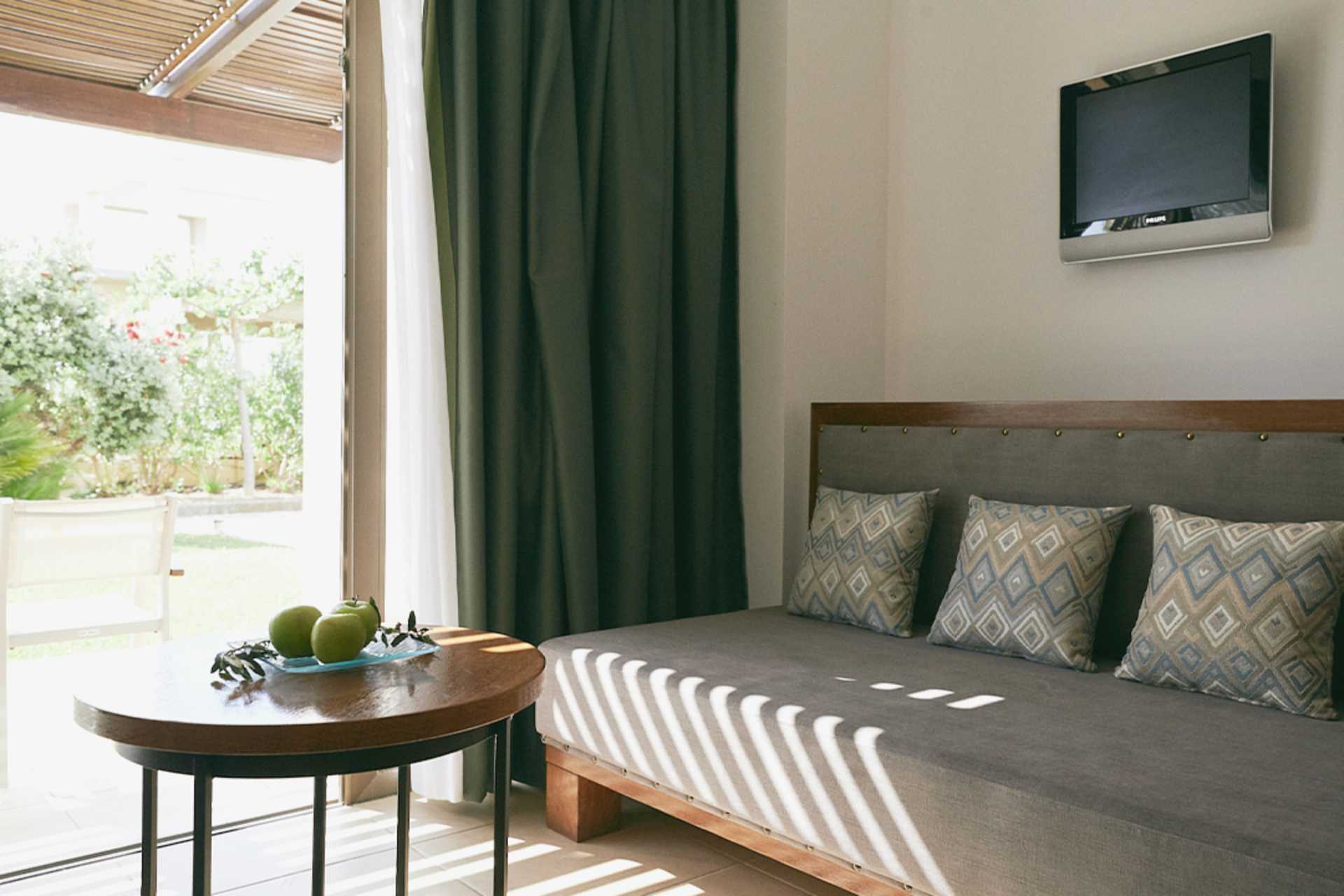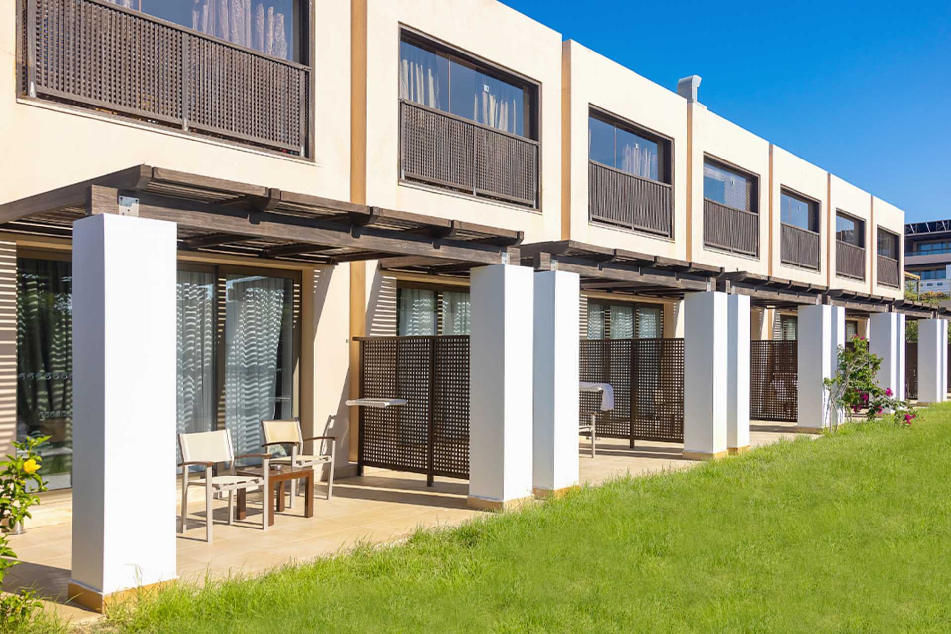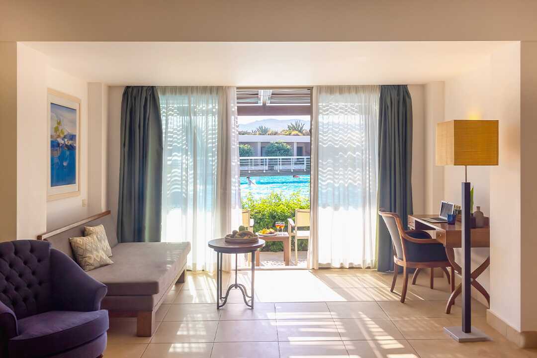 Kahden hengen huone, jossa on maaterassi ja uloskäynti yhteiselle uima-altaalle. Huoneet sijaitsevat erillisen allasalueen vieressä. Terassilla on aurinkotuoleja, pöytiä ja tuoleja sekä tikkaat uima-altaaseen. Parivuode. Mahdollisuus lisävuoteeseen nojatuolissa tai kokoontaitettavassa sängyssä. Maksuton wifi, ilmastointi ja tallelokero. Minibaari lisämaksulla. Vedenkeitin, kahvia ja teetä. Espressokeitin, kapselit lisämaksusta. Tv kansainvälisillä kanavilla. Kylpytakit ja tossut. Hiustenkuivain. Kylpyhuoneessa kylpyamme, suihku ja wc. Siivous 7 krt/viikko.