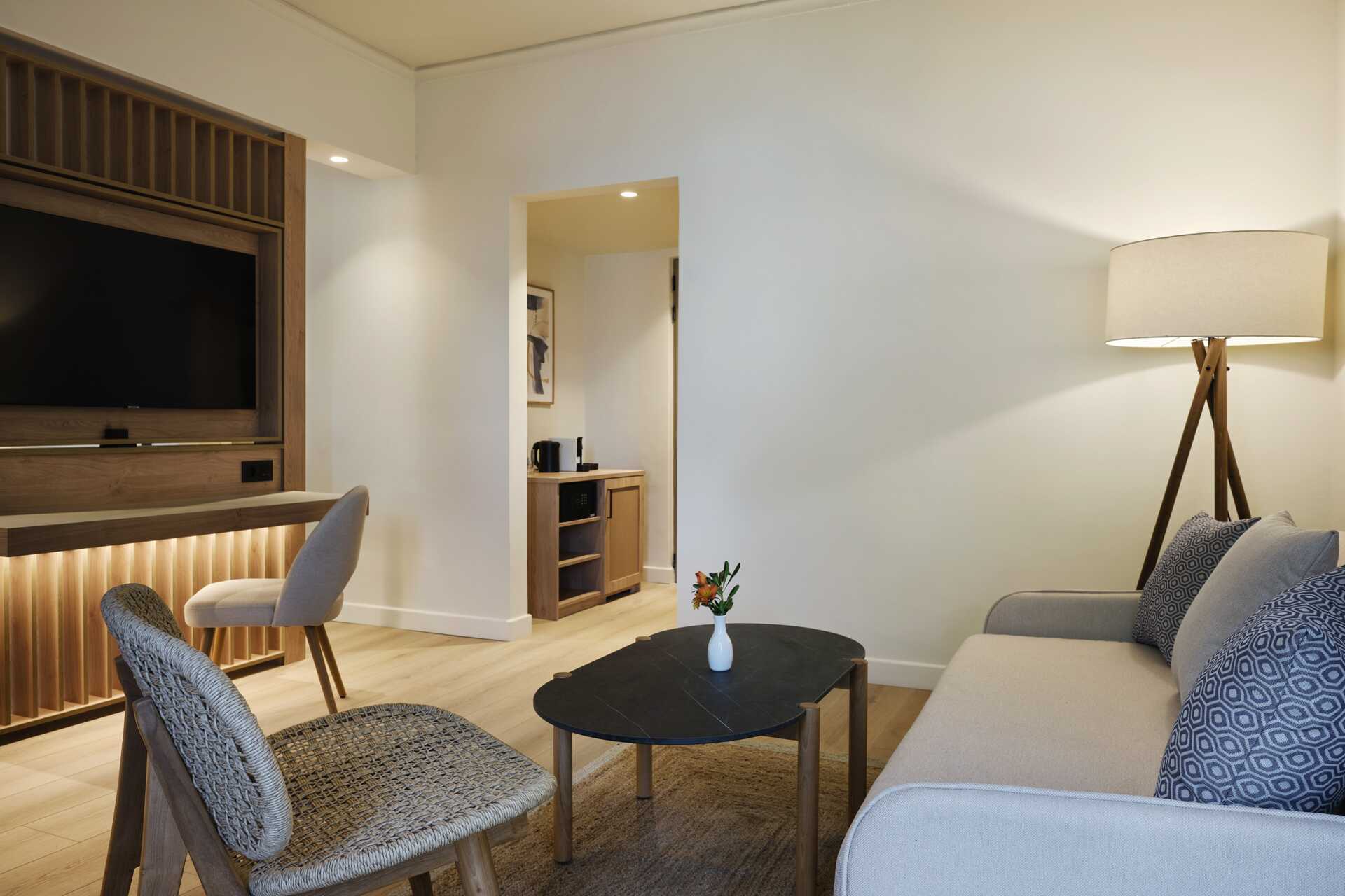 Sviiteissä on parveke tai terassi, joistakin merinäköala ja joistakin rajoitettu merinäköala. Sviitissä on makuuhuone parivuoteella ja olohuone, jossa on mahdollisuus lisävuoteisiin vuodesohvalla. Sviitit sijaitsevat päärakennuksessa tai kahdessa hissittömässä bungalow-rakennuksessa. Maksuton wifi, ilmastointi ja tallelokero. Jääkaappi. Vedenkeitin, kahvia ja teetä. Espressokone. Tv kansainvälisillä kanavilla. Silitysrauta ja -lauta. Hiustenkuivain. Suihku ja wc. Siivous 7 krt/viikko.