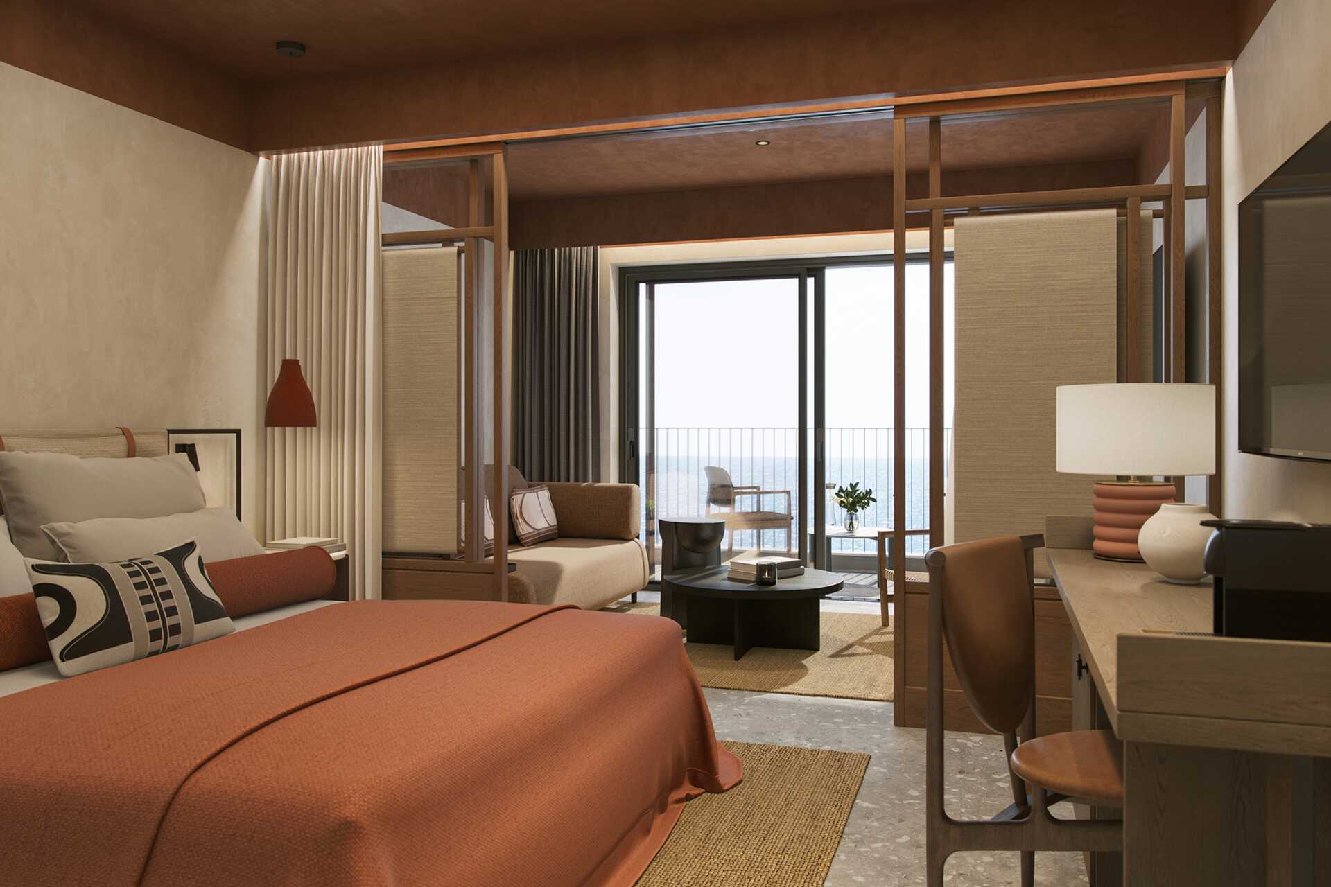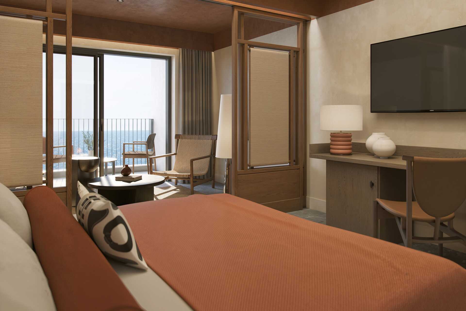 Juniorsviittejä parvekkeella tai terassilla ja merinäköalalla. Huone voidaan jakaa kahteen osaan liukuovella. Parivuode. Lisävuodemahdollisuus vuodesohvasta. Wifi, talletus ja ilmastointi sisältyvät hintaan. Pieni jääkaappi. Vedenkeitin, kahvia ja teetä. Tv kansainvälisillä kanavilla. Kylpytakit ja tossut. Hiustenkuivain. Kylpyhuone suihkulla. Siivous 7 krt/viikko. Alle 2-vuotiaat lapset lasketaan lisävuoteella majoittuviksi henkilöiksi.
