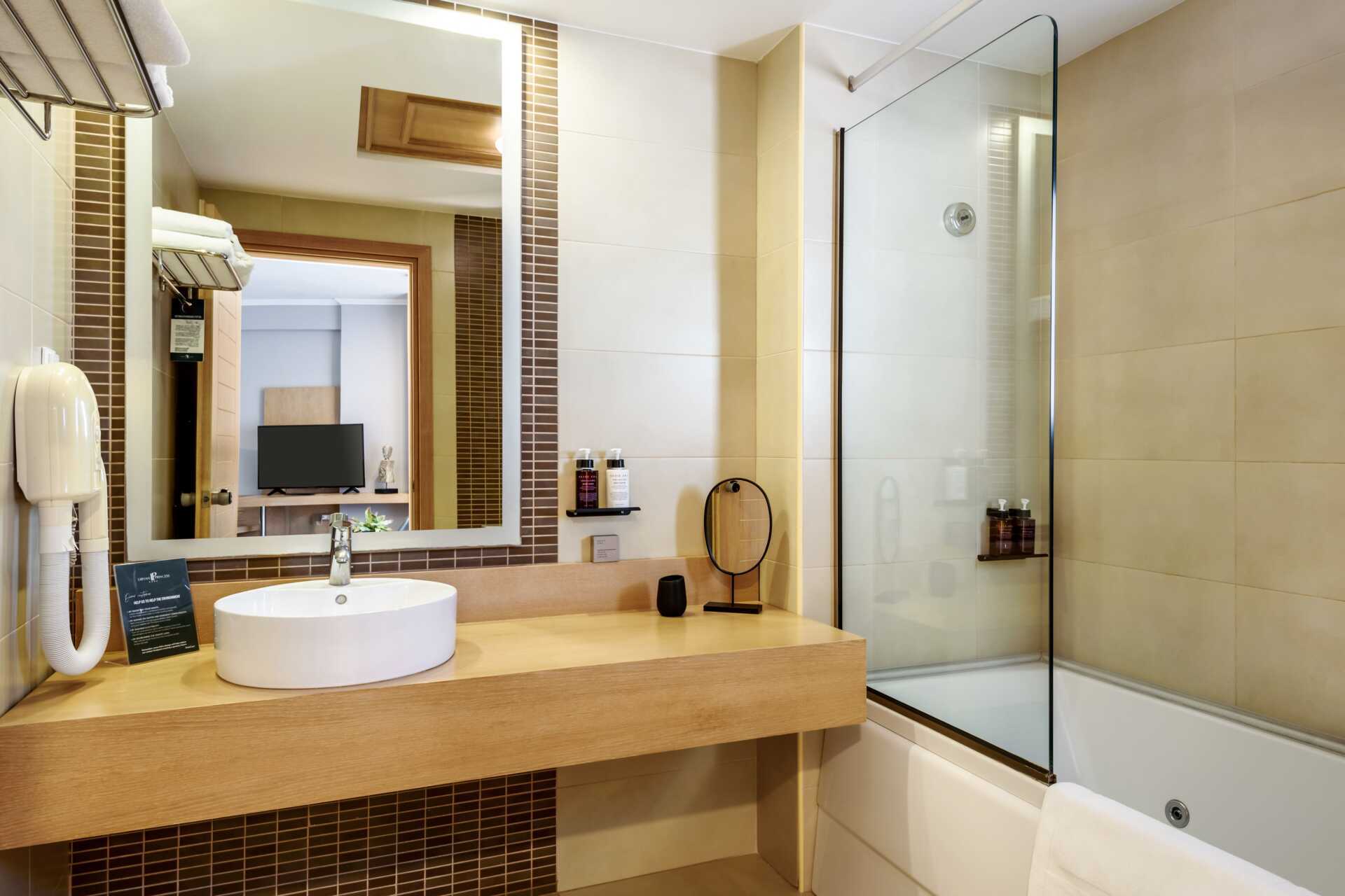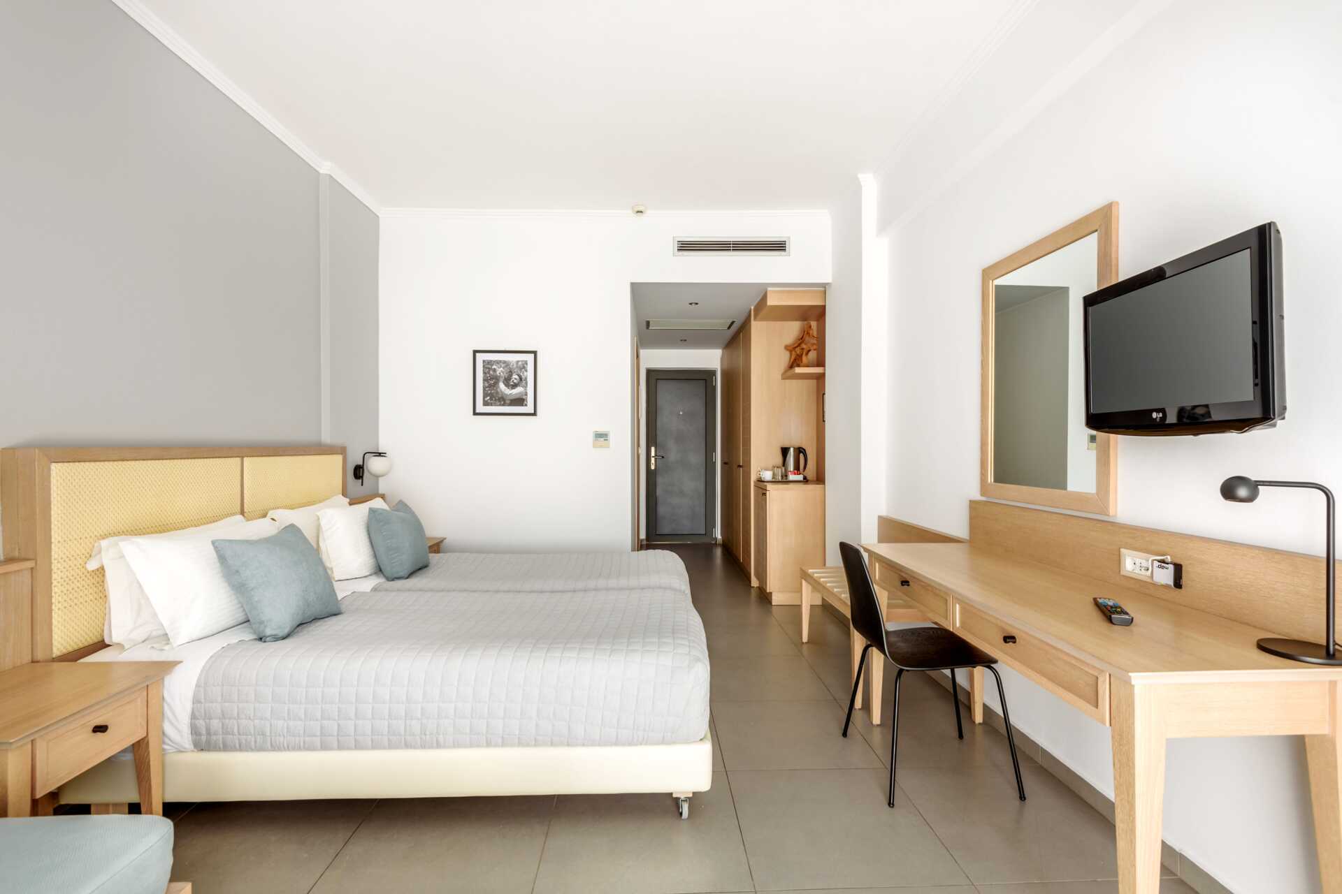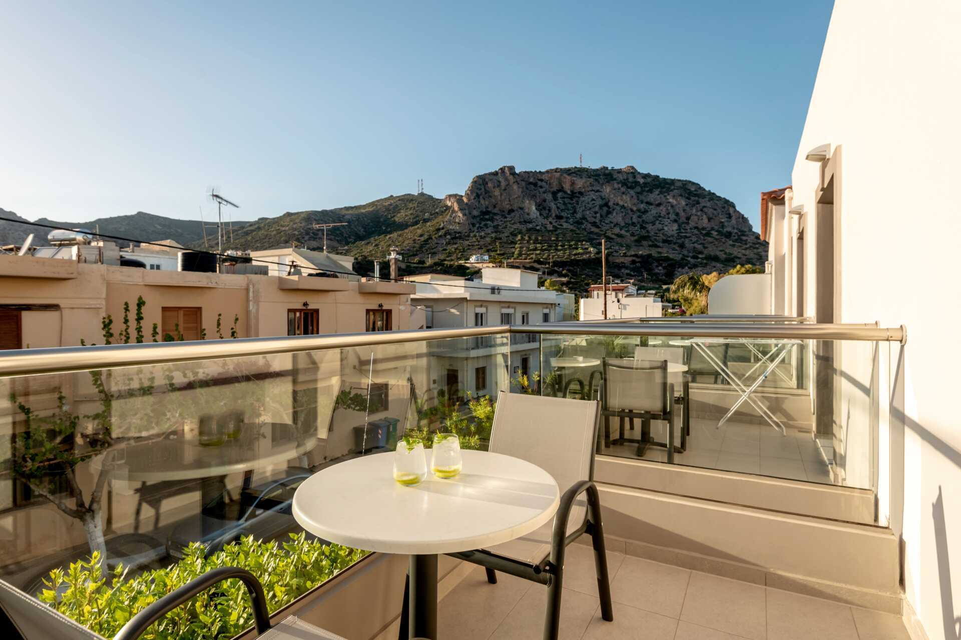 Deluxe-huone parvekkeella tai terassilla. Huoneet ovat erikokoisia. Parivuode tai kaksi yhden hengen sänkyä. Lisävuodemahdollisuus vuodesohvasta. Maksuton wifi, ilmastointi ja tallelokero. Jääkaappi. Vedenkeitin. Espressokeitin pyynnöstä. Tv kansainvälisillä kanavilla. Hiustenkuivain. Kylpytakit ja tossut. Kylpyamme tai suihku ja wc. Siivous 7 krt/viikko.