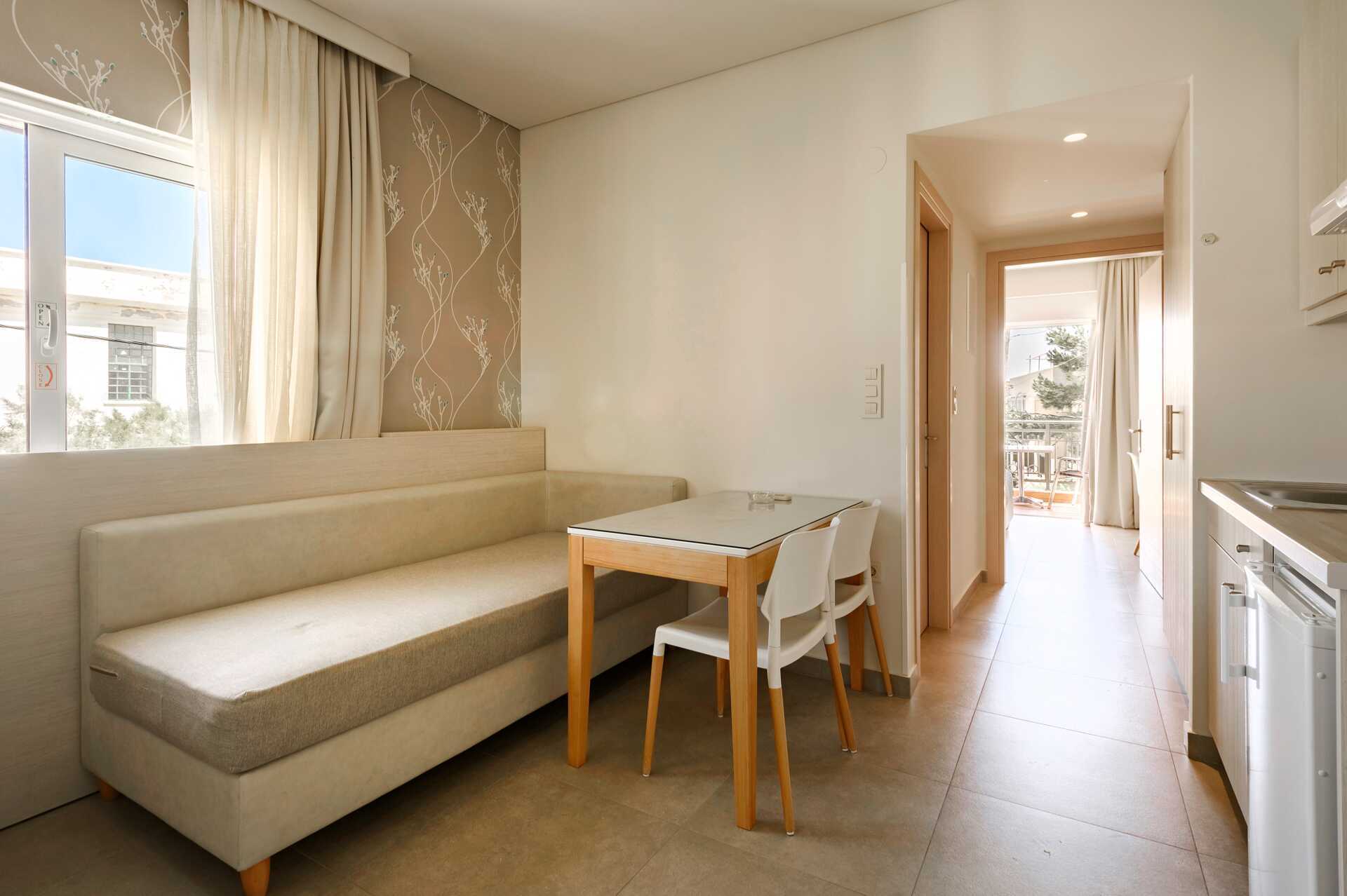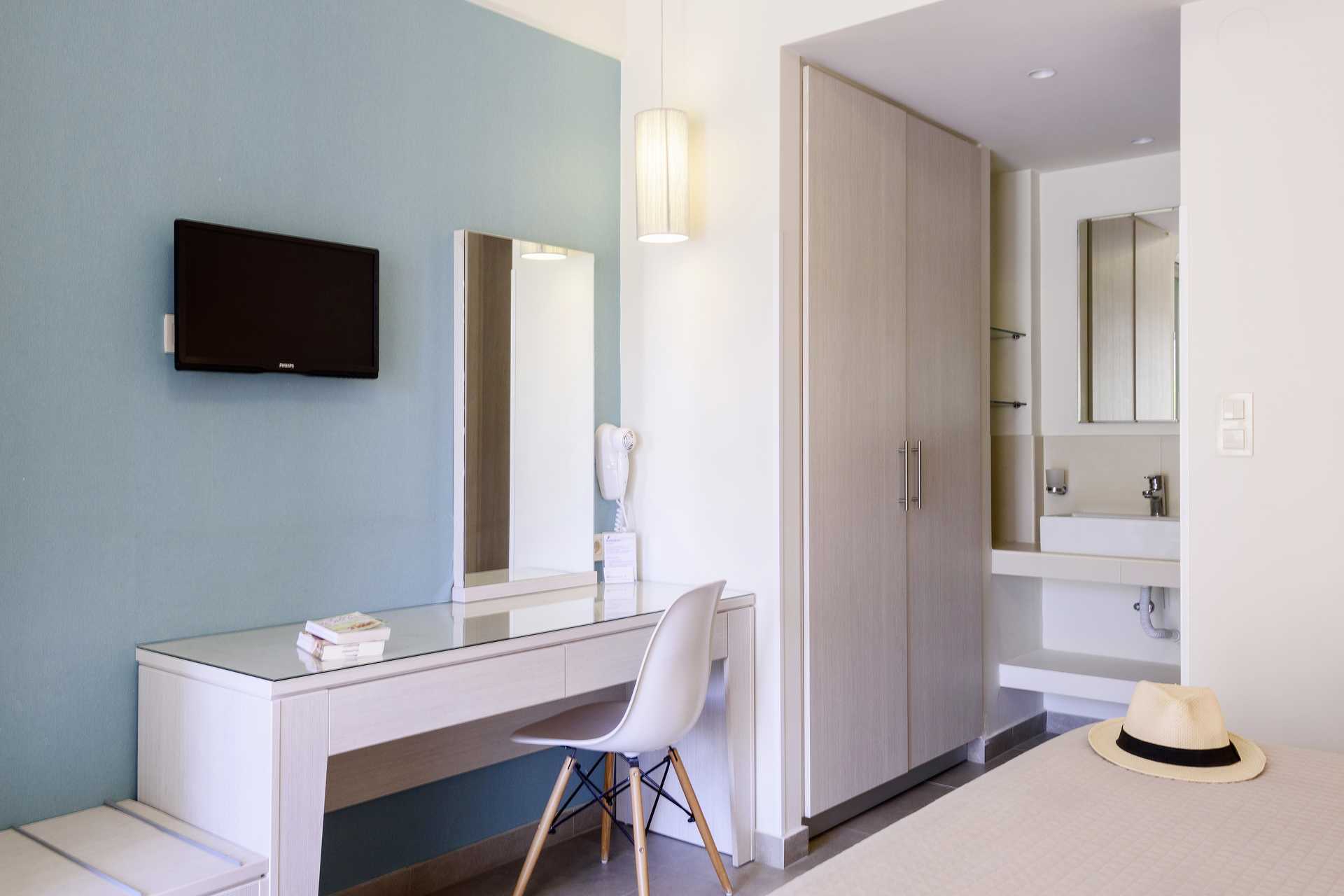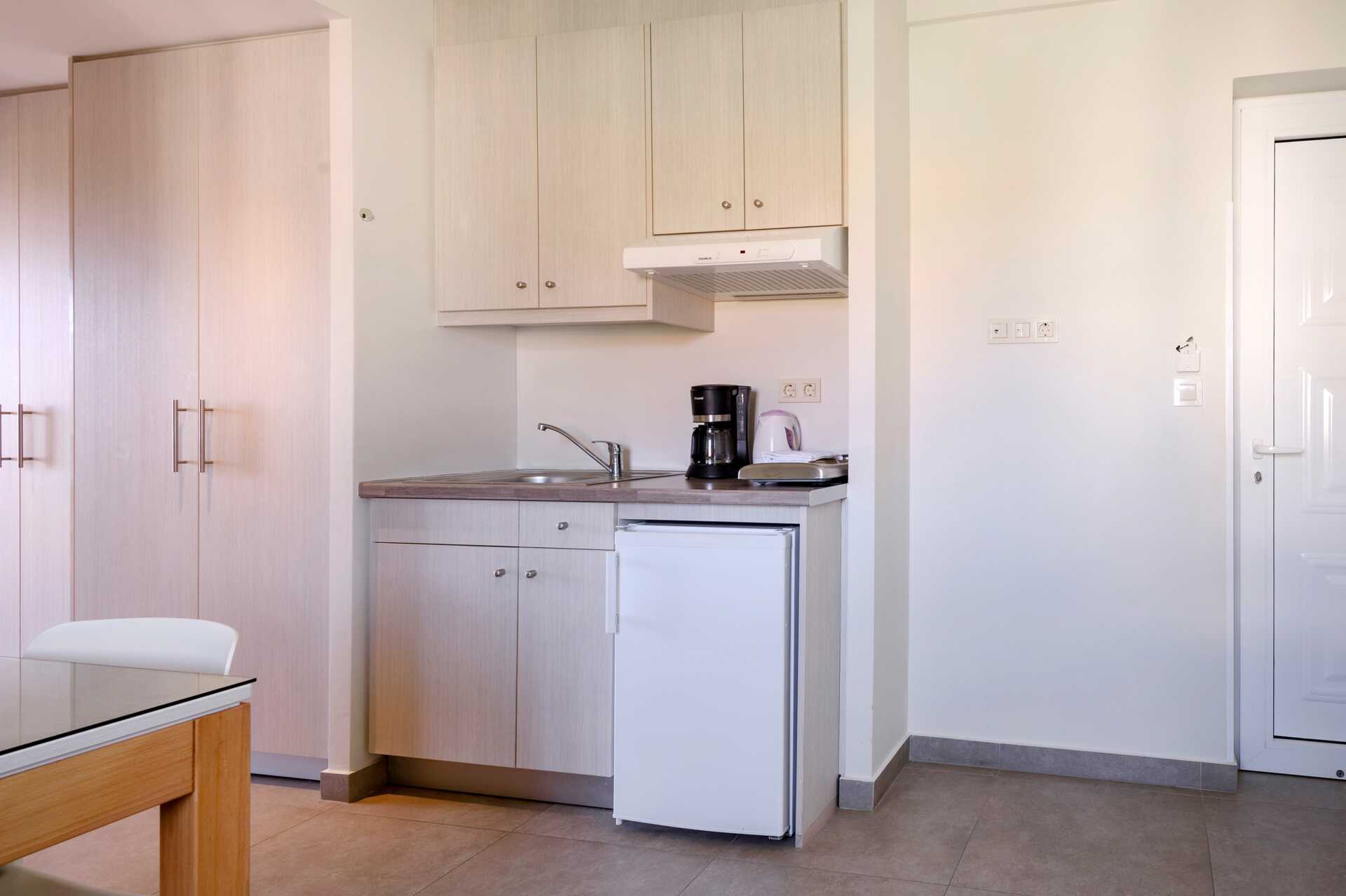 Yksiö, parvekkeella tai terassilla. Huoneistot sijaitsevat sekä päärakennuksessa että sivurakennuksessa, n. 250 metrin päässä. Yhdistetty makuuhuone ja minikeittiö. Parivuode tai kaksi yhden hengen sänkyä. Lisävuodemahdollisuus vuodesohvasta. Minikeittiössä jääkaappi, keittolevyt, kahvinkeitin, vedenkeitin ja yksinkertainen keittiövarustus. Maksuton wifi, ilmastointi ja tallelokero. Tv kansainvälisillä kanavilla. Hyttysverkot parvekkeen ovissa. Hiustenkuivain. Kylpyamme tai suihku ja wc. Siivous 7 krt/viikko.