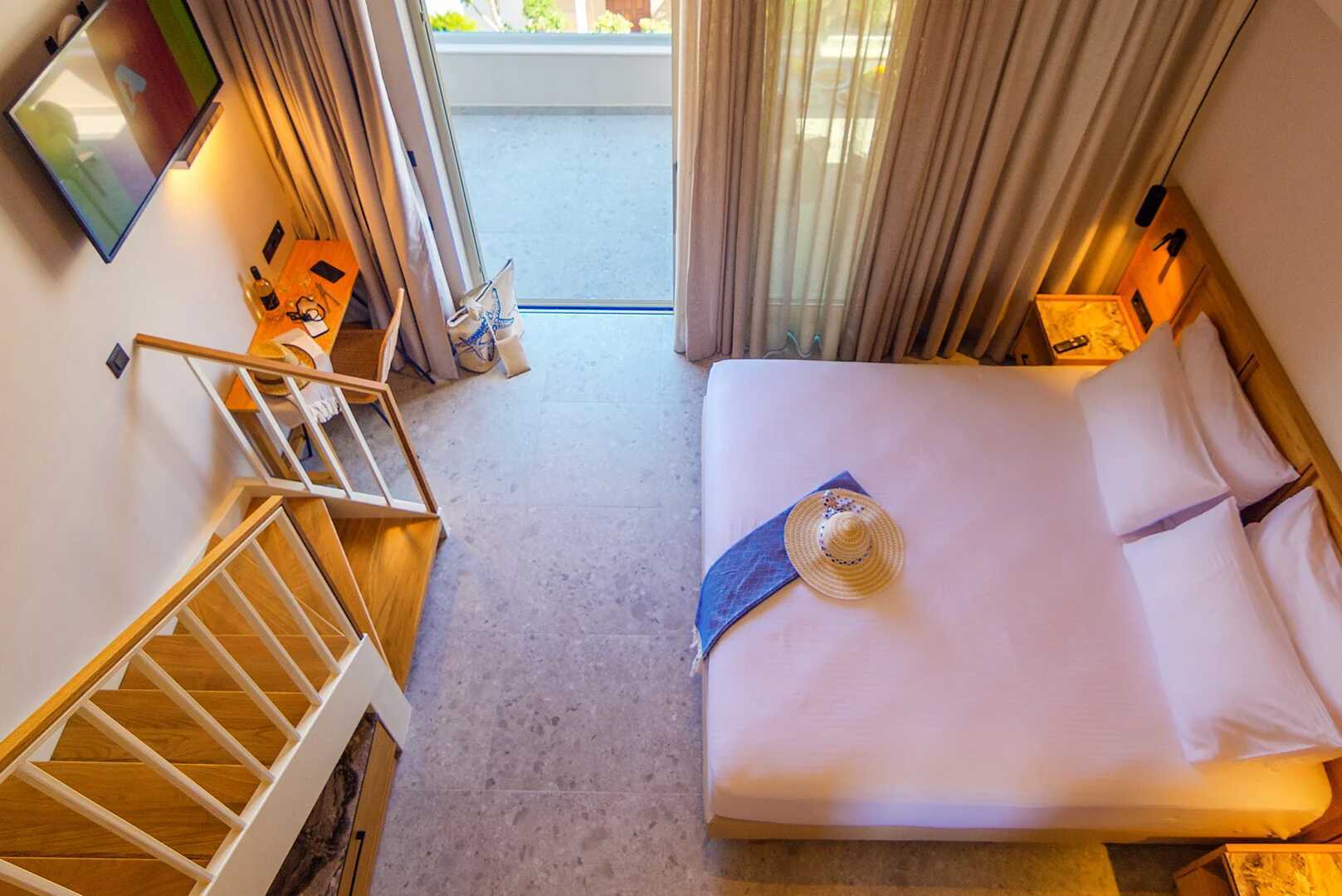 Kaksikerroksisia kahden hengen huoneita parvekkeella tai terassilla. Sisääntulokerroksessa on parivuode ja kylpyhuone, jossa hiustenkuivaaja, suihku ja wc. Yläkerrassa on makuuparvi, jossa on yhden hengen sänky. Maksuton wifi, ilmastointi ja tallelokero. Jääkaappi. Vedenkeitin. Tv kansainvälisillä kanavilla. Hiustenkuivain. Siivous 6 krt/viikko.