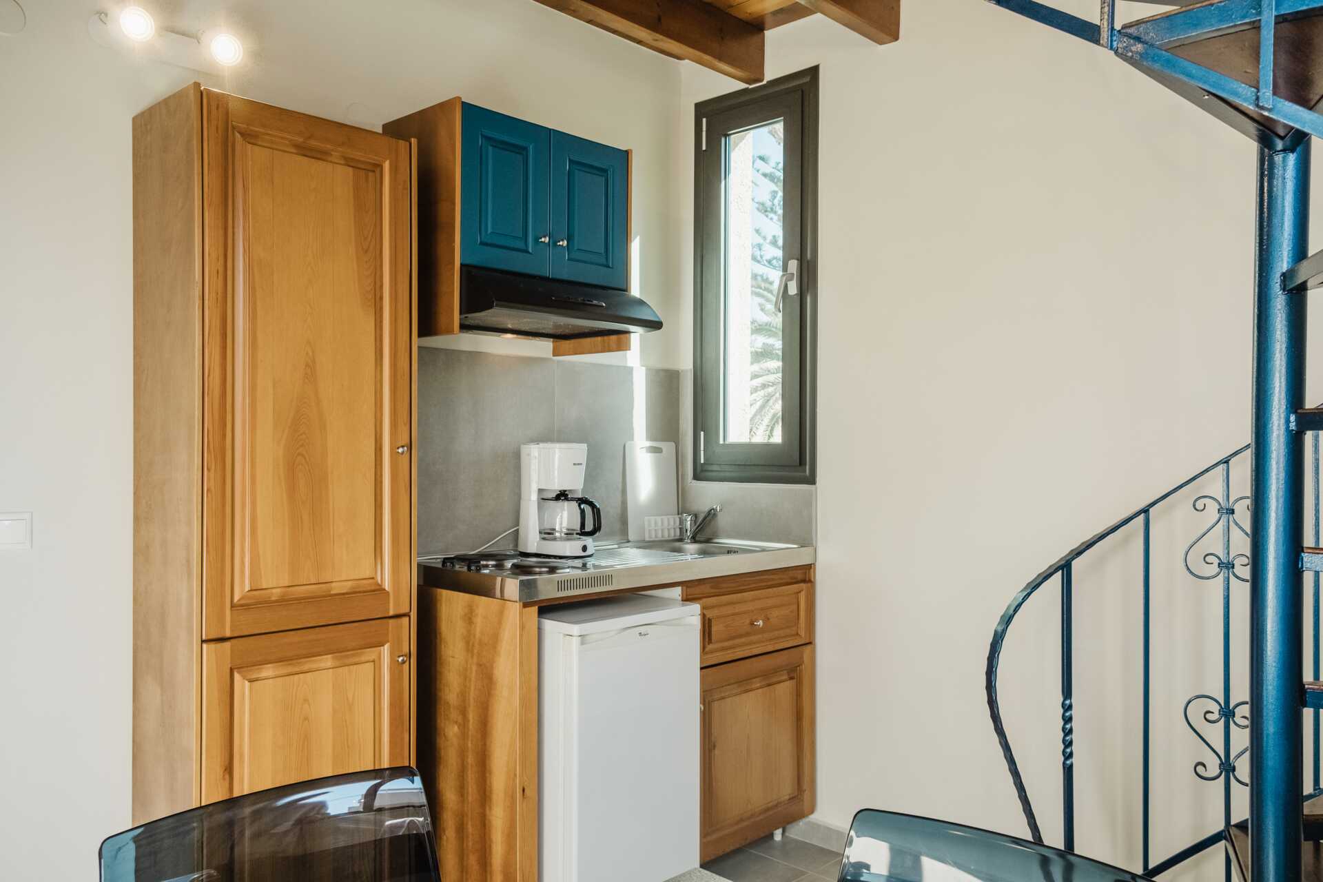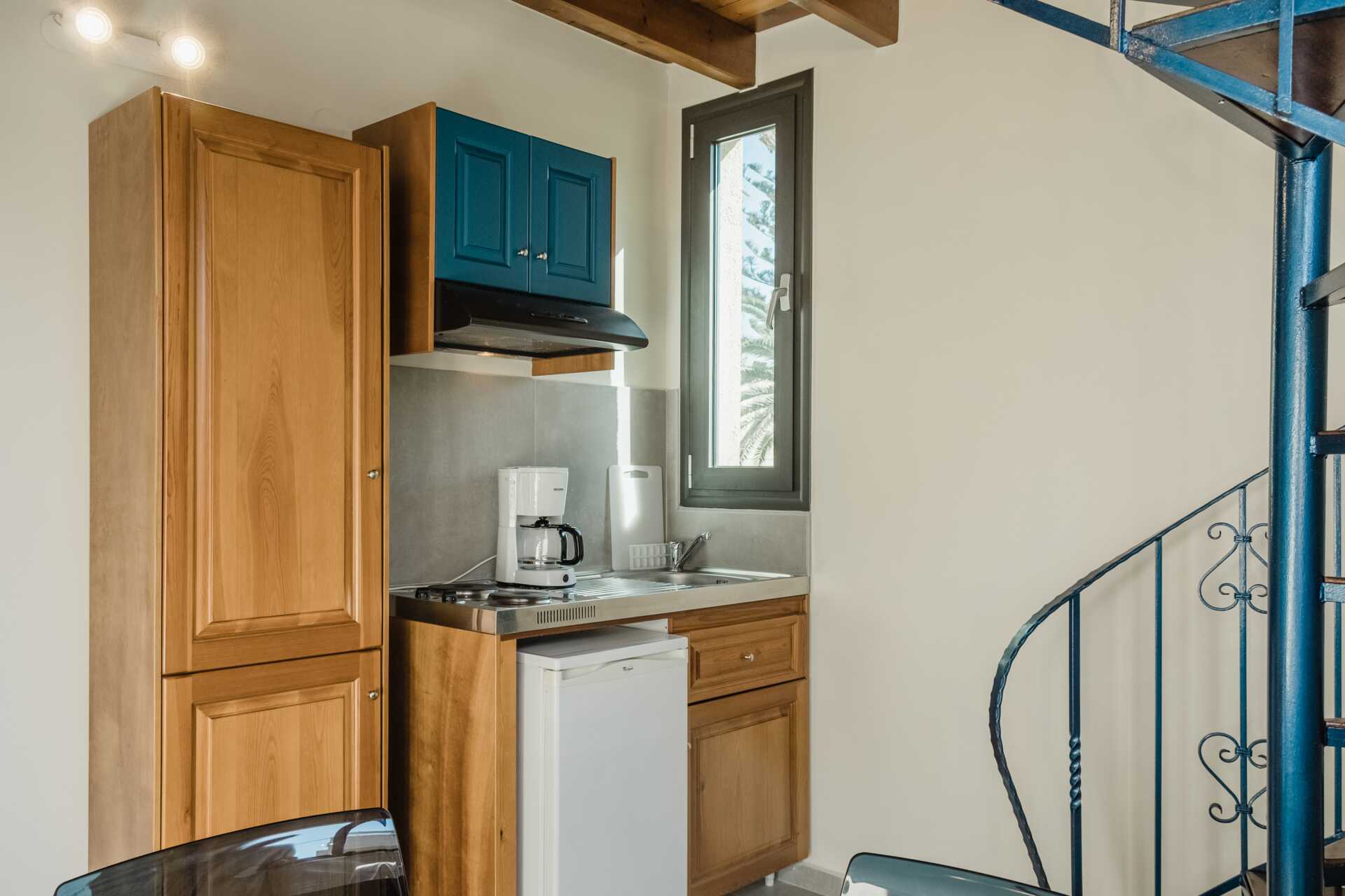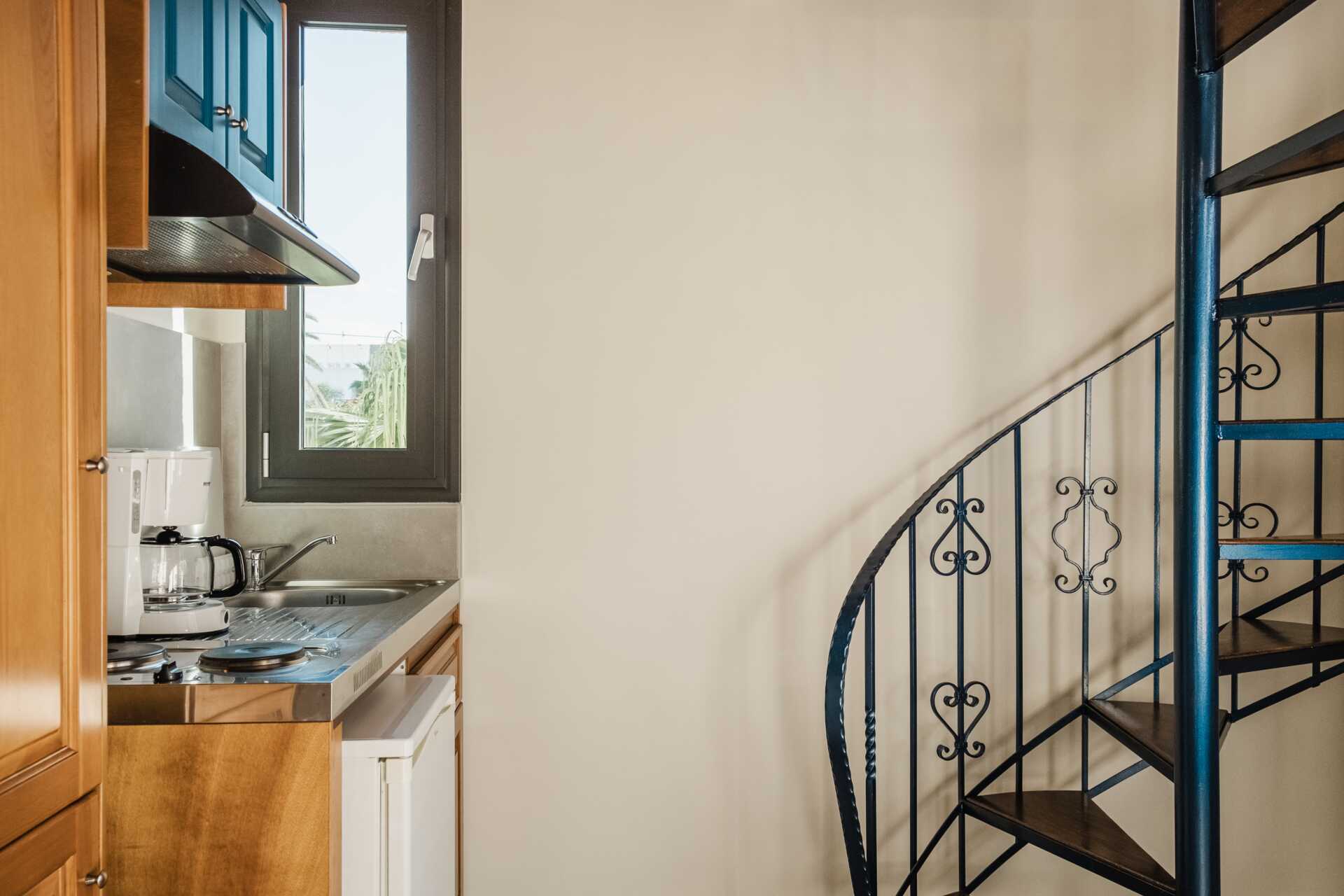 Parvekkeellinen kaksikerroksinen yksiö Huoneisto sijaitsee hotellin vanhemman osan toisessa kerroksessa. Sisäänkäyntikerroksessa on olohuone yhdistettynä minikeittiöön ja kylpyhuoneeseen. Makuuparvi, jossa kaksi erillistä sänkyä. Kapeat ja jyrkät kierreportaat johtavat makuuparvelle. Portaista ylös ja alas nouseminen voi olla vaikeaa pienille lapsille ja niille, joilla on tasapaino- ja/tai kävelyvaikeuksia. Minikeittiössä keittolevyt, jääkaappi, kahvinkeitin ja yksinkertainen keittiövarustus. Maksuton wifi, ilmastointi ja tallelokero. Tv kansainvälisillä kanavilla. Hiustenkuivain. Suihku ja wc. Siivous 6 krt/viikko.