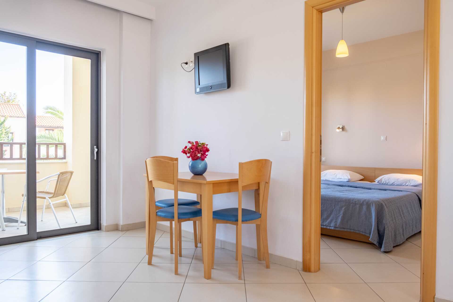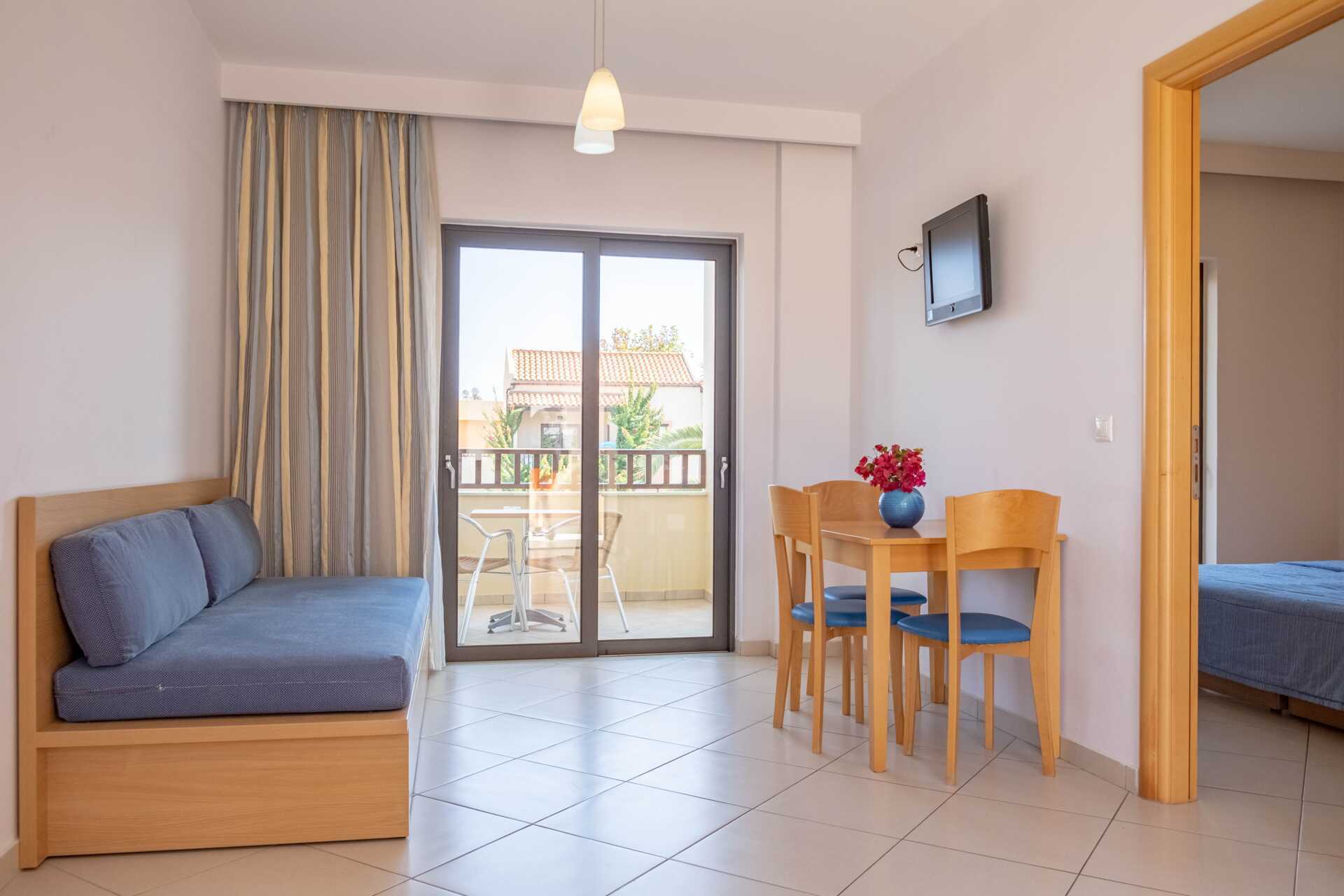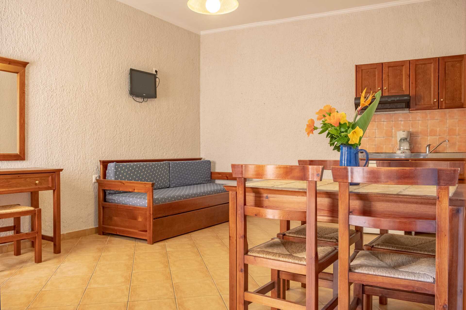 Kaksio parvekkeella, isolla parvekkeella, maaparvekkeella tai maaterassilla. Joissakin parvekkeissa ja maanparvekkeissa on näkymä uima-altaalle. Makuuhuone ja yhdistetty olohuone sekä minikeittiö. Kaksi yhden hengen sänkyä. Lisävuodemahdollisuus vuodesohvasta. Minikeittiössä keittolevyt, jääkaappi, vedenkeitin, kahvinkeitin ja yksinkertainen keittiövarustus. Maksuton wifi, ilmastointi ja tallelokero. Tv kansainvälisillä kanavilla. Hiustenkuivain. Kylpyhuoneessa suihku ja wc. Siivous 6 krt/viikko.