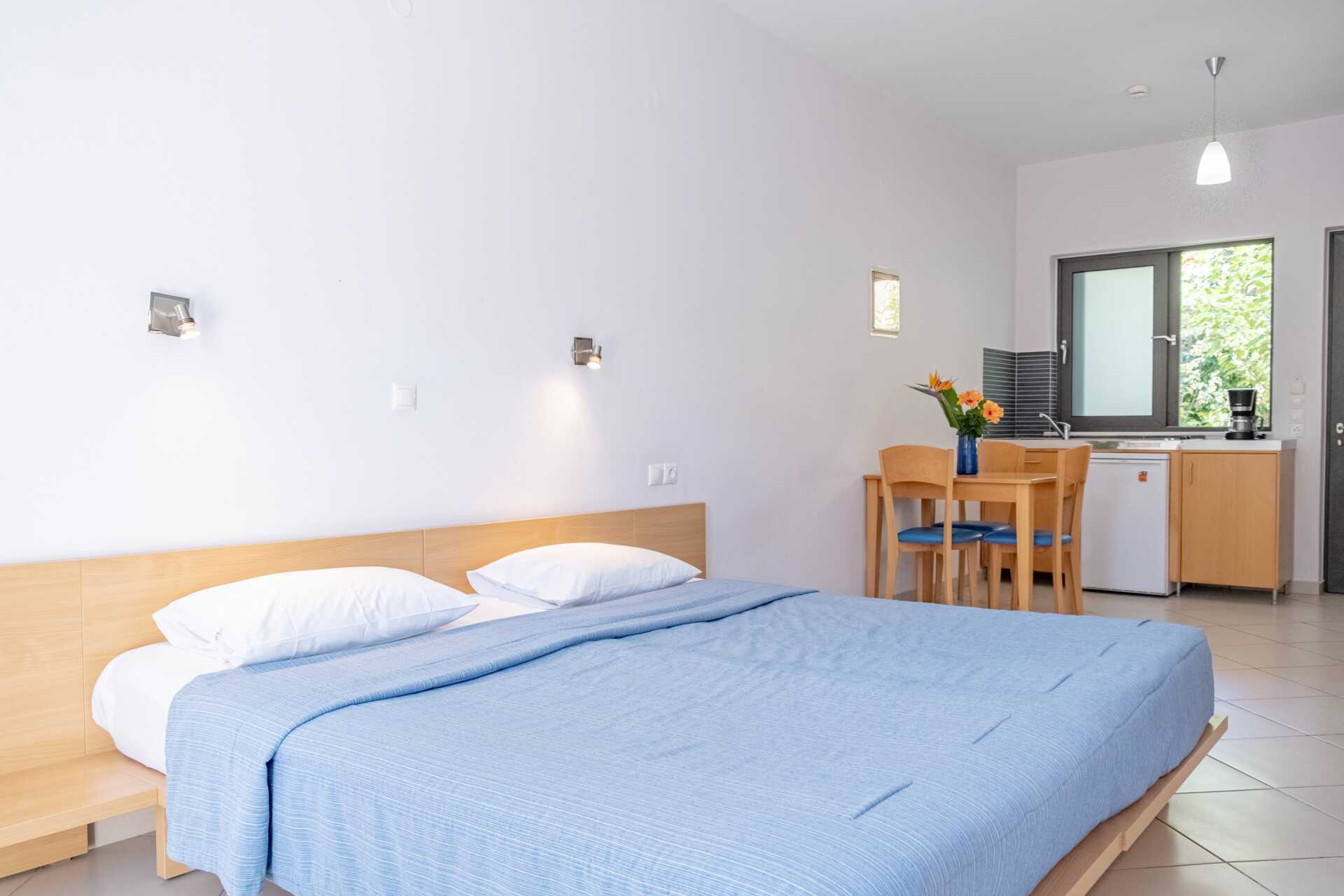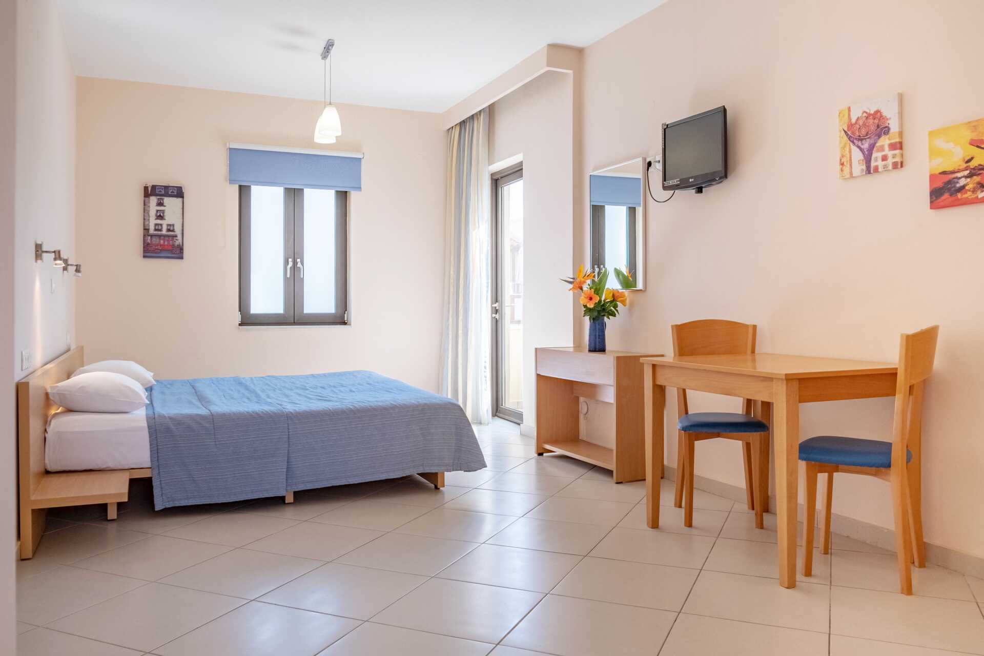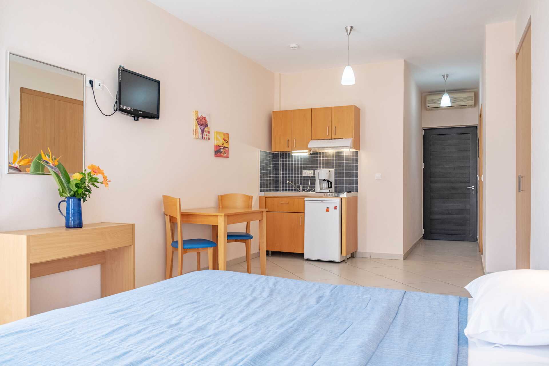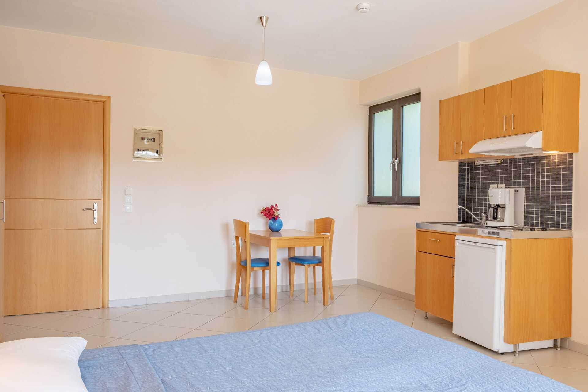 Yhden huoneen huoneisto, jossa on parveke, maaparveke tai maaterassi, osasta on näköala uima-altaalle. Portaat ylös terassille. Yläkerran asunnossa on yhteinen ulkotila. Yhdistetty makuuhuone ja minikeittiö. Parivuode tai kaksi yhden hengen sänkyä. Mahdollisuus saada lisävuode yhden hengen vuoteeseen tai kokoontaitettavaan sänkyyn. Minikeittiössä keittolevyt, jääkaappi, vedenkeitin, kahvinkeitin ja yksinkertainen keittiövarustus. Maksuton wifi, ilmastointi ja tallelokero. Tv kansainvälisillä kanavilla. Hiustenkuivain. Suihku ja wc. Siivous 6 krt/viikko.