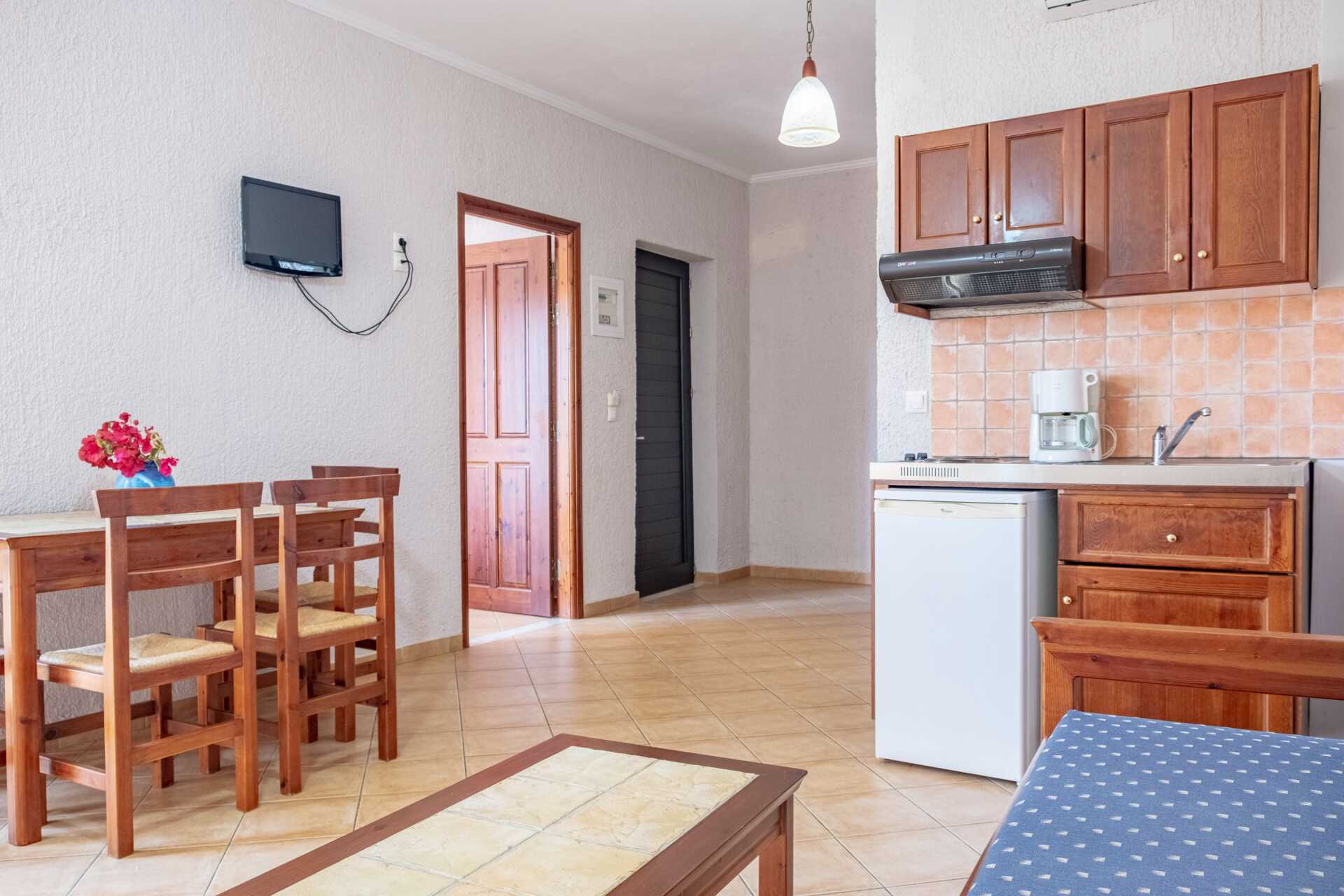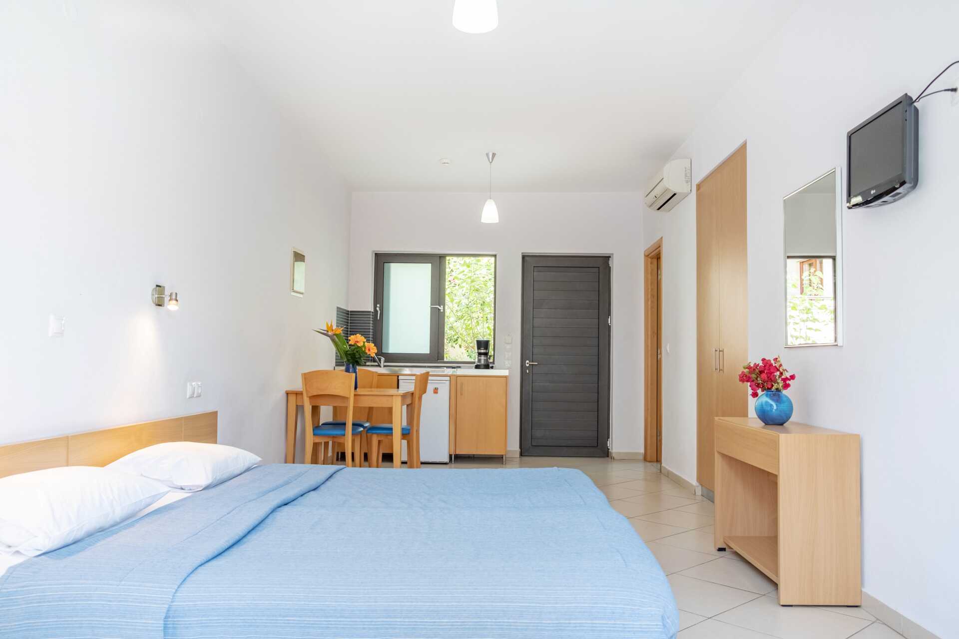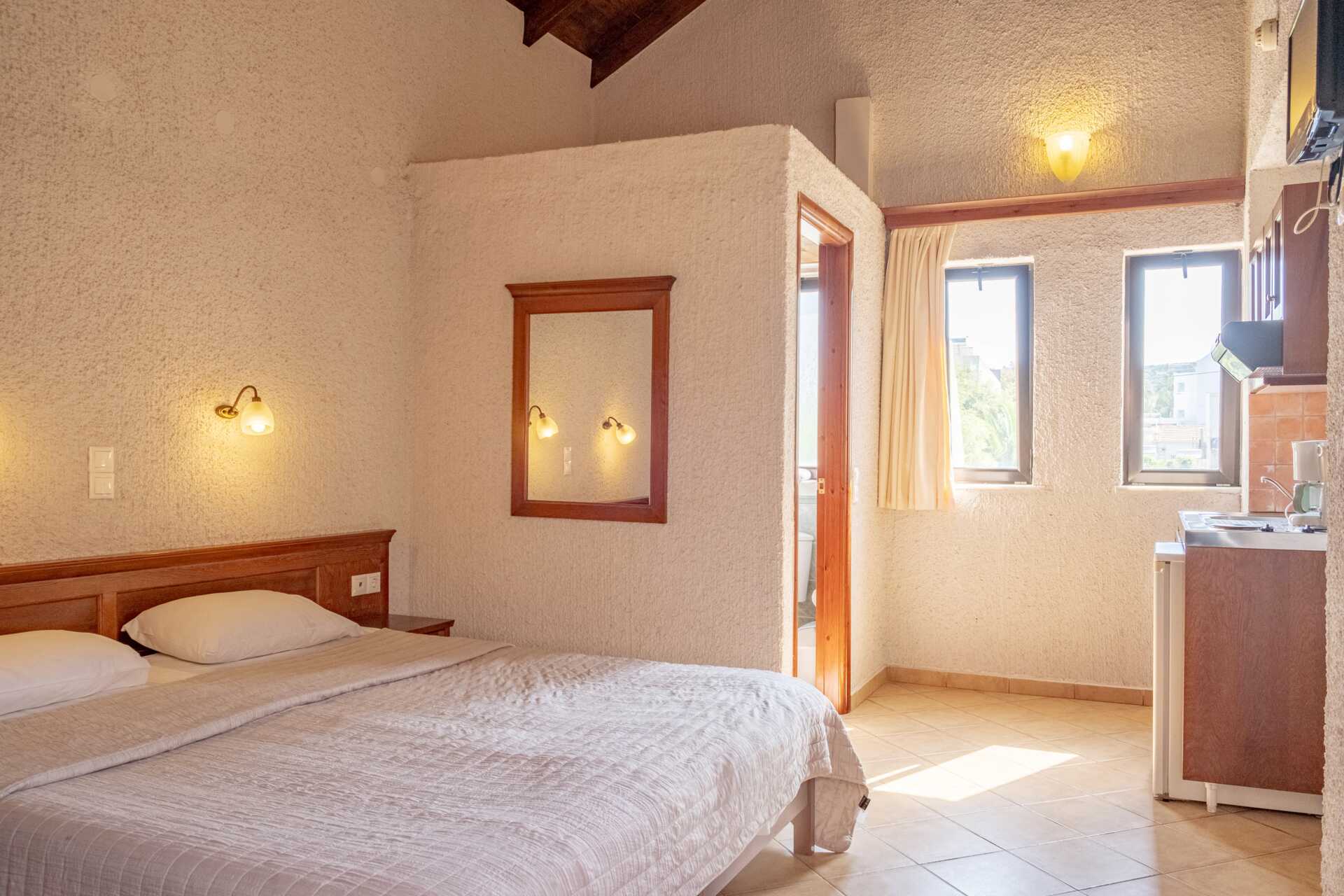 Yhden huoneen huoneisto, jossa on parveke, maaparveke tai maaterassi, osasta on näköala uima-altaalle. Portaat ylös terassille. Yläkerran asunnossa on yhteinen ulkotila. Yhdistetty makuuhuone ja minikeittiö. Parivuode tai kaksi yhden hengen sänkyä. Mahdollisuus saada lisävuode yhden hengen vuoteeseen tai kokoontaitettavaan sänkyyn. Minikeittiössä keittolevyt, jääkaappi, vedenkeitin, kahvinkeitin ja yksinkertainen keittiövarustus. Maksuton wifi, ilmastointi ja tallelokero. Tv kansainvälisillä kanavilla. Hiustenkuivain. Suihku ja wc. Siivous 6 krt/viikko.