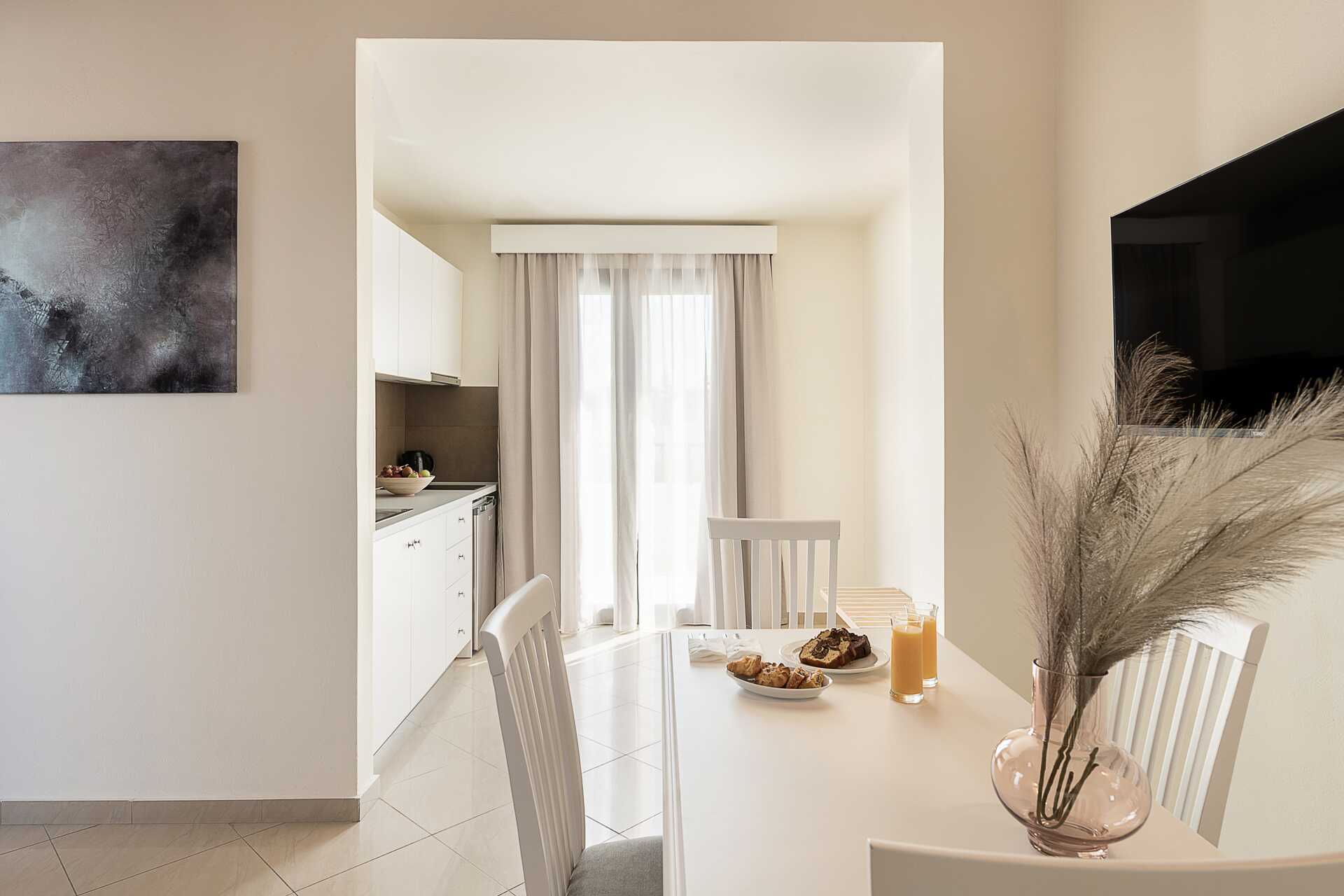 Kaksio parvekkeella tai terassilla. Makuuhuone sekä yhdistetty olohuone ja minikeittiö. Parivuode. Lisävuodemahdollisuus vuodesohvasta. Minikeittiössä on keittolevyt, jääkaappi ja yksinkertainen keittiövarustus. Maksuton wifi, ilmastointi ja tallelokero. Tv kansainvälisillä kanavilla. Silitysrauta ja -lauta. Kylpytakit ja tossut. Hiustenkuivain. Kylpyamme tai suihku ja wc. Siivous 7 krt/viikko.