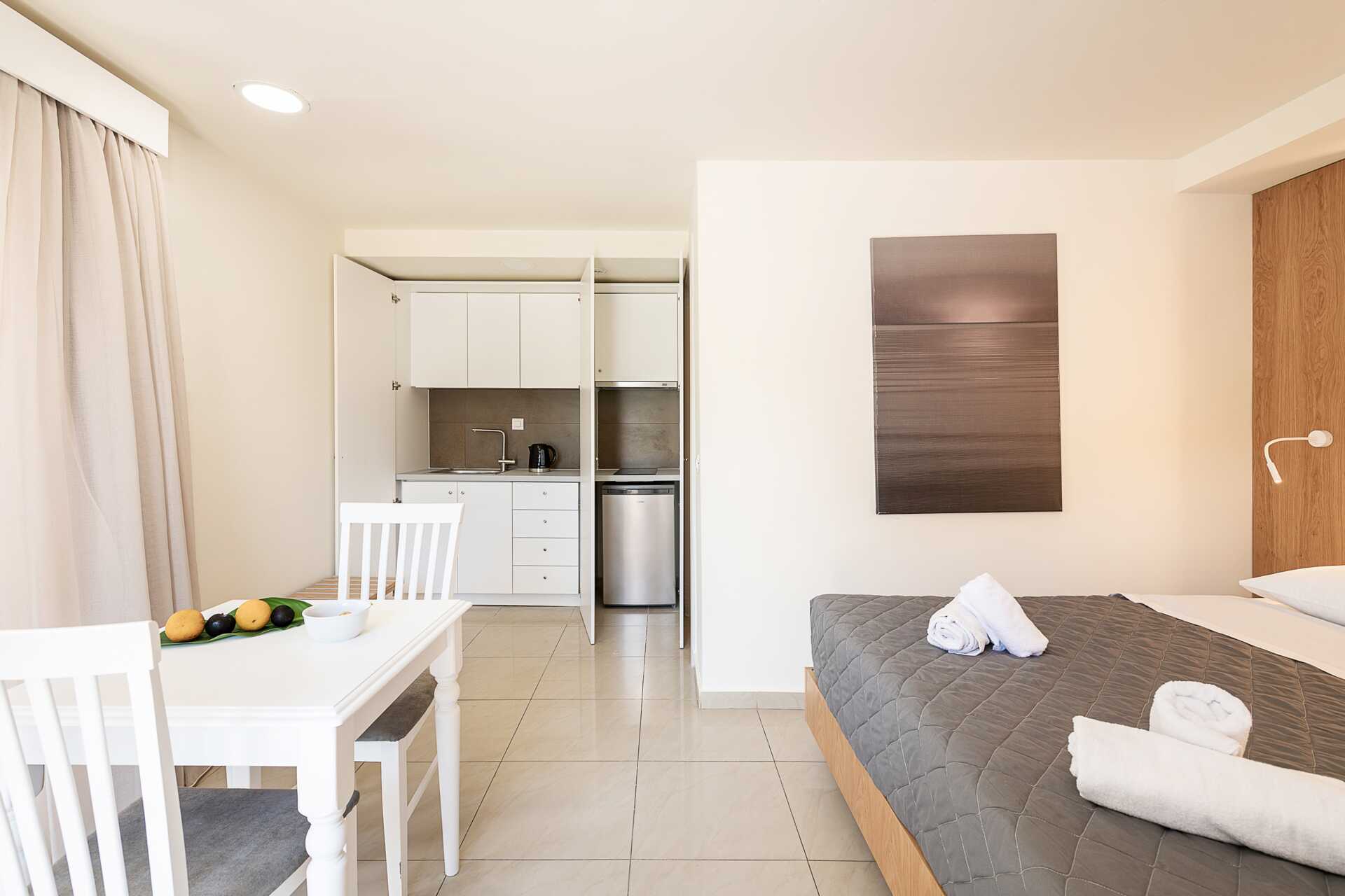 Yksiö, jossa parveke tai terassi. Yhdistetty makuuhuone ja minikeittiö. Parivuode. Lisävuodemahdollisuus vuodesohvasta. Minikeittiössä on keittolevyt, jääkaappi ja yksinkertainen keittiövarustus. Maksuton wifi, ilmastointi ja tallelokero. Tv kansainvälisillä kanavilla. Silitysrauta ja -lauta. Kylpytakit ja tossut. Hiustenkuivain. Kylpyhuoneessa kylpyamme tai suihku ja wc. Siivous 7 krt/viikko.
