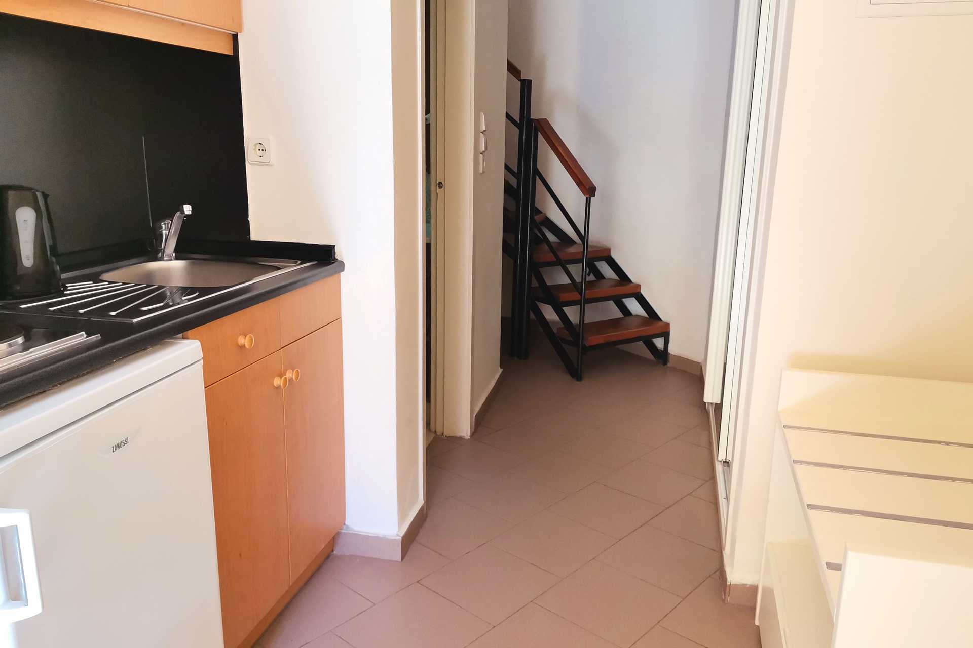 Kaksikerroksinen kaksio parvekkeella tai terassilla. Sisääntulokerroksessa on yhdistetty olohuone/minikeittiö ja kylpyhuone. Yläkerrassa on parvi, jossa kaksi erillistä sänkyä. Avoin pohjaratkaisu, jossa kerrosten välillä on kapea ja jyrkkä portaikko. Lisävuodemahdollisuus vuodesohvasta. Minikeittiössä keittolevyt, vedenkeitin, jääkaappi ja yksinkertainen keittiövarustus. Maksuton wifi, tallelokero ja ilmastointi - ilmastointi on vain yläkerrassa. Hiustenkuivain. Suihku ja wc. Siivous 7 krt/viikko.