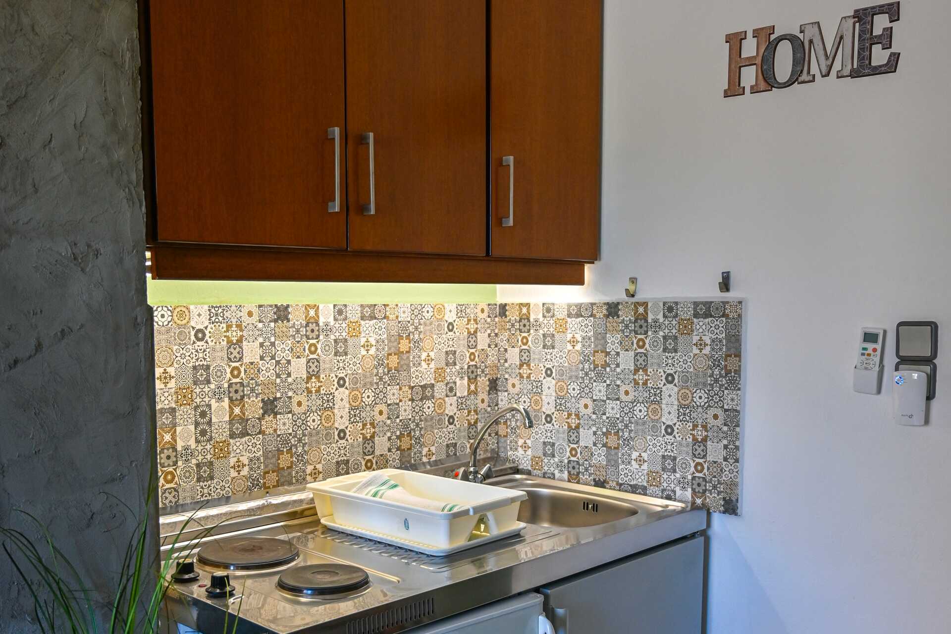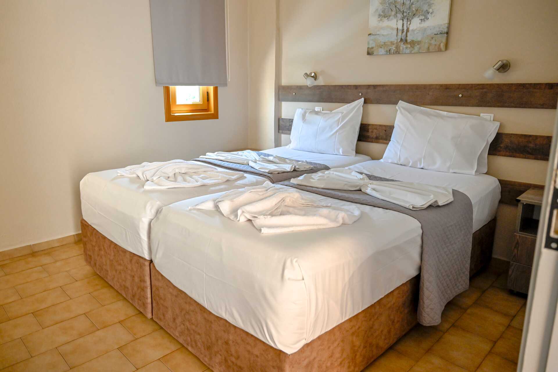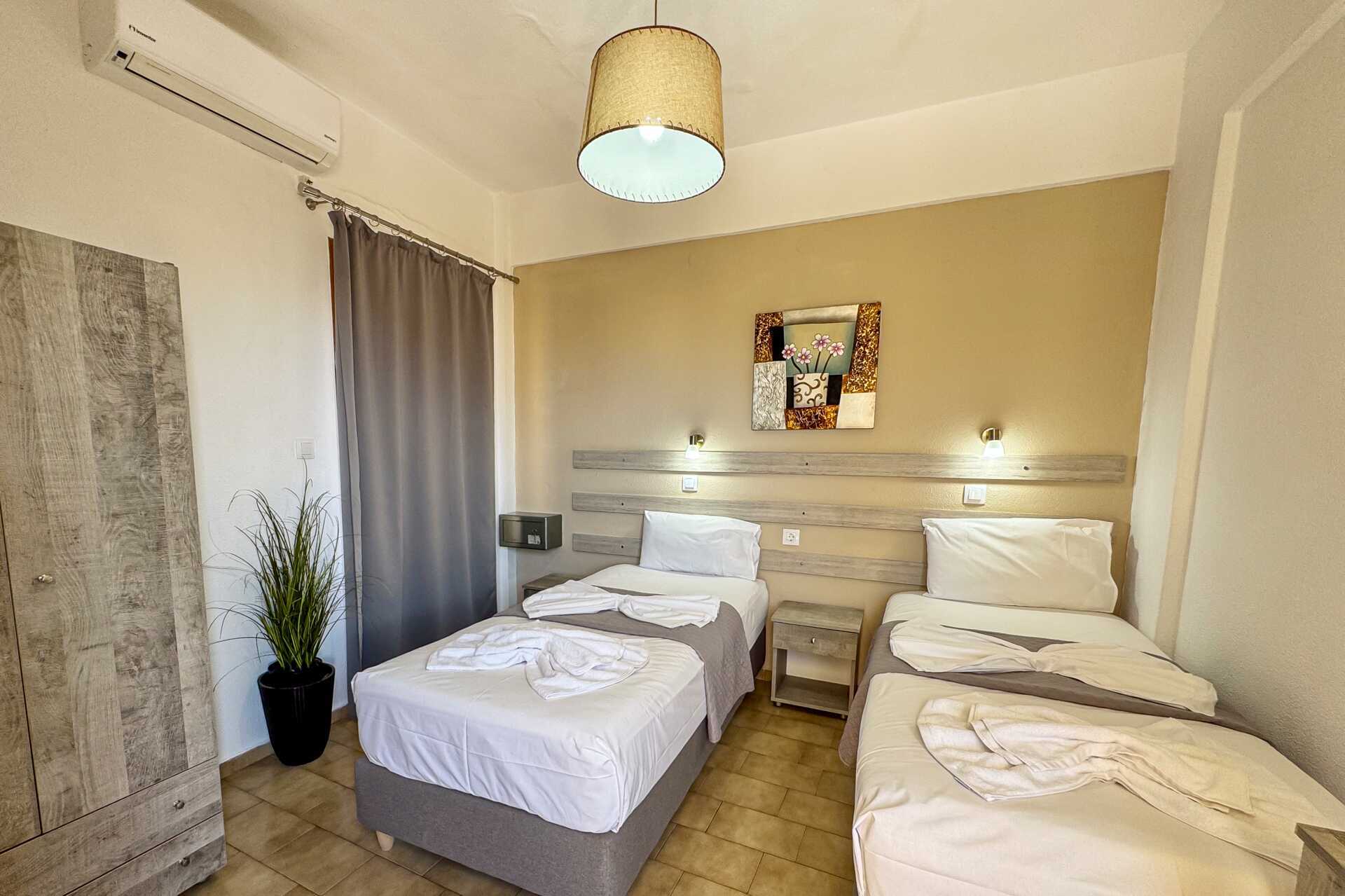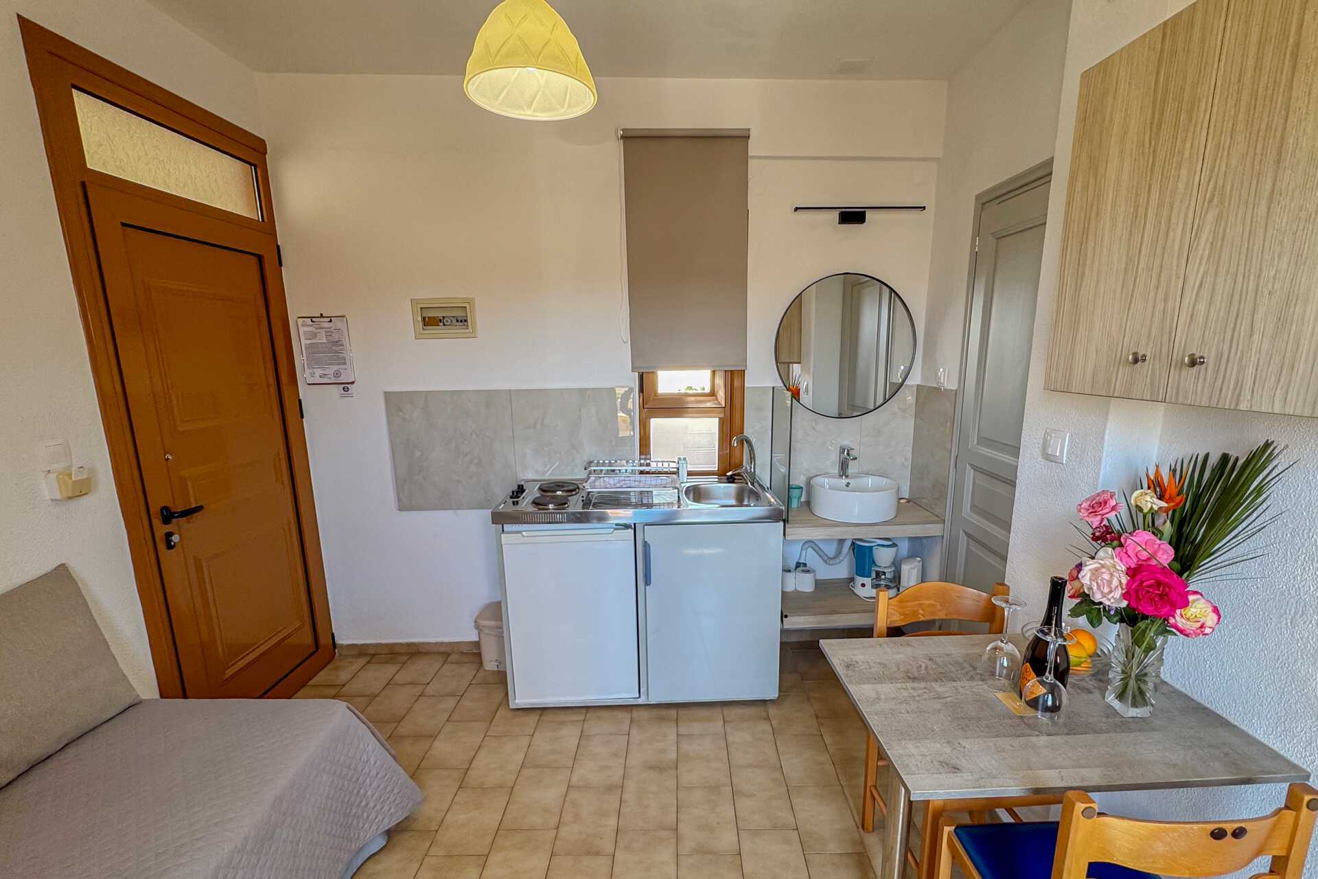 Yksiössä on parveke. Makuuhuone yhdistetty minikeittiöön. Kaksi erillistä sänkyä. Minikeittiössä jääkaappi, kahvinkeitin, voileipägrilli, keittolevyt ja yksinkertainen keittiövarusutus. Maksuton wifi, ilmastointi ja tallelokero. Tv paikallisilla kanavilla. Hiustenkuivain. Pieni kylpyhuone jossa suihku ja wc. Siivous 6 krt/viikko.