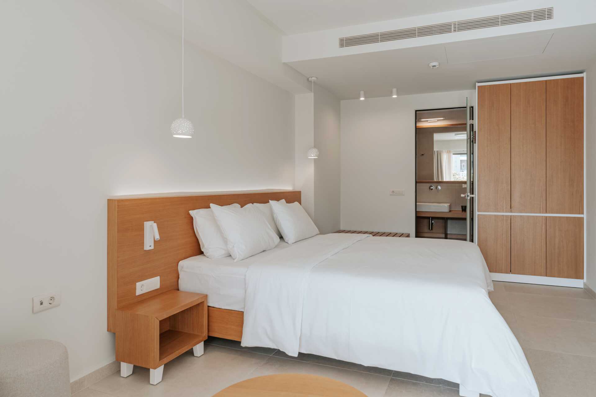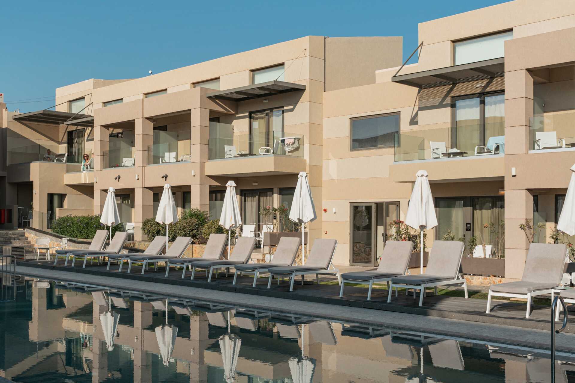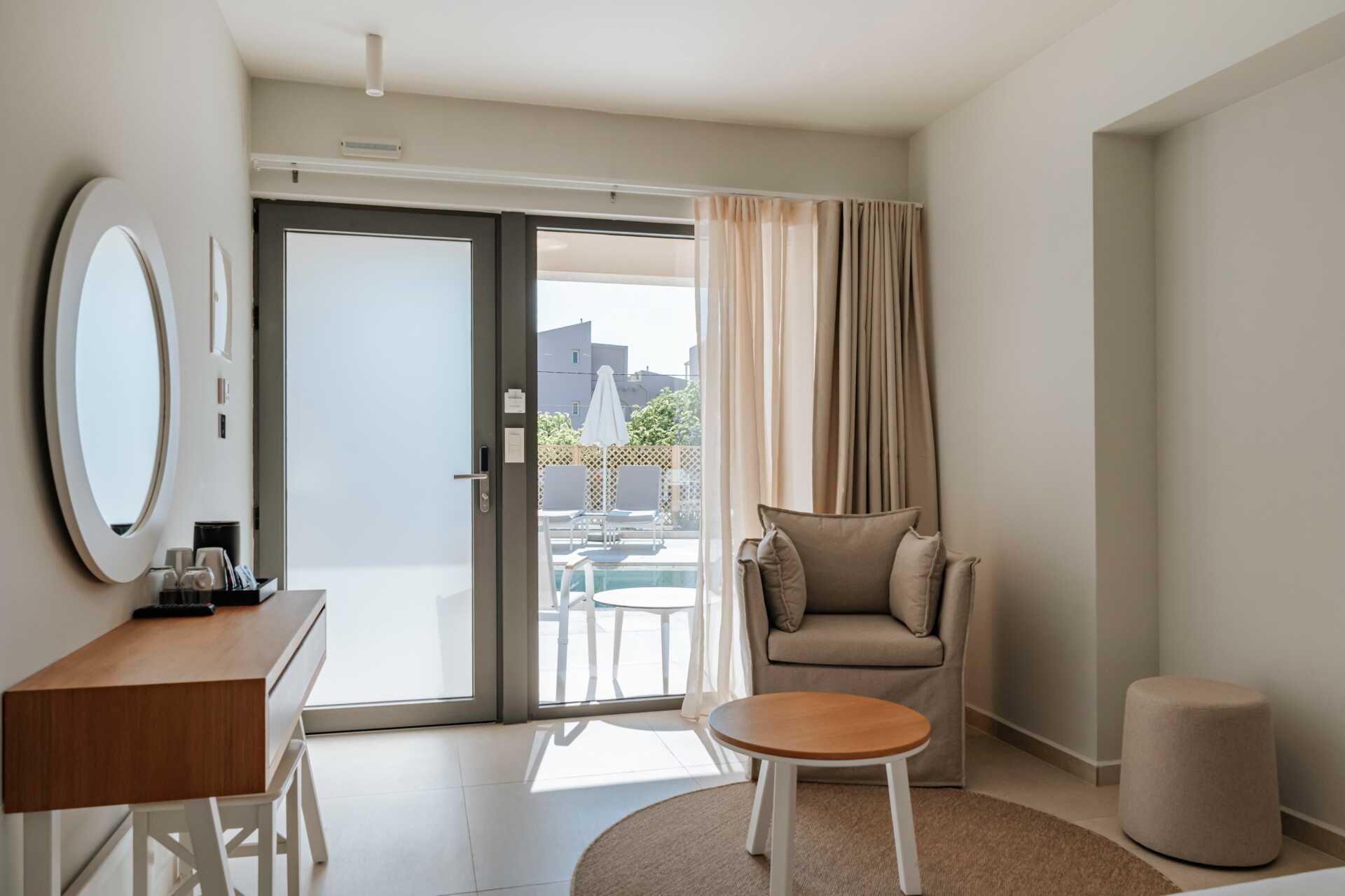 Kahden hengen huone, josta on pääsy jaetulle uima-altaalle. Parivuode tai kaksi yhden hengen sänkyä. Joissakin huoneissa on mahdollisuus lisävuoteeseen kolmannelle henkilölle. Maksuton wifi, ilmastointi ja tallelokero. Jääkaappi, joka voidaan täyttää minibaarina ja on silloin lisämaksullinen. Vedenkeitin. Tv kansainvälisillä kanavilla. Kylpyhuoneessa suihku ja wc. Siivous 6 krt/viikko.