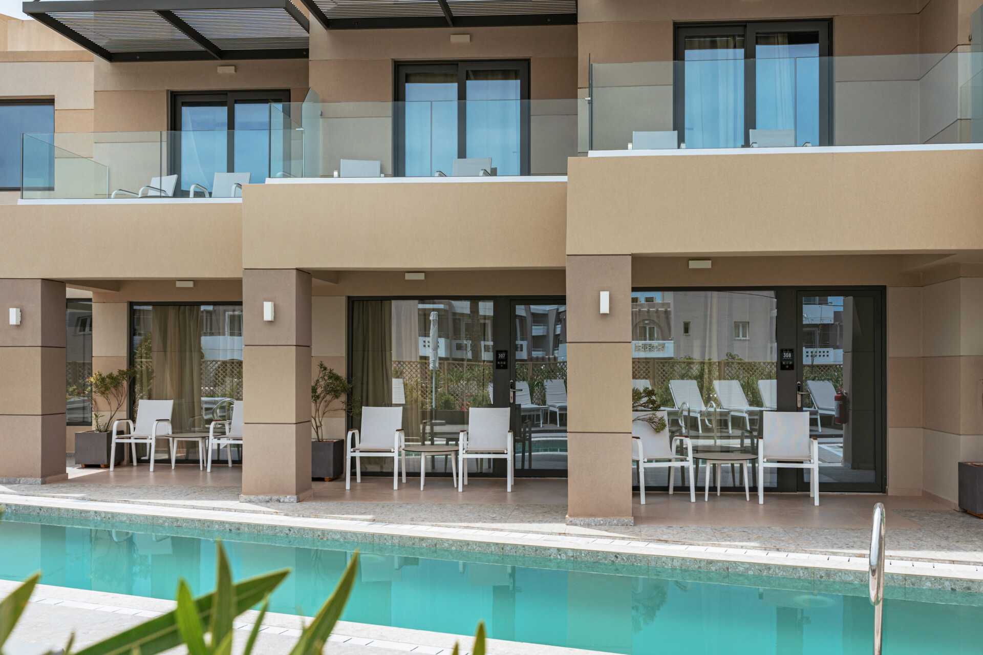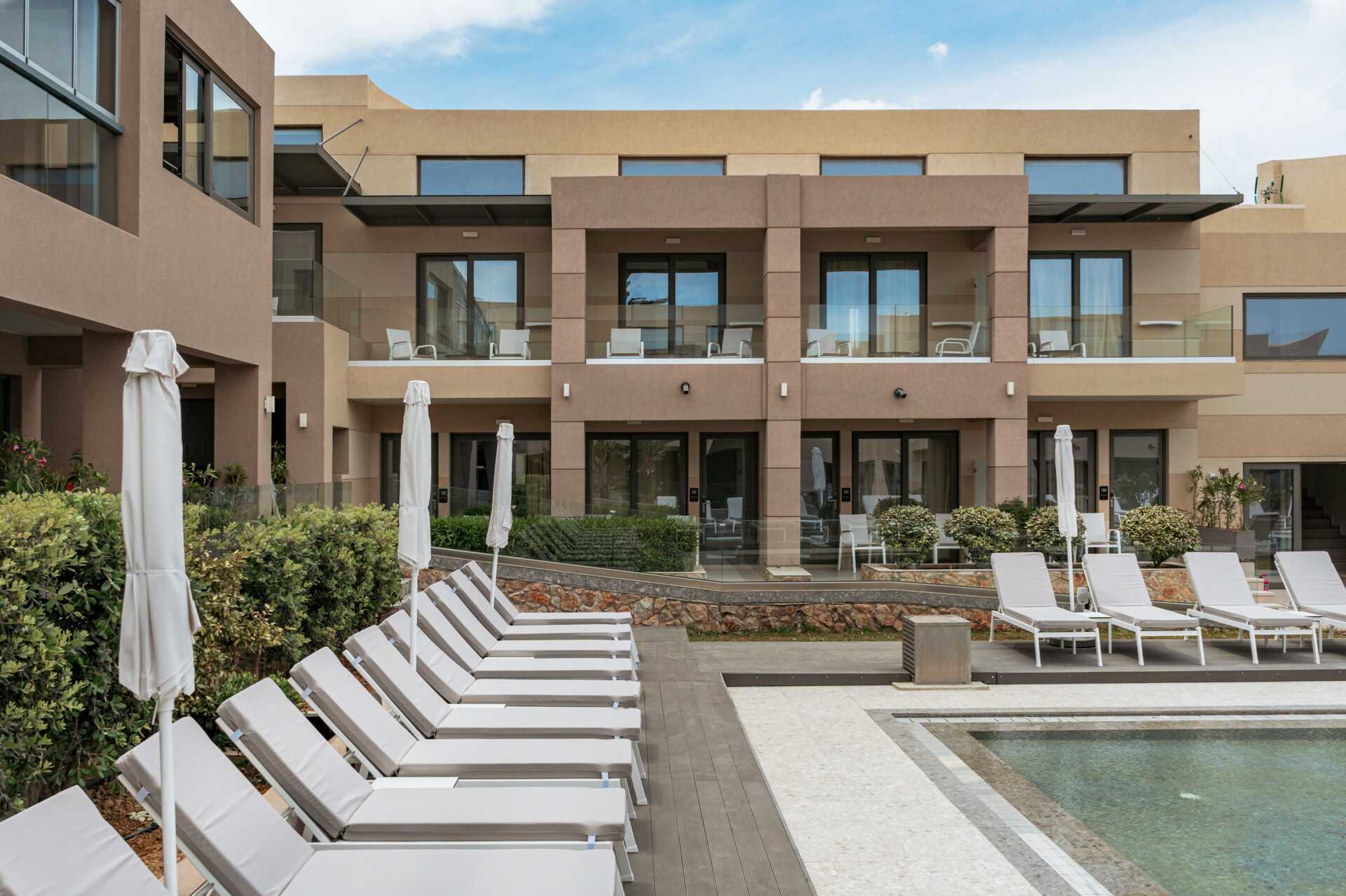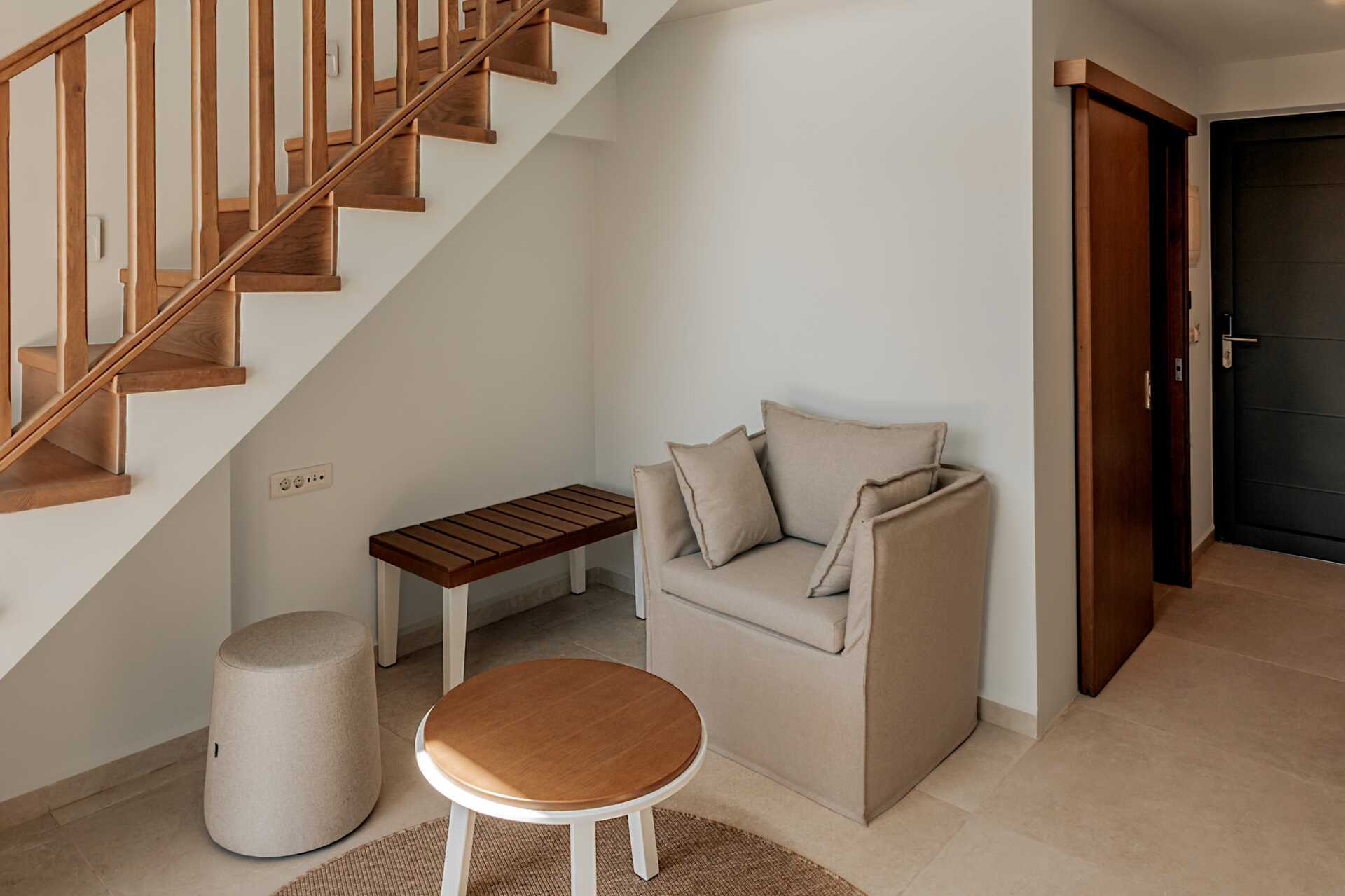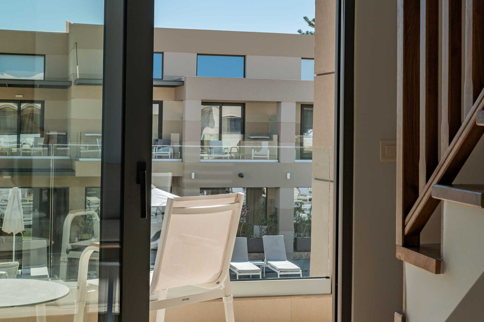 Kaksikerroksinen kahden hengen huone parvekella, osa merinäköalalla tai allasnäköalalla ja suuri parveke. Huone on pohjaratkaisultaan avoin. Pohjakerroksessa on kylpyhuone ja pieni olohuone. Yläkerrassa on makuuparvi tai makuuhuone, jossa parivuode tai kaksi erillistä sänkyä. Wifi, ilmastointi ja tallelokero sisältyvät hintaan. Jääkaappi, joka voidaan täyttää minibaarina ja on silloin lisämaksullinen. Vedenkeitin. Tv kansainvälisillä kanavilla. Kylpyhuoneessa suihku ja wc. Siivous 6 krt/viikko.