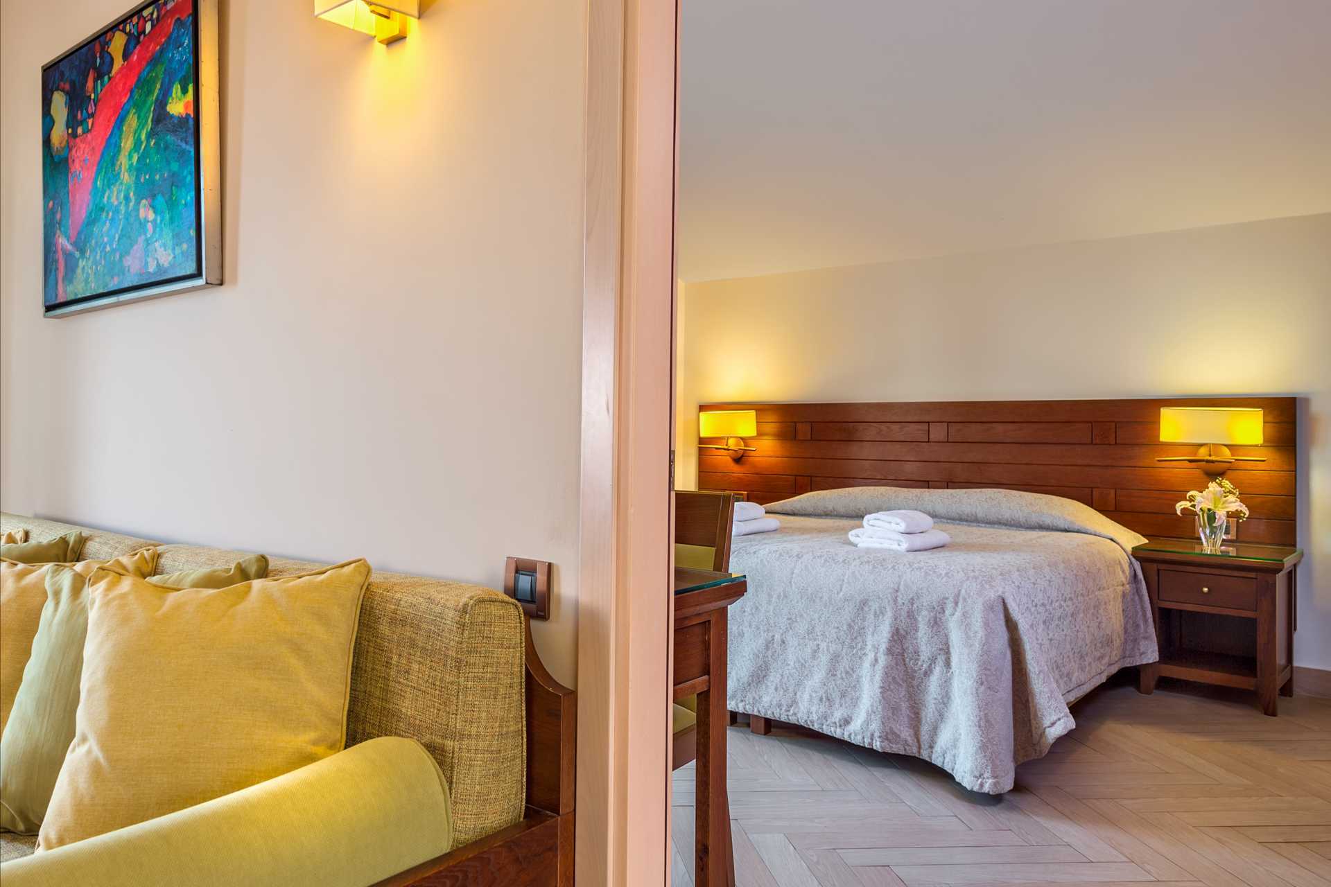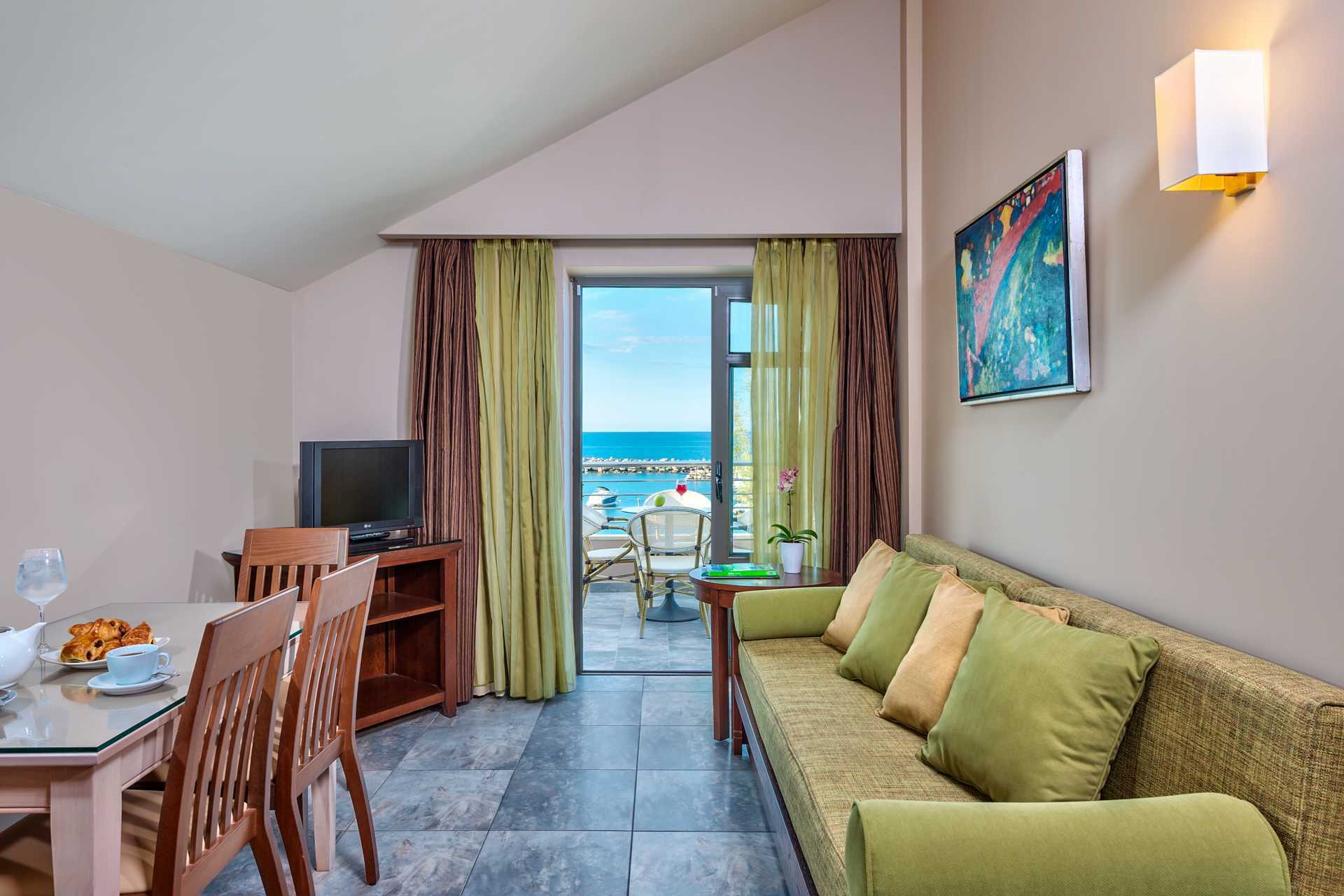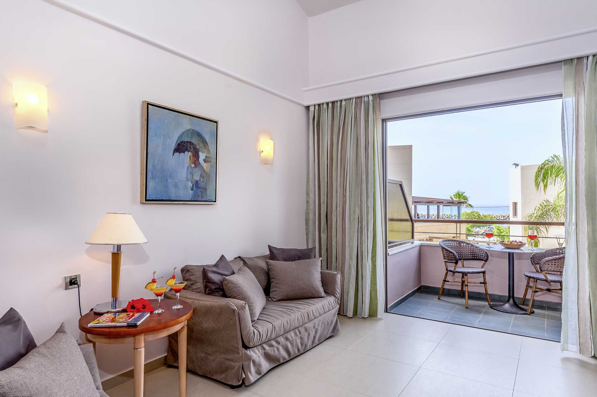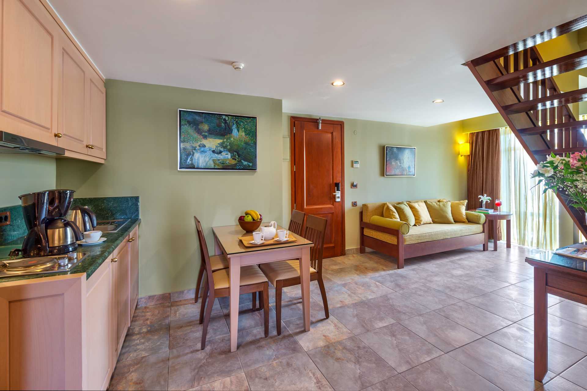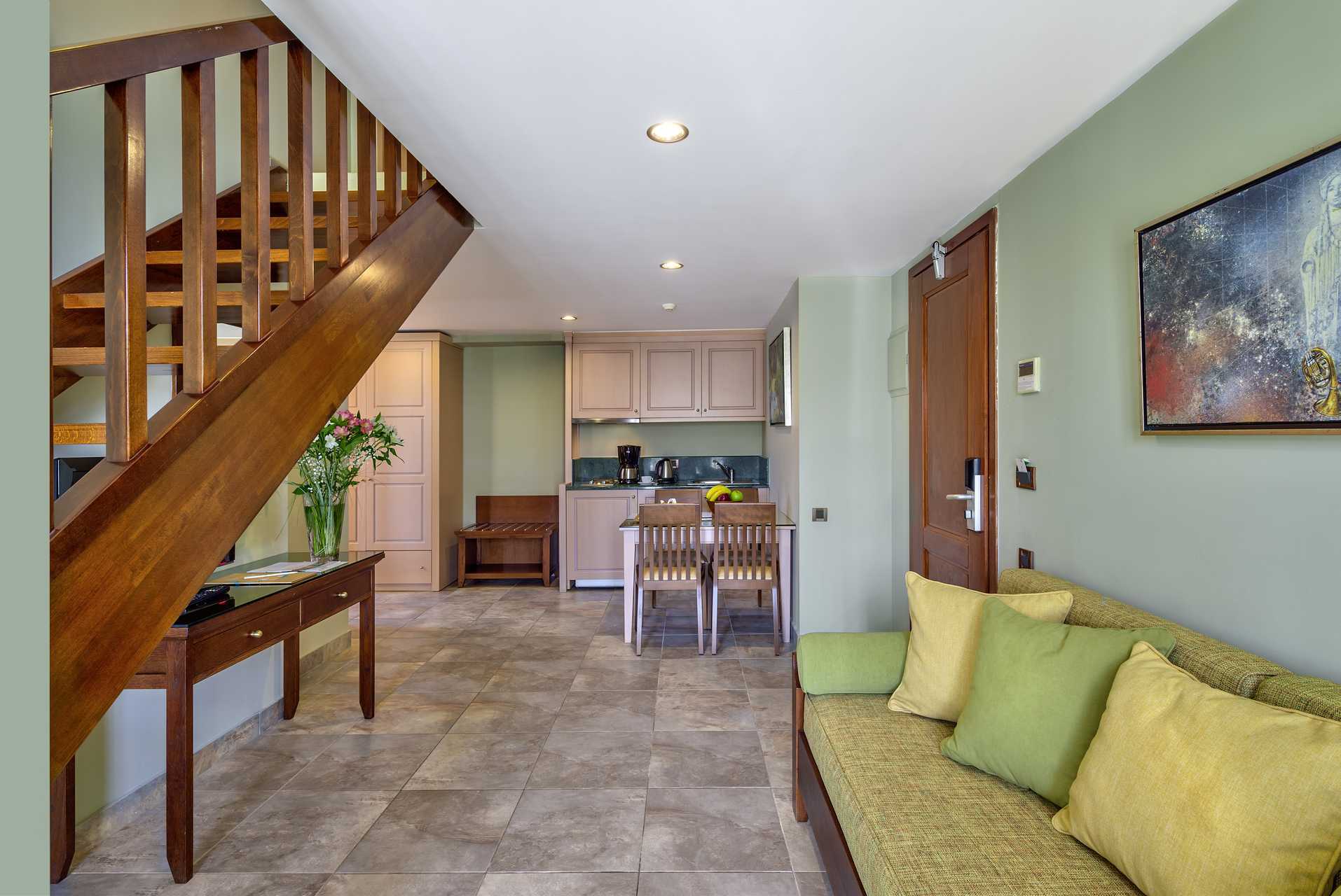 Kaksikerroksinen kahden hengen huone parvekkeella tai terassilla ja näköalalla uima-altaalle. Sisääntulokerroksessa on lisävuodemahdollisuus kahdessa vuodesohvasta ja kylpyhuone. Yläkerrassa on makuuparvi tai makuuhuone, jossa parivuode tai kaksi erillistä sänkyä. Makuuparven ja huoneen välissä liukuovi. Maksuton wifi ja ilmastointi. Tallelokero lisämaksusta. Jääkaappi. Tv kansainvälisillä kanavilla. Suihku ja wc. Siivous 7 krt/viikko. Alle 2-vuotiaat lapset lasketaan lisävuoteella majoittuviksi henkilöiksi.