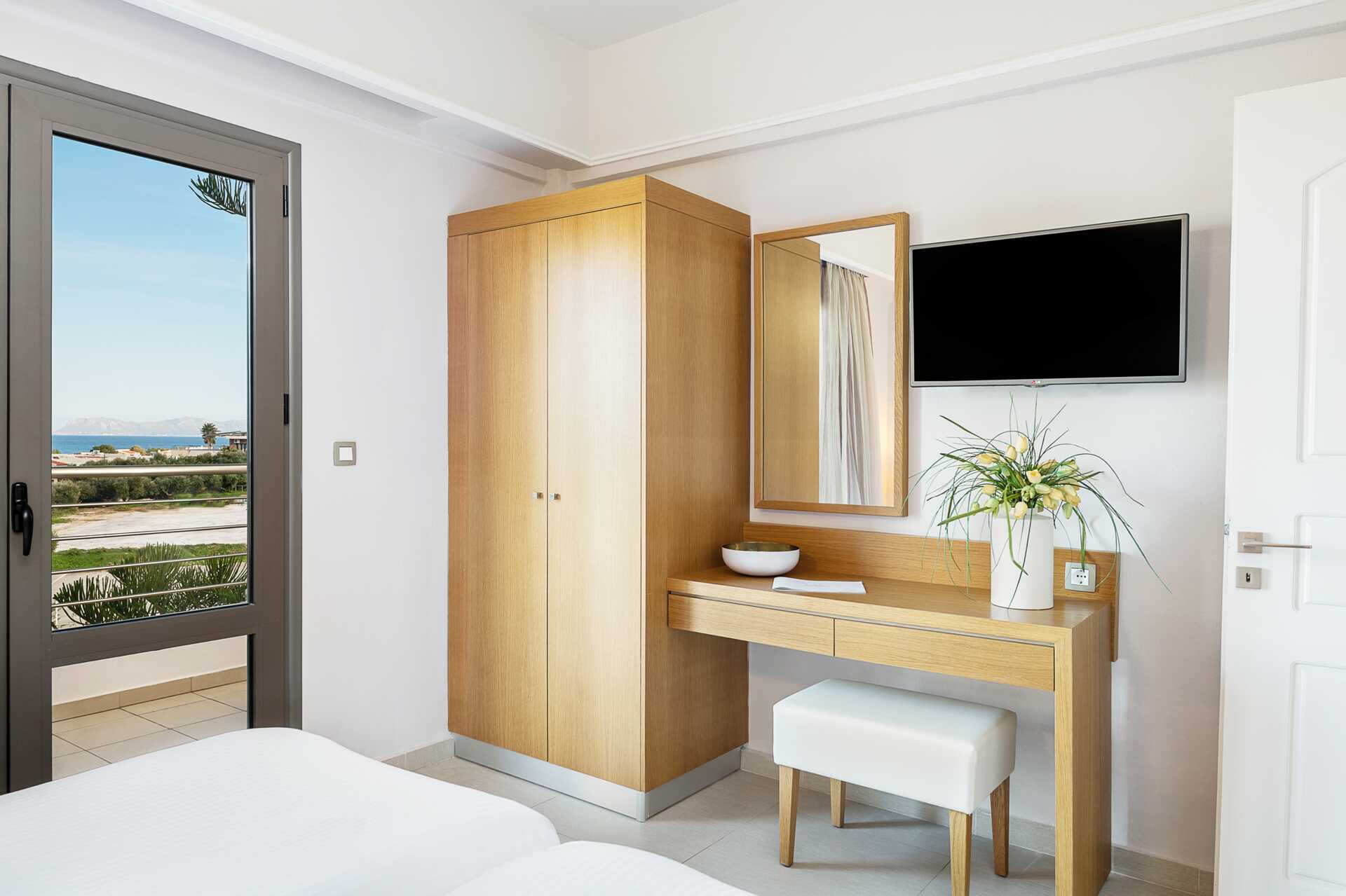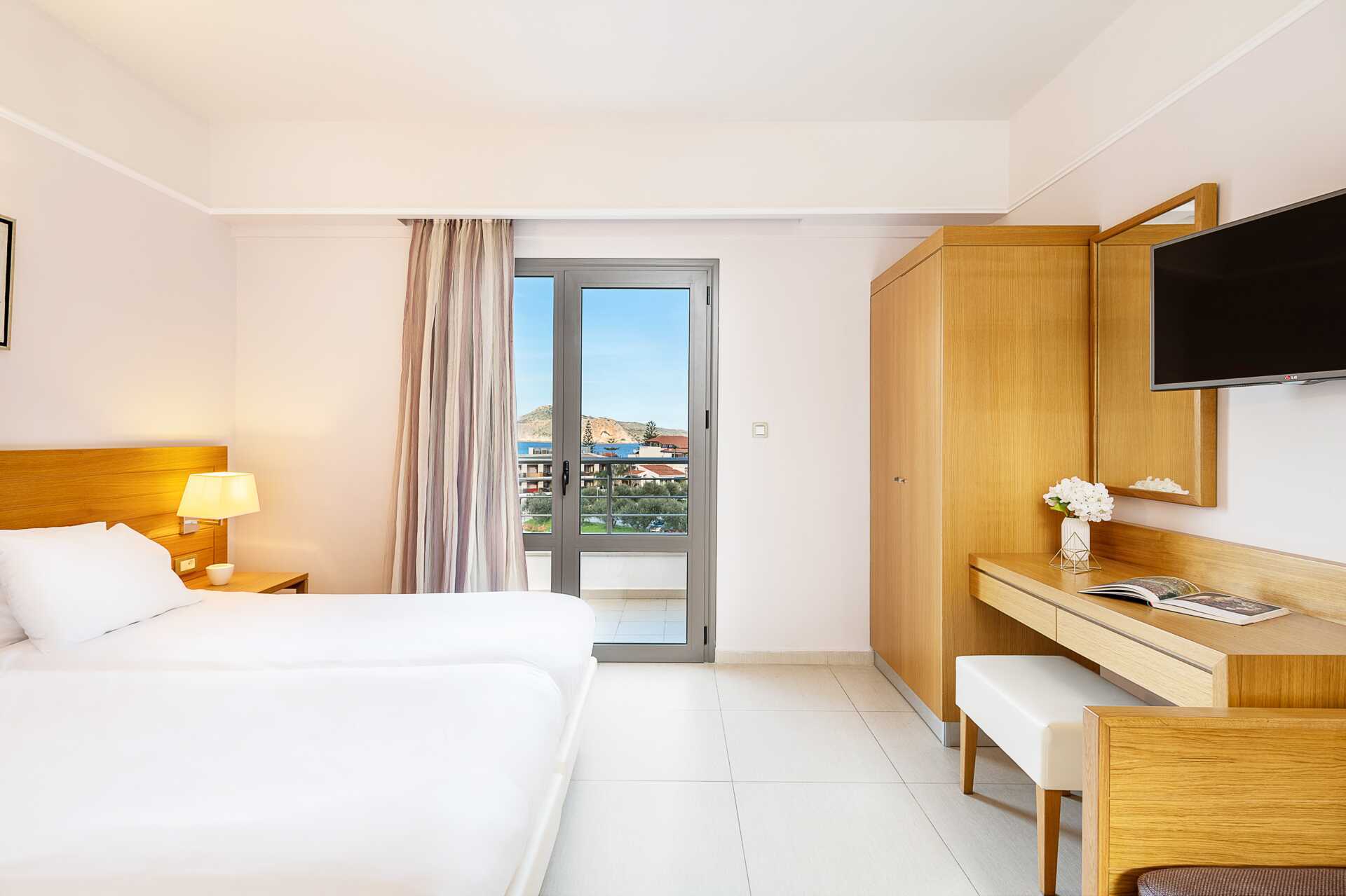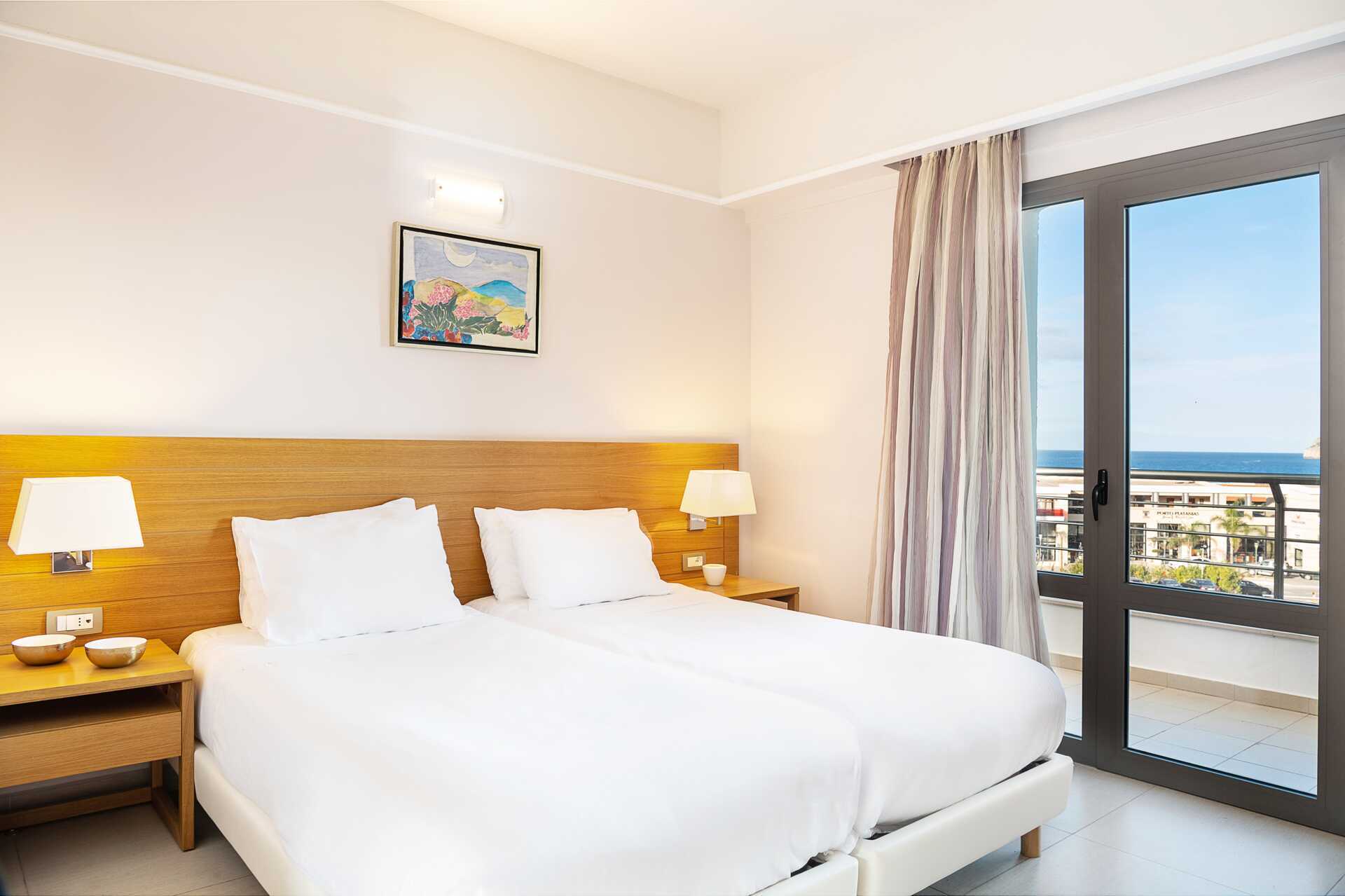 Perhehuone parvekkeella tai terassilla. Parivuode tai kaksi yhden hengen sänkyä. Lisävuodemahdollisuus vuodesohvasta. Maksuton wifi ja ilmastointi. Tallelokero lisämaksusta. Jääkaappi, vedenkeitin ja kahvinkeitin. Tv kansainvälisillä kanavilla. Hiustenkuivain. Kylpyhuoneessa suihku ja wc. Siivous 7 krt/viikko. Tasoeroja ja portaita joissakin asunnoissa. Alle 2-vuotiaat lapset lasketaan lisävuoteella majoittuviksi henkilöiksi.