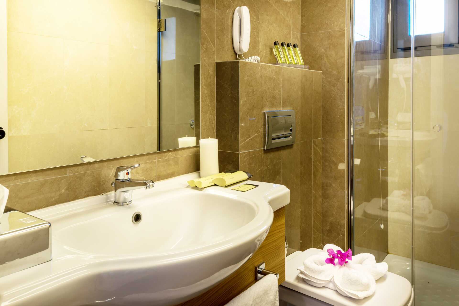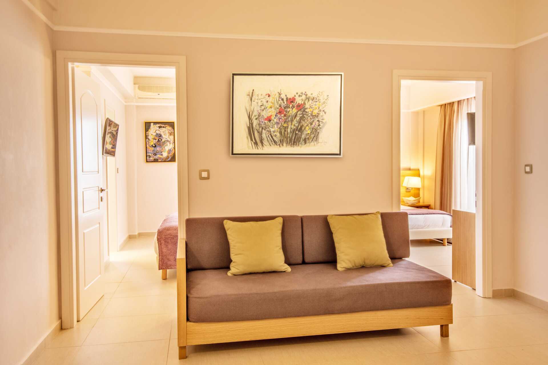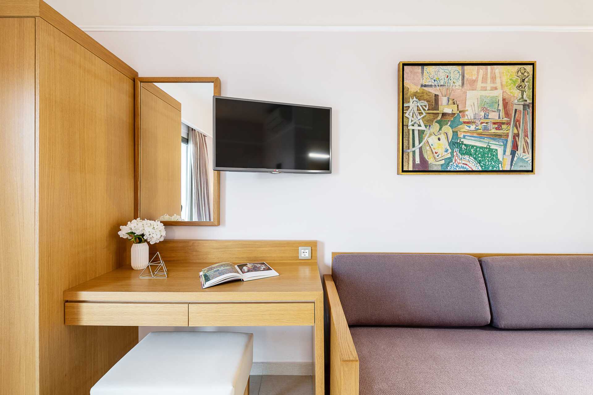 Perhehuone parvekkeella tai terassilla. Parivuode tai kaksi yhden hengen sänkyä. Lisävuodemahdollisuus vuodesohvasta. Maksuton wifi ja ilmastointi. Tallelokero lisämaksusta. Jääkaappi, vedenkeitin ja kahvinkeitin. Tv kansainvälisillä kanavilla. Hiustenkuivain. Kylpyhuoneessa suihku ja wc. Siivous 7 krt/viikko. Tasoeroja ja portaita joissakin asunnoissa. Alle 2-vuotiaat lapset lasketaan lisävuoteella majoittuviksi henkilöiksi.