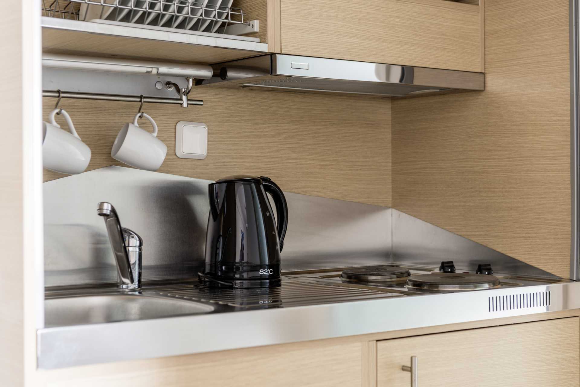 Eri kokoisia yksiöitä alennetulla maatasolla. Jaettu ulkotila. Yhdessä näistä huoneistoista on ikkunat, joista on näkymä uima-altaalle, ja ikkuna sijaitsee vedenpinnan alapuolella. Kaksi yhden hengen sänkyä. Lisävuodemahdollisuus vuodesohvasta. Minikeittiössä keittolevyt, jääkaappi, vedenkeitin ja yksinkertainen keittiövarustus. Maksuton wifi ja ilmastointi. Tallelokero lisämaksusta. Tasoerot portaiden kanssa asunnossa. Tv kansainvälisillä kanavilla. Suihku ja wc. Siivous 6 krt/viikko.
