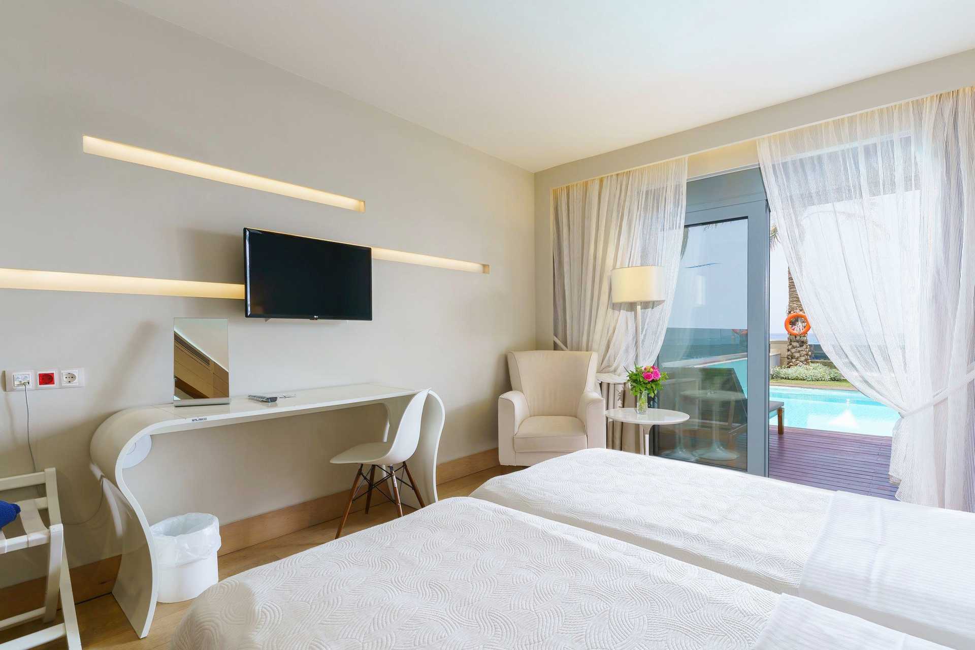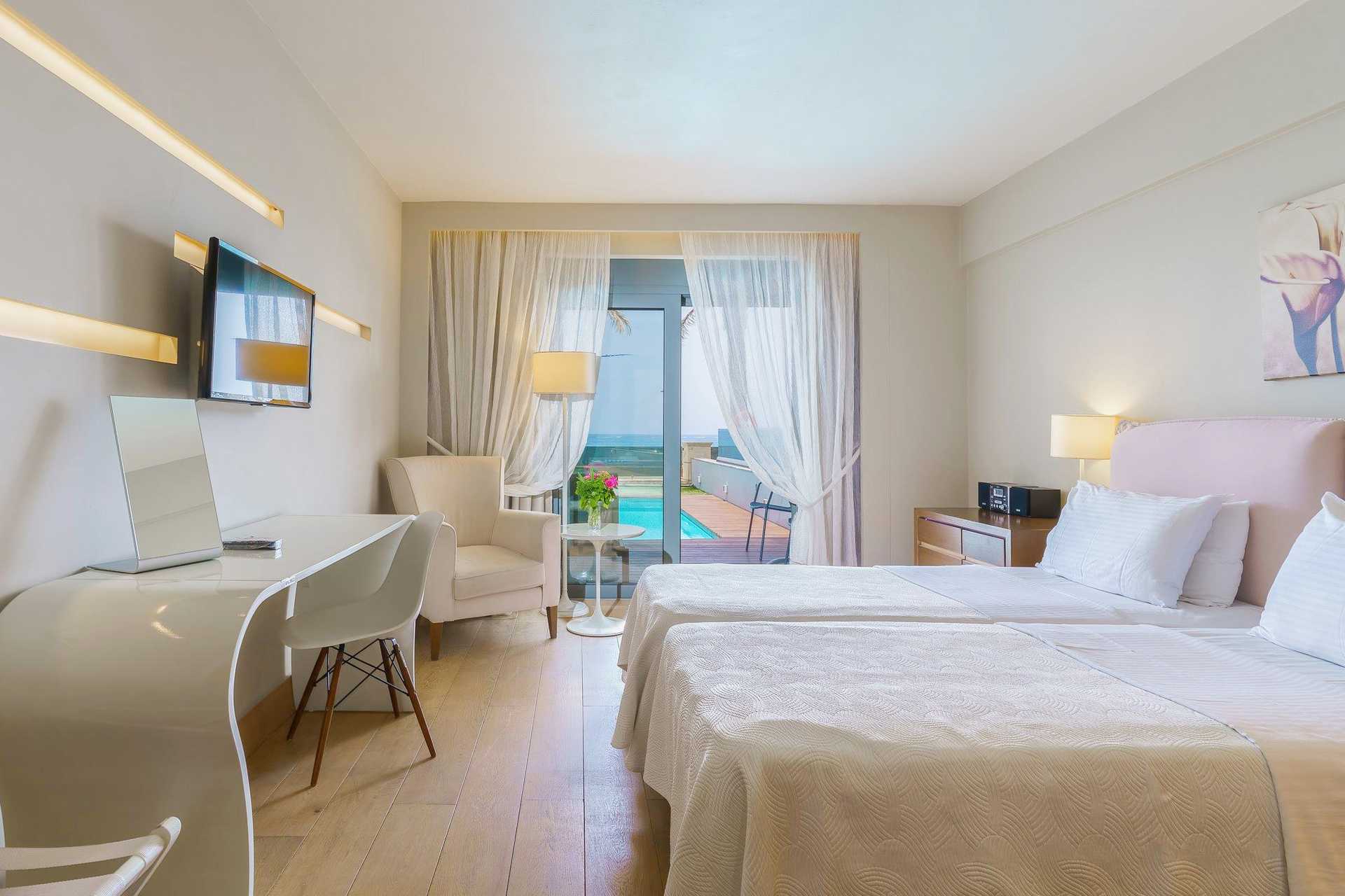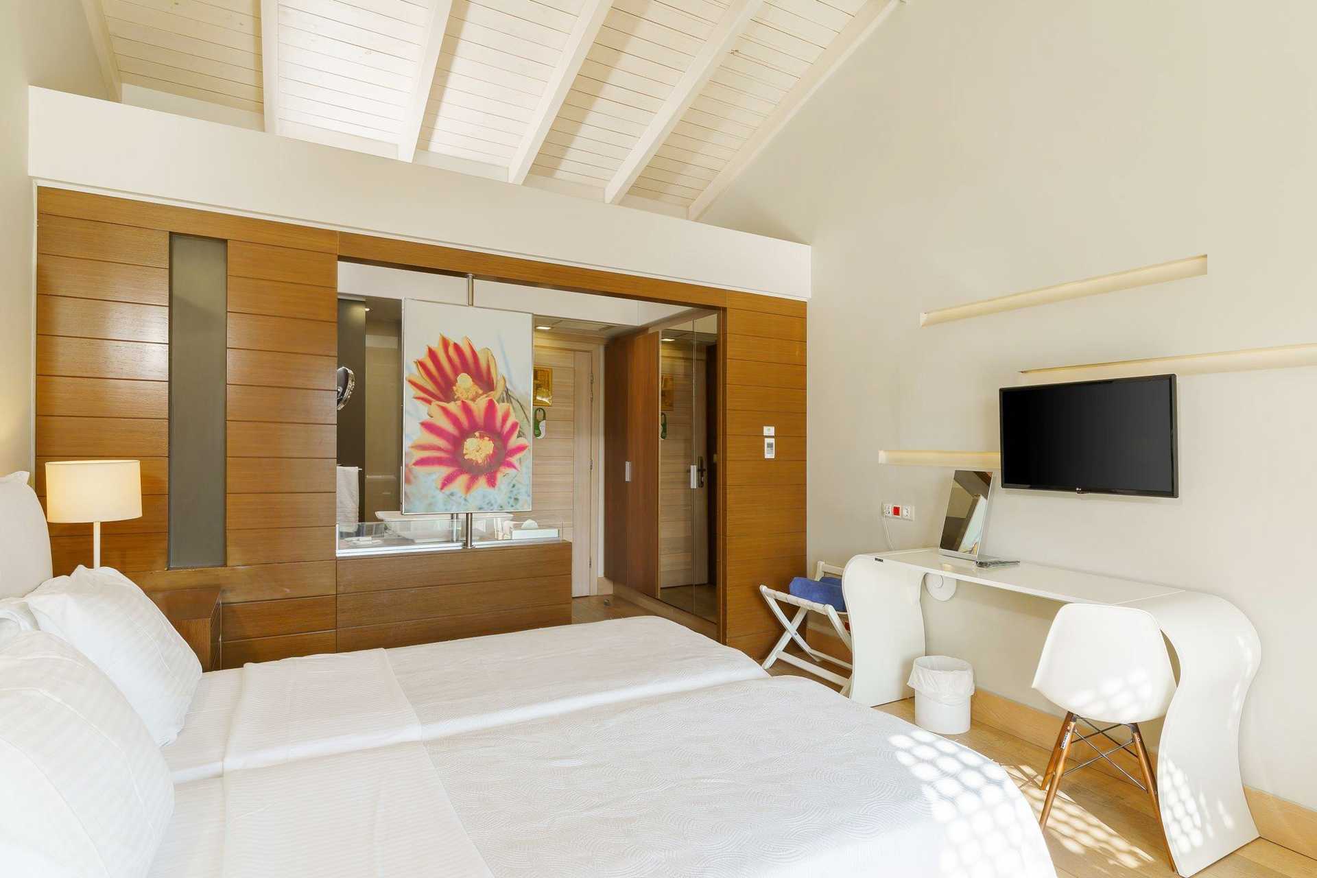 Kahden hengen huone, jossa on pohjaterassi ja merinäköala sekä oma uima-allas. Pohjaterassilla on pöydät ja tuolit sekä Aurinkutoolit. Parivuode tai kaksi yhden hengen sänkyä. Maksuton wifi, ilmastointi ja tallelokero. Jääkaappi. Vedenkeitin, kahvia ja teetä. Tv kansainvälisillä kanavilla. Hyttysverkko. Kylpytakit ja tossut. Hiustenkuivain. Kylpyhuoneessa suihku ja wc. Joissakin huoneissa kylpyhuoneet avautuvat huoneeseen, suihkussa ja wc:ssä on ovet. Siivous 7 krt/viikko.