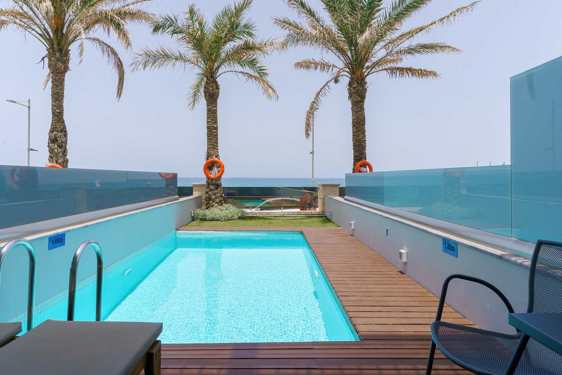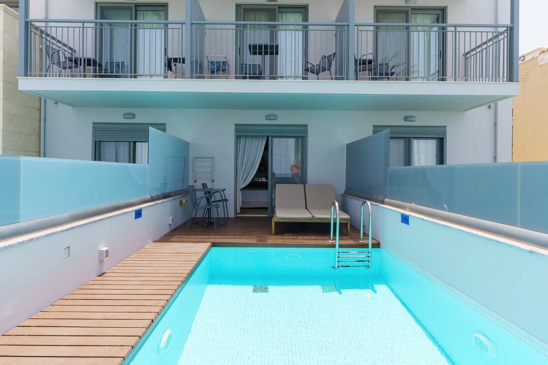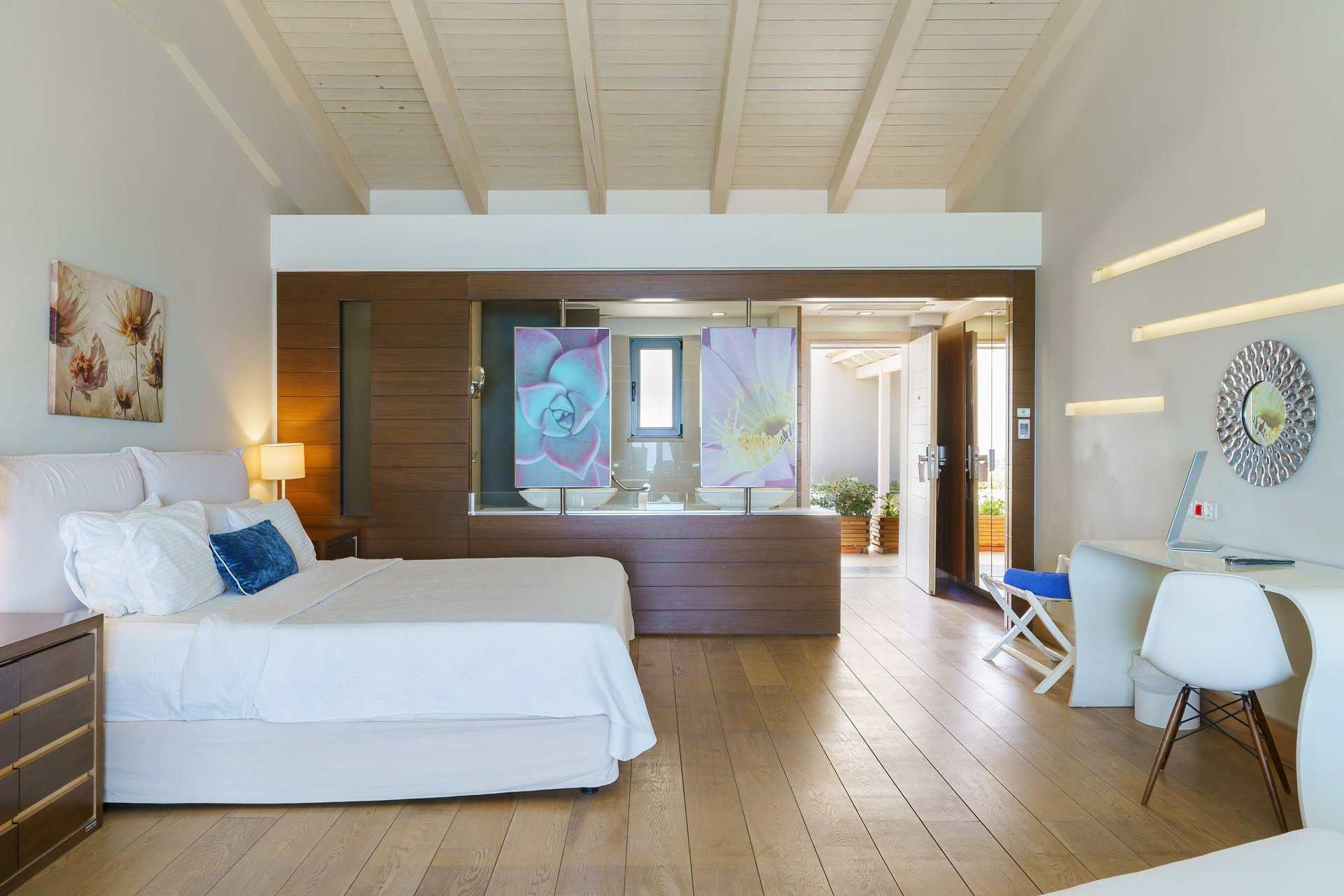Kahden hengen huone, jossa on pohjaterassi ja merinäköala sekä oma uima-allas. Pohjaterassilla on pöydät ja tuolit sekä Aurinkutoolit. Parivuode tai kaksi yhden hengen sänkyä. Maksuton wifi, ilmastointi ja tallelokero. Jääkaappi. Vedenkeitin, kahvia ja teetä. Tv kansainvälisillä kanavilla. Hyttysverkko. Kylpytakit ja tossut. Hiustenkuivain. Kylpyhuoneessa suihku ja wc. Joissakin huoneissa kylpyhuoneet avautuvat huoneeseen, suihkussa ja wc:ssä on ovet. Siivous 7 krt/viikko.