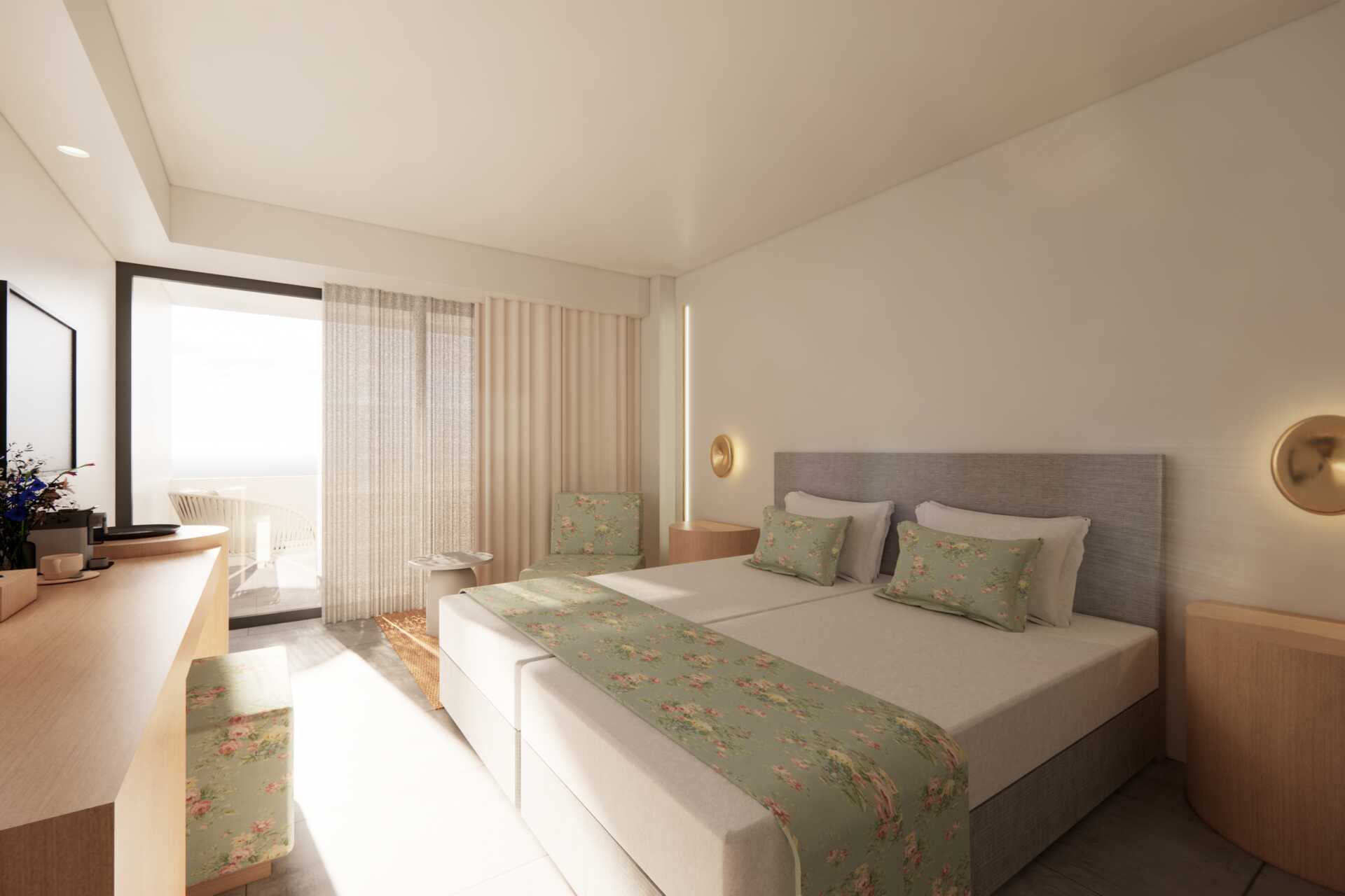 Kahden hengen huone, kaikissa huoneissa on parveke. Jotkut huoneet on varattavissa merinäköalalla, rajoitetulla merinäköalalla tai uima-allasnäköalalla. Parivuode tai kaksi yhden hengen sänkyä. Lisävuodemahdollisuus yhden hengen sängystä. Maksuton wifi, ilmastointi ja tallelokero. Minibaari lisämaksulla. Vedenkeitin, kahvia ja teetä. Tv kansainvälisillä kanavilla. Hiustenkuivain. Tohvelit. Kylpyamme tai suihku ja wc. Siivous 7 krt/viikko.
