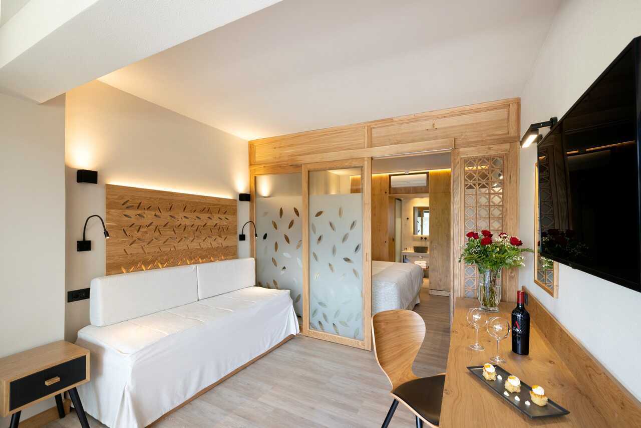 Perhehuone parvekkeella tai terassilla. Perhehuone koostuu kahdesta osasta: makuuhuoneesta ja olohuoneesta, joiden välissä on himmeä lasiovi. Parivuode tai kaksi erillistä vuodetta. Lisävuodemahdollisuutena vuodesohva. Maksuton wifi, tallelokero ja ilmastointi. Jääkaappi. Kahvinkeitin. Vedenkeitin, kahvia ja teetä. Jokaisessa huoneiston osassa on televisio kansainvälisillä kanavilla. Kolminkertaiset ikkunat. Silitysrauta ja -lauta. Hiustenkuivain. Suihku ja wc. Siivous 7 krt/viikko.