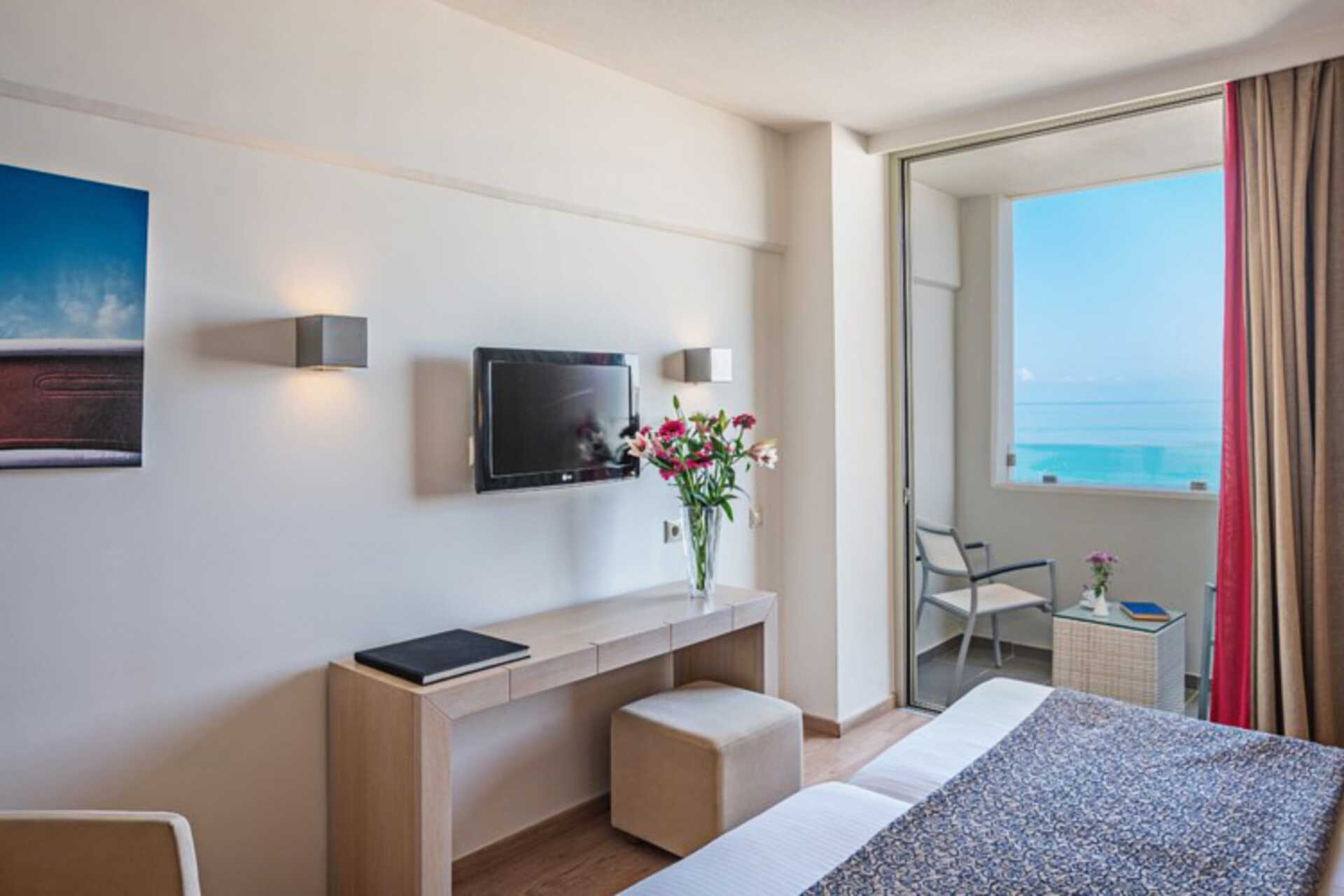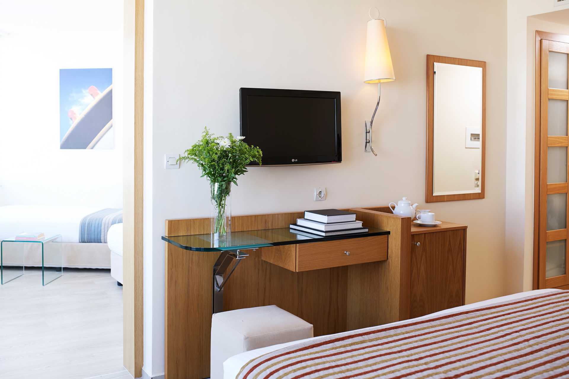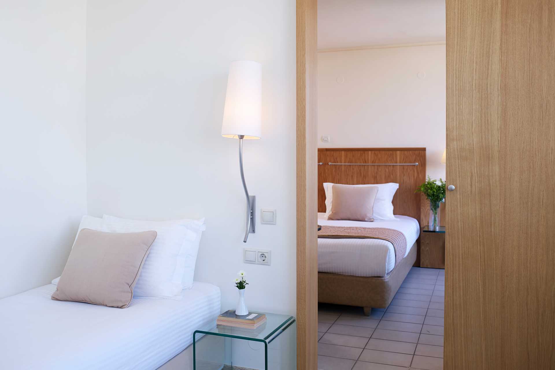 Perhehuone parvekkeella. Kaksi erillistä makuuhuonetta, jotka on yhdistetty väliovella. Kummassakin makuuhuoneessa parisänky tai kaksi yhden hengen sänkyä. Jääkaappi. Vedenkeitin, kahvia ja teetä. Maksuton wifi, ilmastointi ja tallelokero. Tv kansainvälisillä kanavilla. Kylpytakit ja tossut. Yksi kylpyhuone, jossa kylpyamme tai suihku ja wc. Siivous 7 krt/viikko. Liikenteen äänet voivat häiritä joitakin merelle ja ympäristöön päin olevista huoneista.