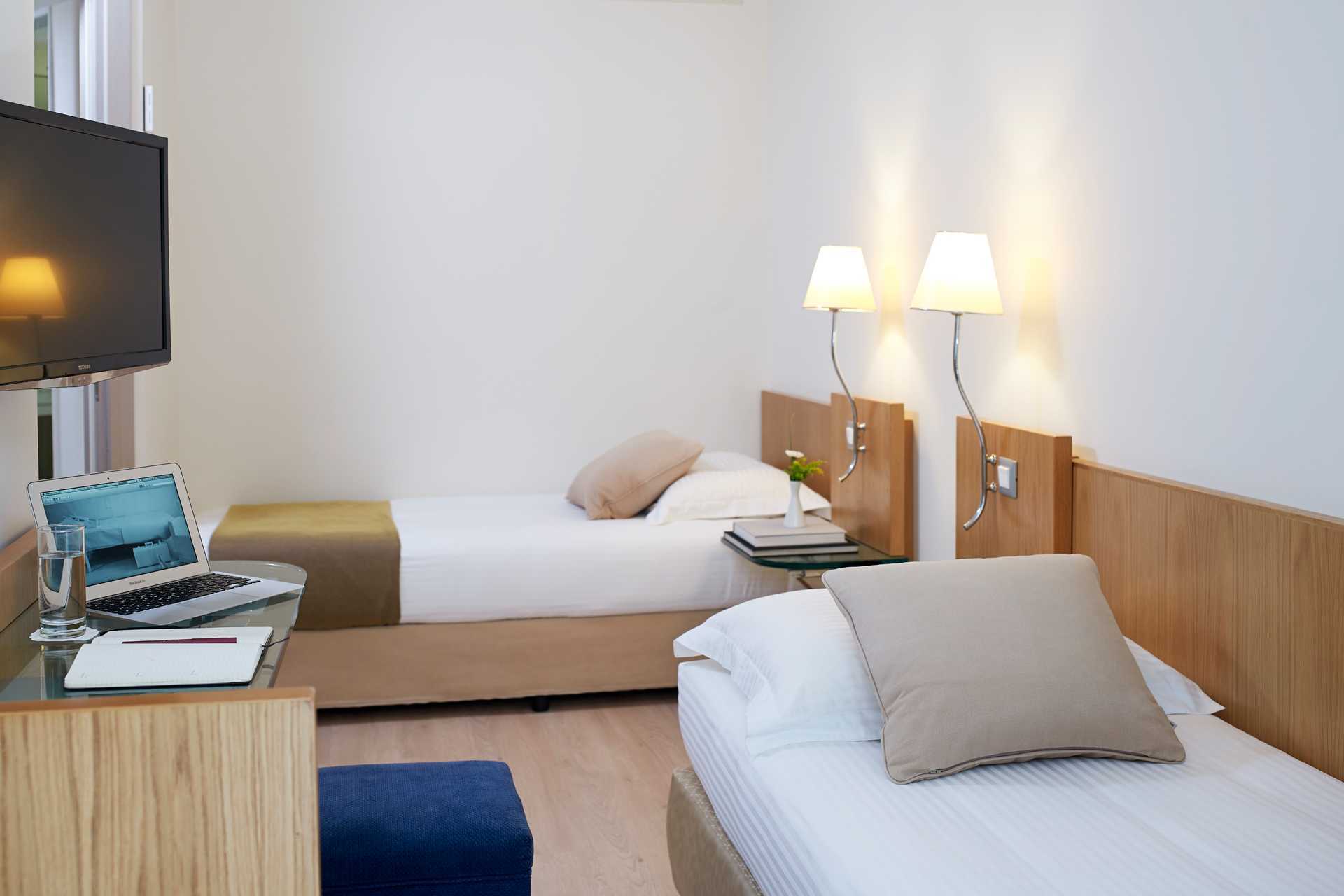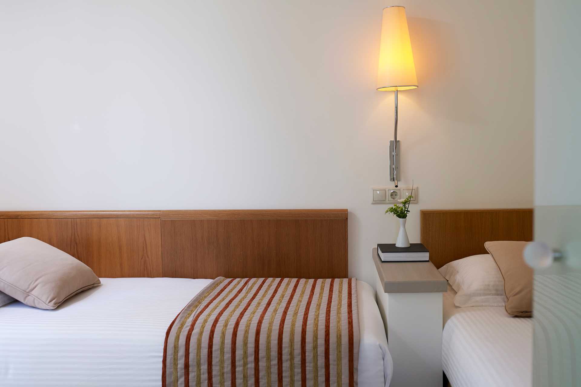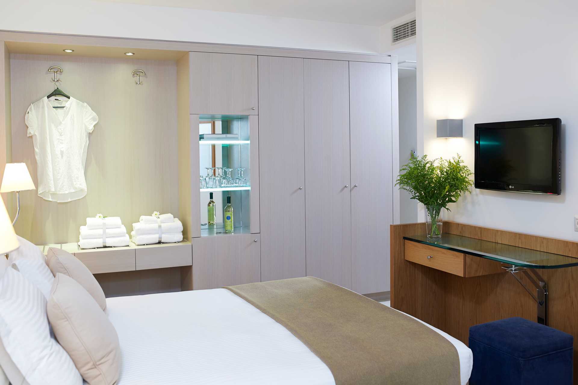 Perhehuone parvekkeella. Kaksi erillistä makuuhuonetta, jotka on yhdistetty väliovella. Kummassakin makuuhuoneessa parisänky tai kaksi yhden hengen sänkyä. Jääkaappi. Vedenkeitin, kahvia ja teetä. Maksuton wifi, ilmastointi ja tallelokero. Tv kansainvälisillä kanavilla. Kylpytakit ja tossut. Yksi kylpyhuone, jossa kylpyamme tai suihku ja wc. Siivous 7 krt/viikko. Liikenteen äänet voivat häiritä joitakin merelle ja ympäristöön päin olevista huoneista.