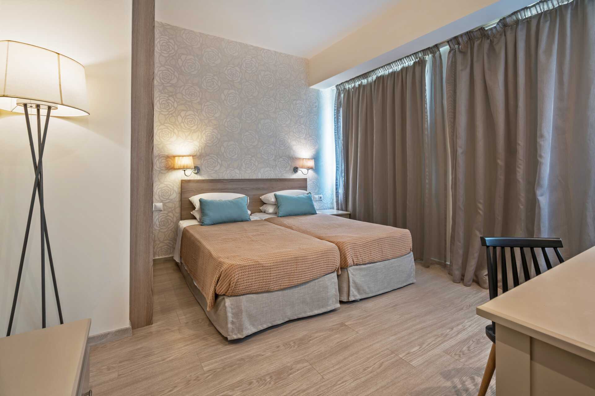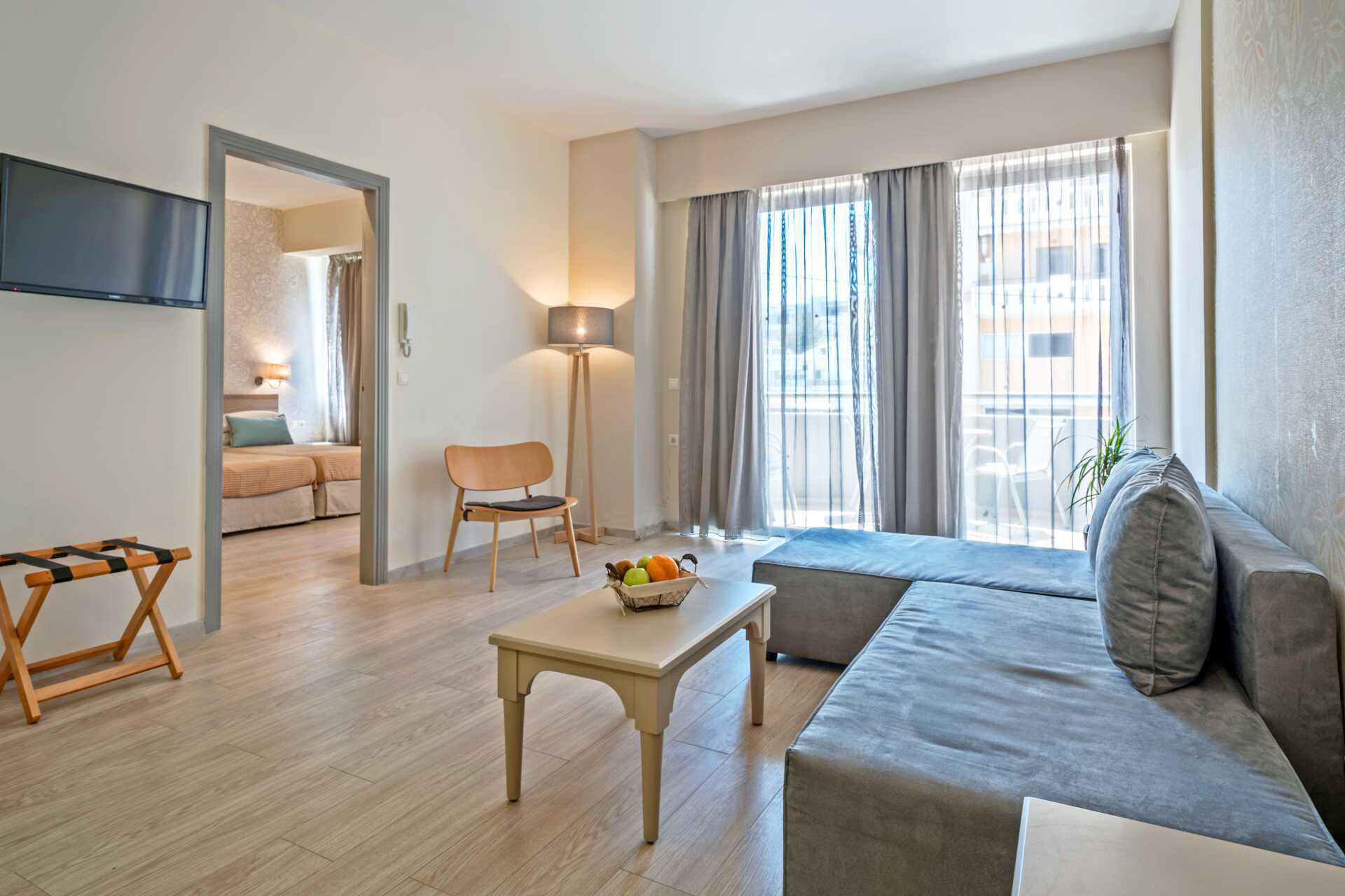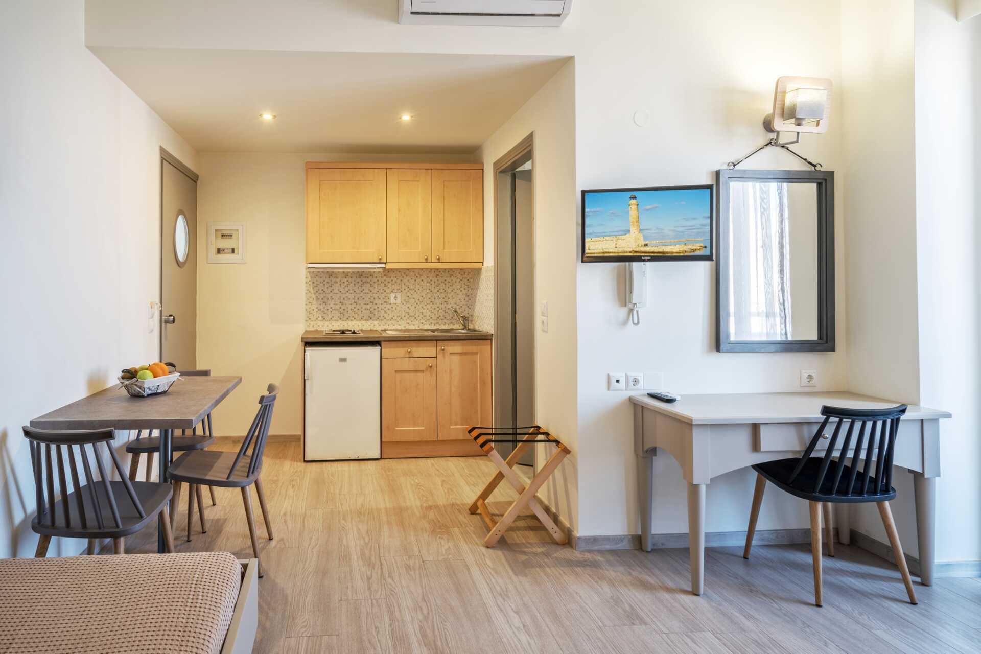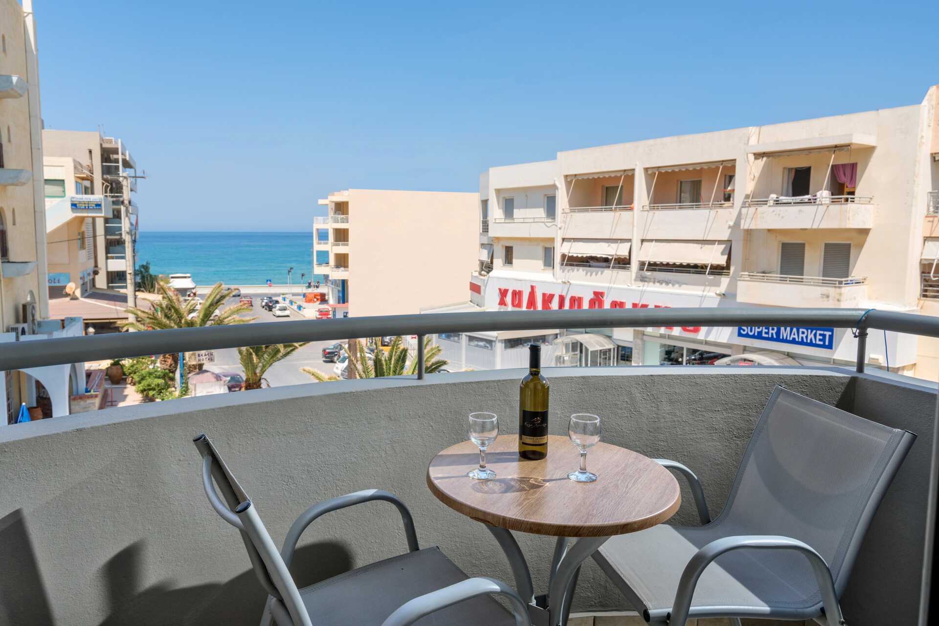 Kaksio parvekkeella. Makuuhuone sekä yhdistetty olohuone ja minikeittiö. Parivuode tai kaksi yhden hengen sänkyä. Minikeittiössä jääkaappi, keittolevyt, kahvinkeitin, vedenkeitin ja yksinkertainen keittiövarustus. Maksuton wifi, ilmastointi ja tallelokero. Tv kansainvälisillä kanavilla. Kylpyhuoneessa suihku ja wc. Siivous 6 krt/viikko. Alle 2-vuotiaat lapset lasketaan lisävuoteella majoittuviksi henkilöiksi.