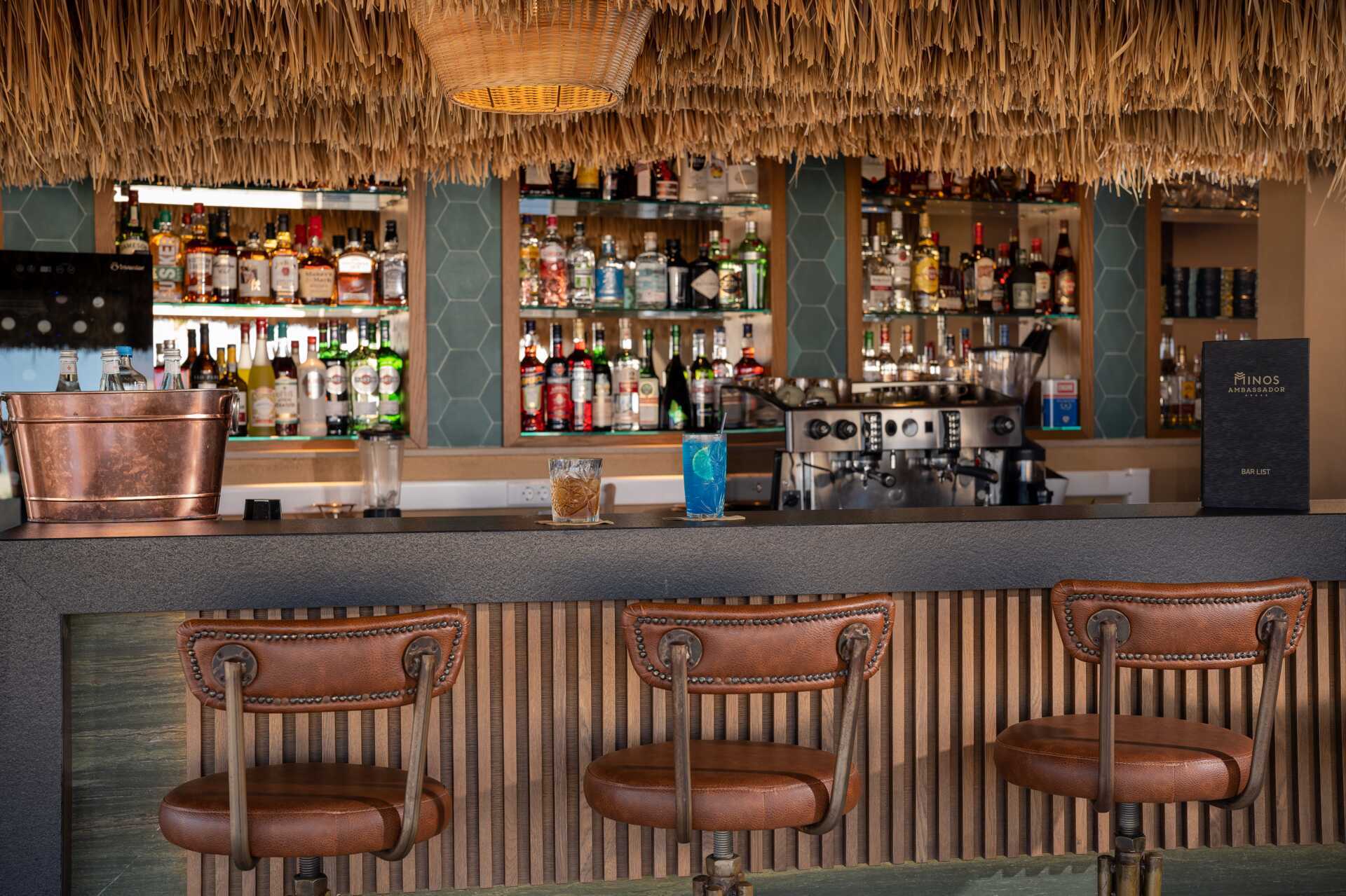 Minos Ambassador Suite & Span noutopöytäravintola Elia tarjoaa aamiaista ja illallista. Thalasso Pool Restaurantissa voit syödä lounasta. Thalassa Pool Bar tarjoaa kylmiä ja kuumia juomia sekä jäätelöä, ja Sunset Lobby Barista saatavilla juomia. Voit nauttia myös sisarhotelli Minosin ravintoloista ja baareista, hotelli Minos ei ole vain aikuisille.