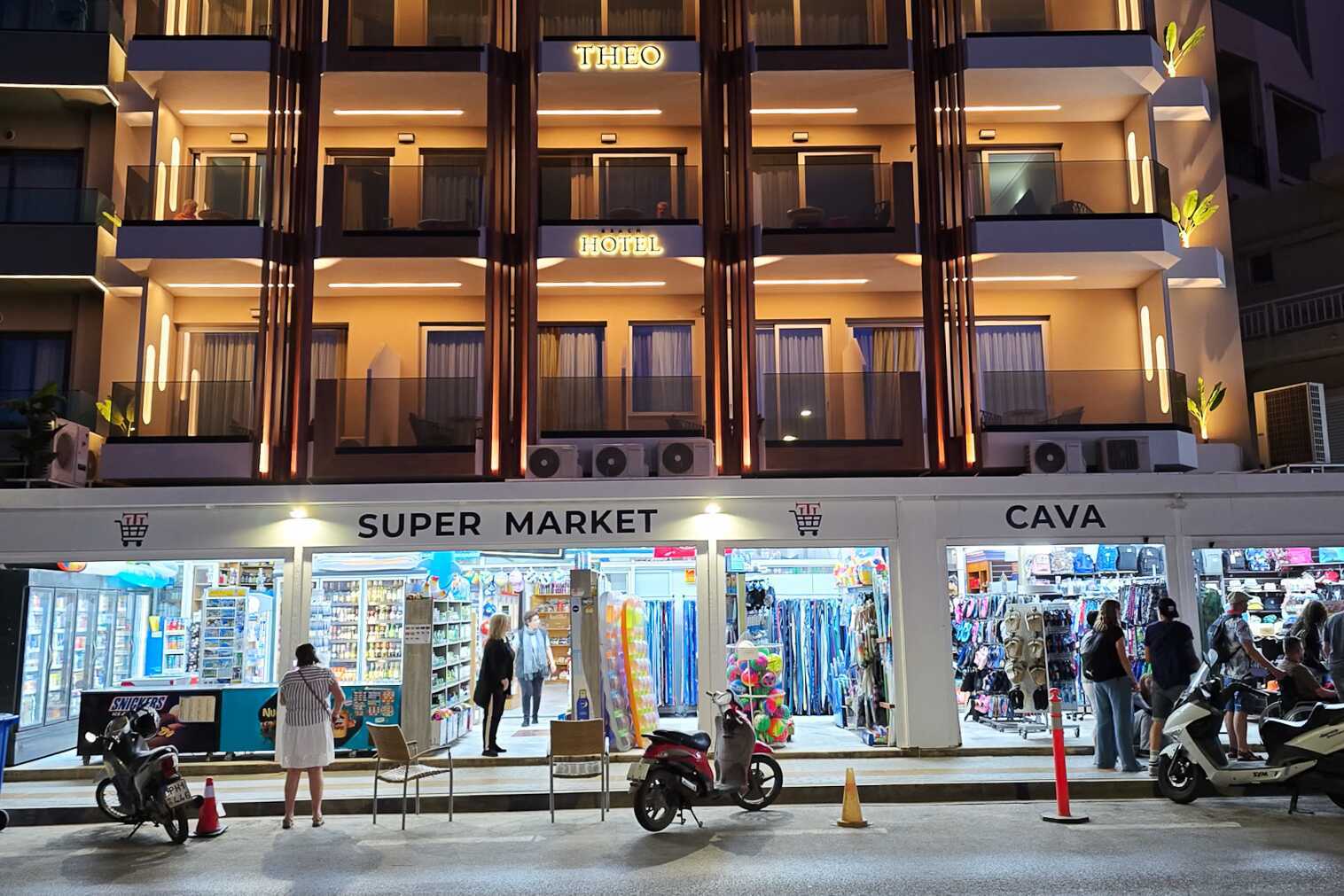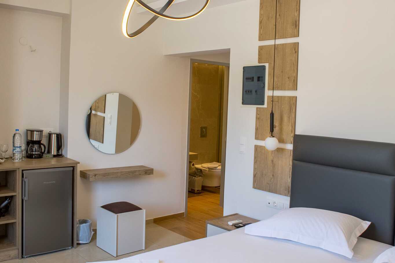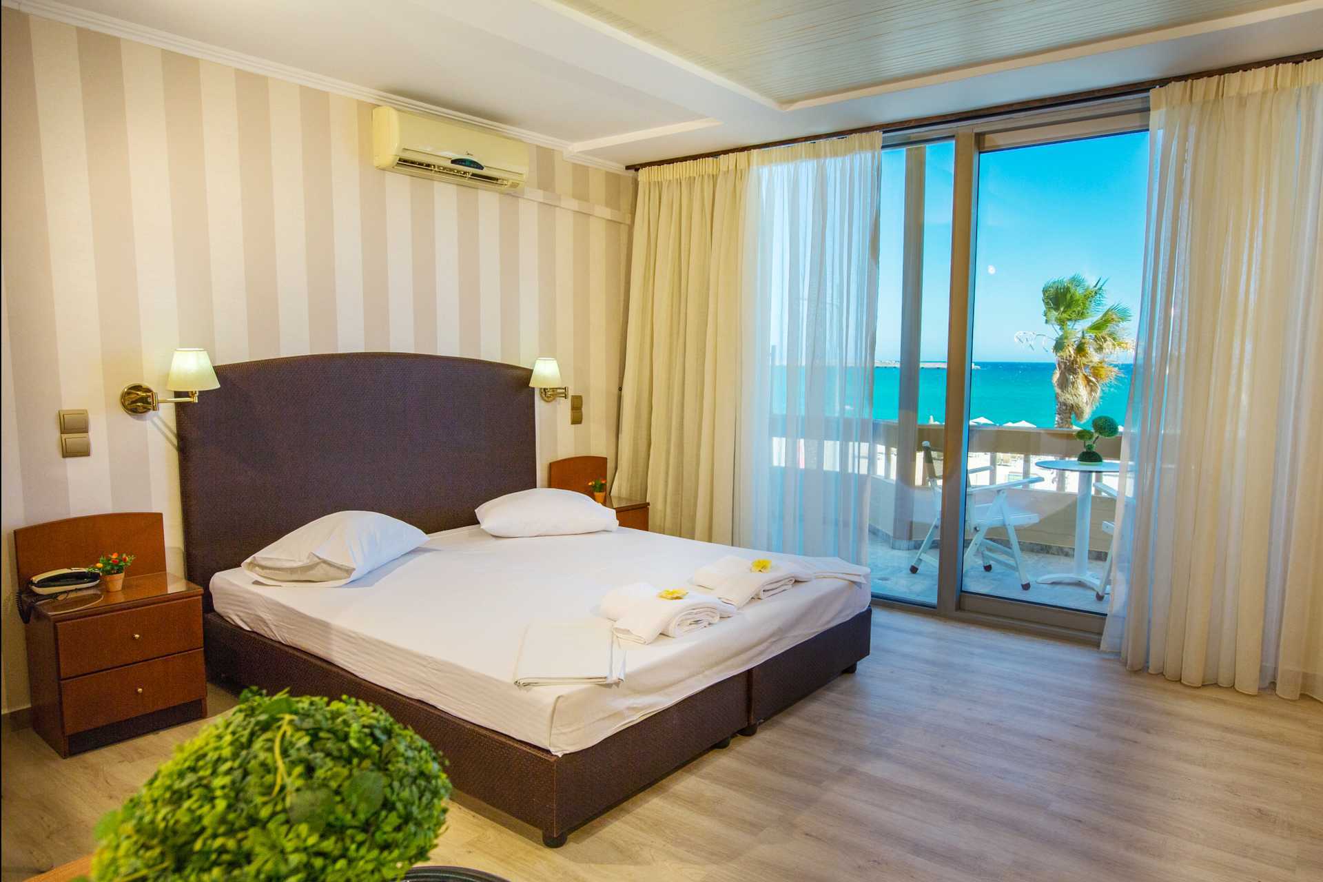 Perhehuone parvekkeella, osa merinäköalalla. Parivuode tai kaksi yhden hengen sänkyä. Mahdollisuus lisävuoteeseen yhden hengen vuoteessa tai kokoontaitettavassa sängyssä. Maksuton tallelokero, ilmastointi ja wifi. Jääkaappi. Kahvinkeitin. Vedenkeitin, kahvia ja teetä. Tv paikallisilla kanavilla. Hiustenkuivain. Kylpyamme tai suihku ja wc. Siivous 6 krt/viikko.