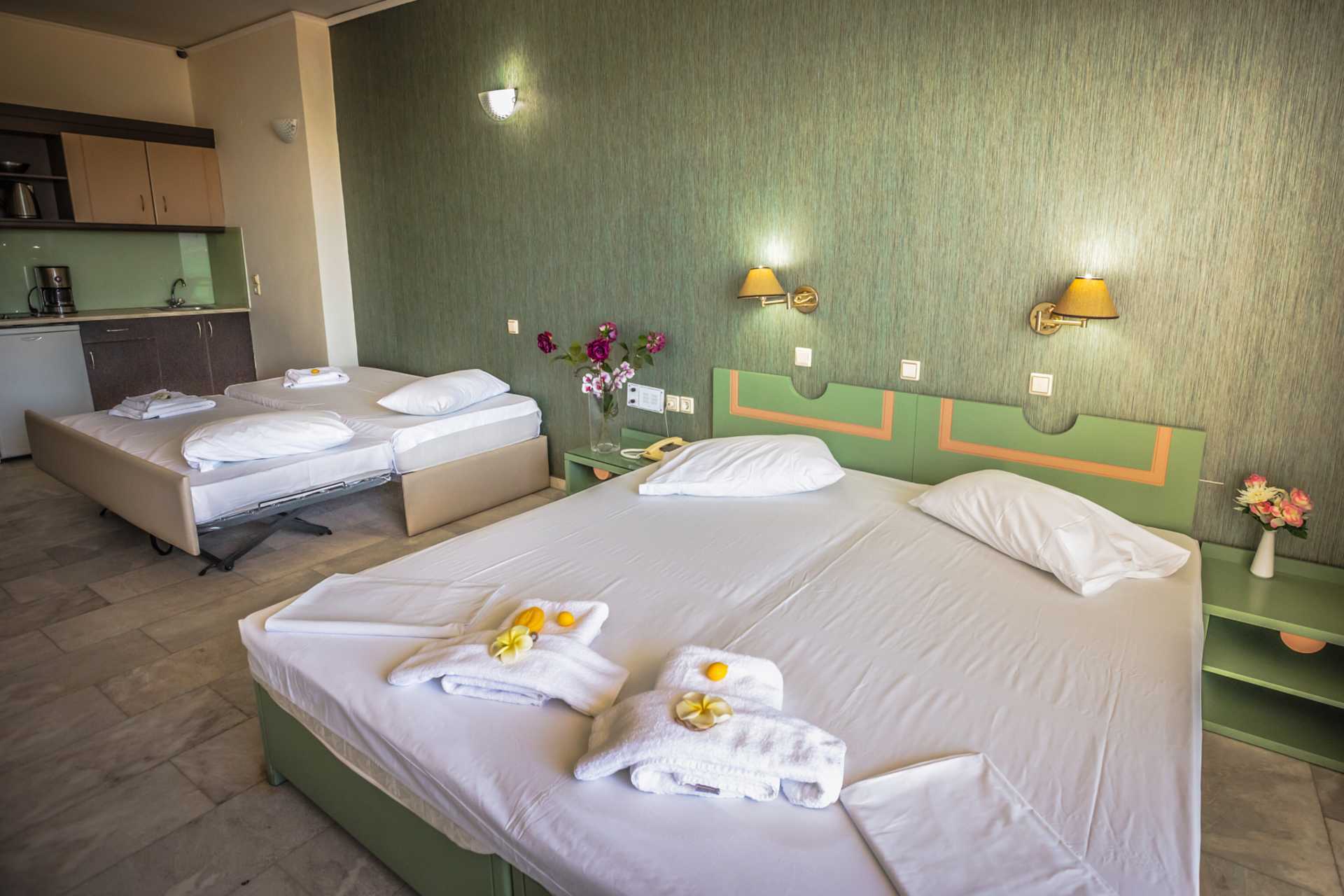Yksiö jossa parveke tai terassi, osa parvekkeista merinäköalalla. Yhdistetty makuuhuone ja minikeittiö. Parivuode tai kaksi yhden hengen sänkyä. Lisävuodemahdollisuus yhden hengen sängystä. Minikeittiössä keittolevyt, jääkaappi, vedenkeitin ja yksinkertainen keittiövarustus. Maksuton wifi, ilmastointi ja tallelokero. Tv paikallisilla kanavilla. Hiustenkuivain. Kylpyamme tai suihku ja wc. Siivous 6 krt/viikko.