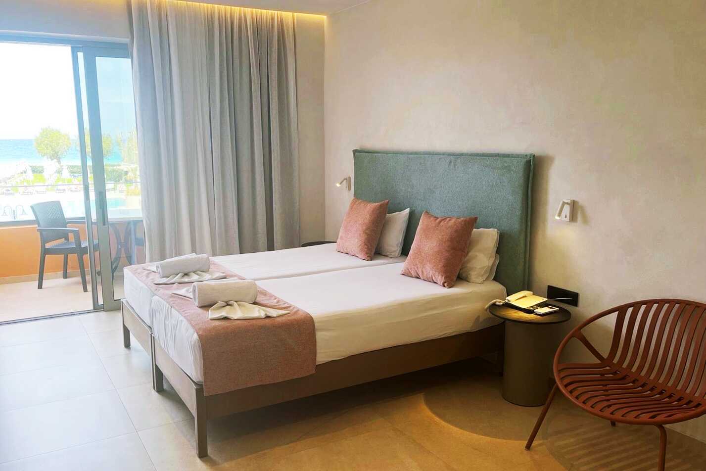 Superior-kaksio parvekkeella ja merinäköalalla. Makuuhuone sekä yhdistetty olohuone ja minikeittiö. Kaksi yhden hengen sänkyä. Lisävuodemahdollisuus vuodesohvasta. Minikeittiössä keittolevyt, jääkaappi, vedenkeitin, mikro ja yksinkertainen keittiövarustus. Maksuton wifi ja ilmastointi. Tallelokero lisämaksusta. Tv kansainvälisillä kanavilla. Hiustenkuivain. Kylpyhuoneessa suihku ja wc. Siivous 6 krt/viikko. Alle 2-vuotiaat lapset lasketaan lisävuoteella majoittuviksi henkilöiksi.