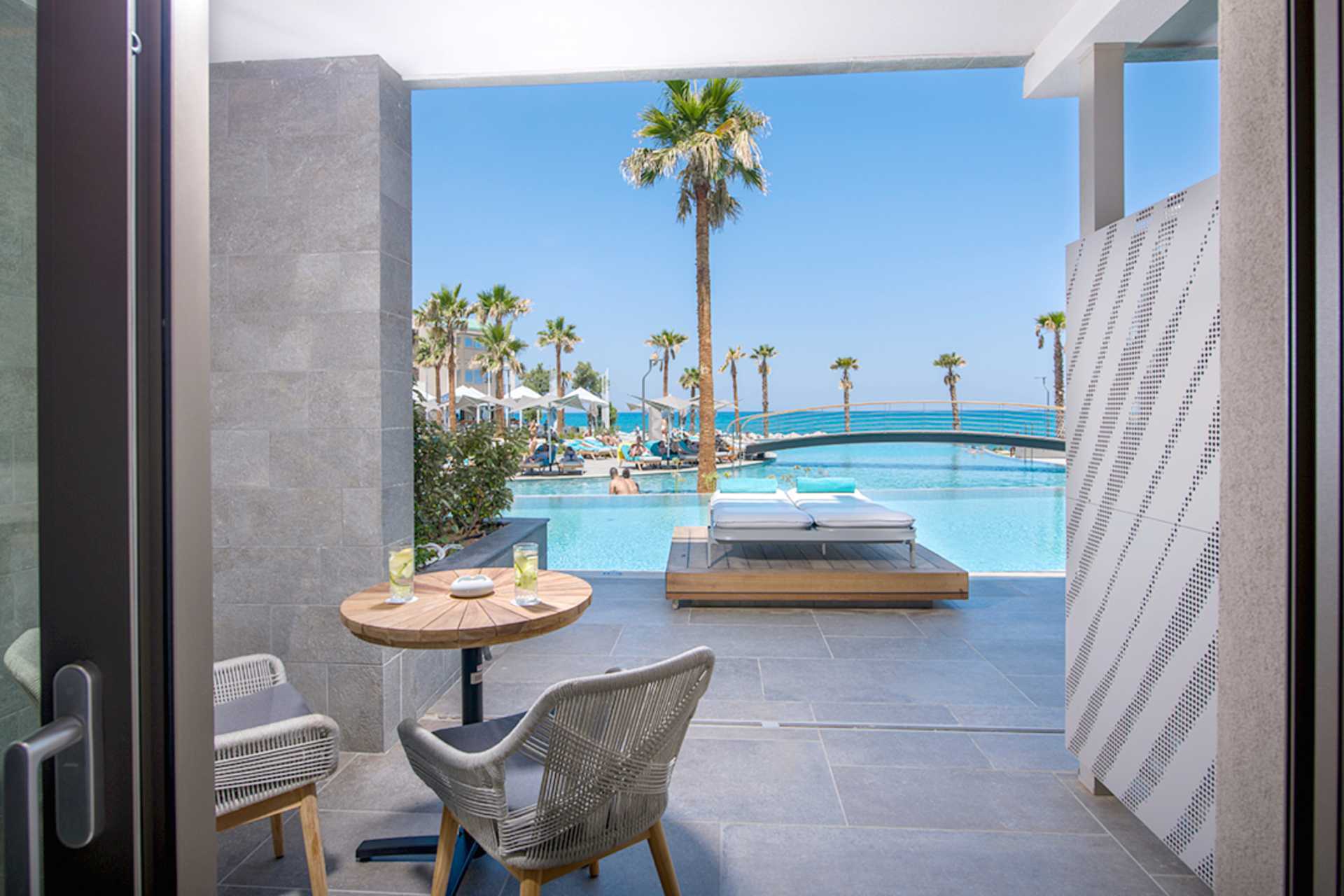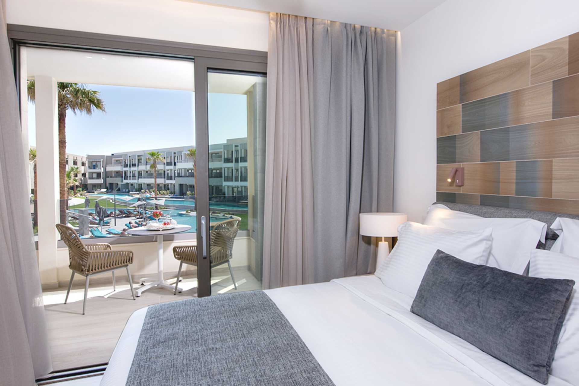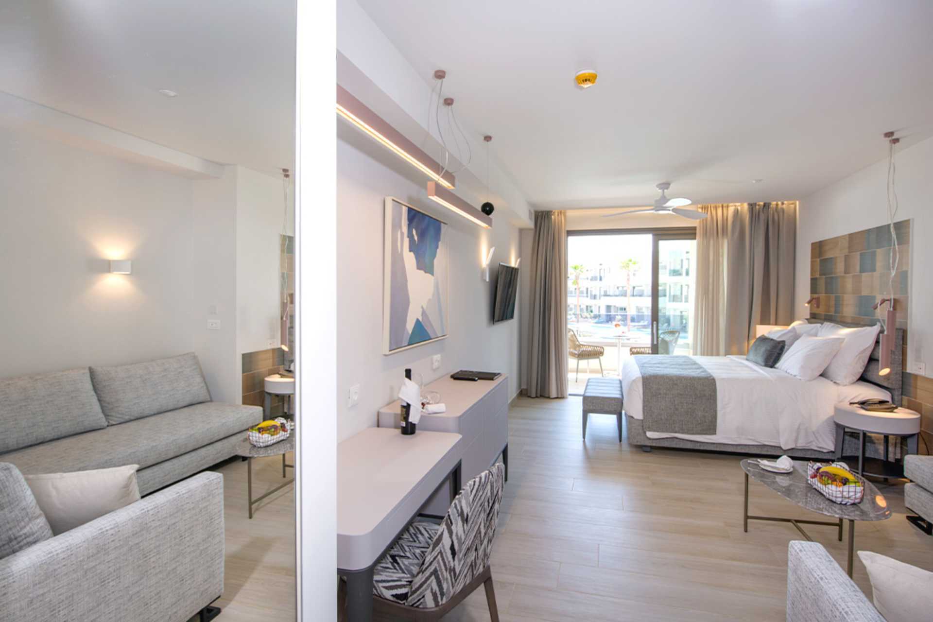 Juniorsviitti, jossa on ulkotila ja jaettu uima-allas allasnäköalalla. Terassilla on pöytiä ja tuoleja sekä aurinkotuoleja. Parivuode. Mahdollisuus saada lisävuode vuodesohvaan. Maksuton wifi, ilmastointi ja tallelokero. Jääkaappi. Espressokeitin - kapselit mukana ja täytetään päivittäin. Vedenkeitin ja kahvia ja teetä. Tv kansainvälisillä kanavilla. Silitysrauta ja -lauta. Kylpytakit ja tossut. Hiustenkuivaaja. Kylpyhuone ammeella tai suihkulla ja wc. Siivous 7 krt/viikko.