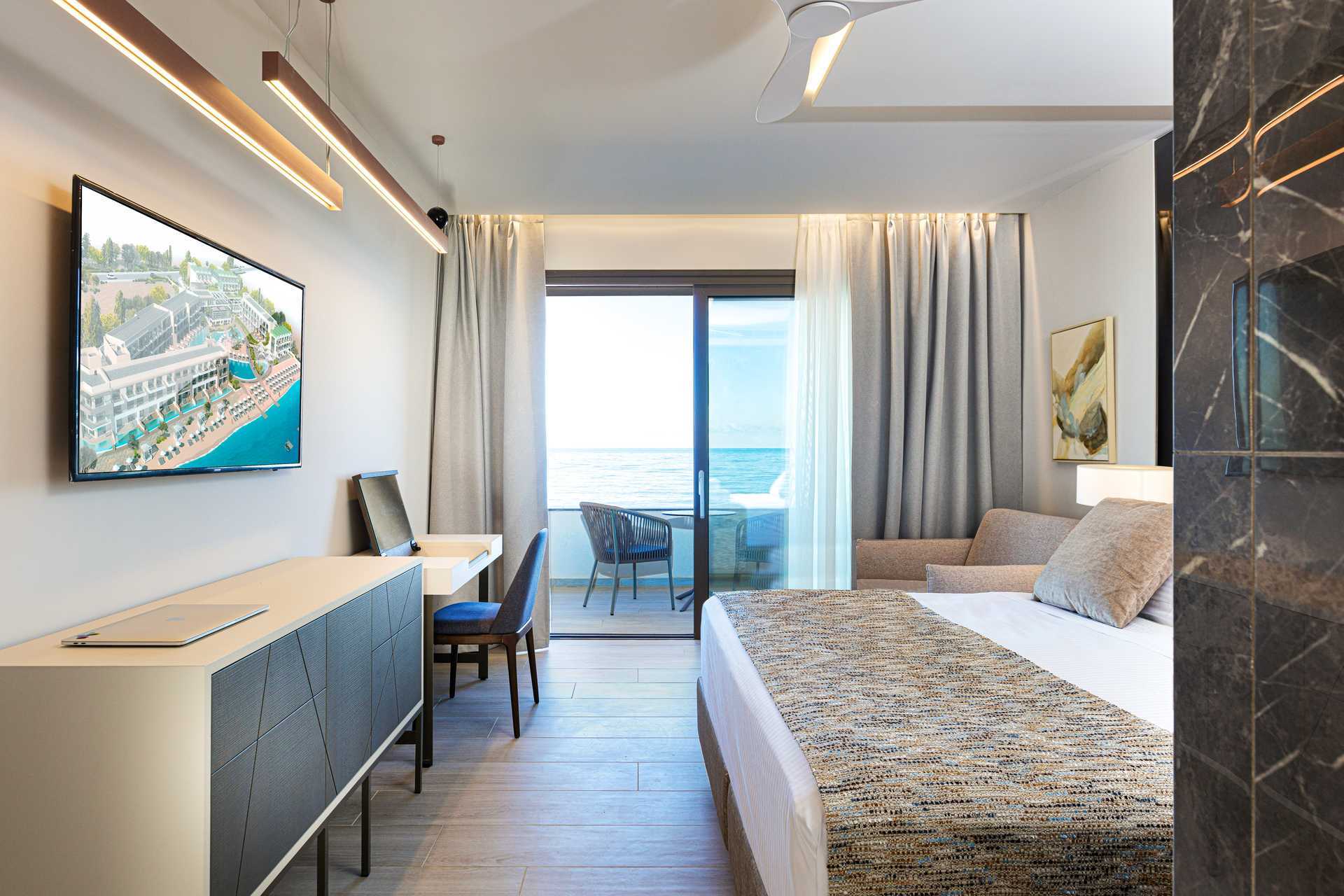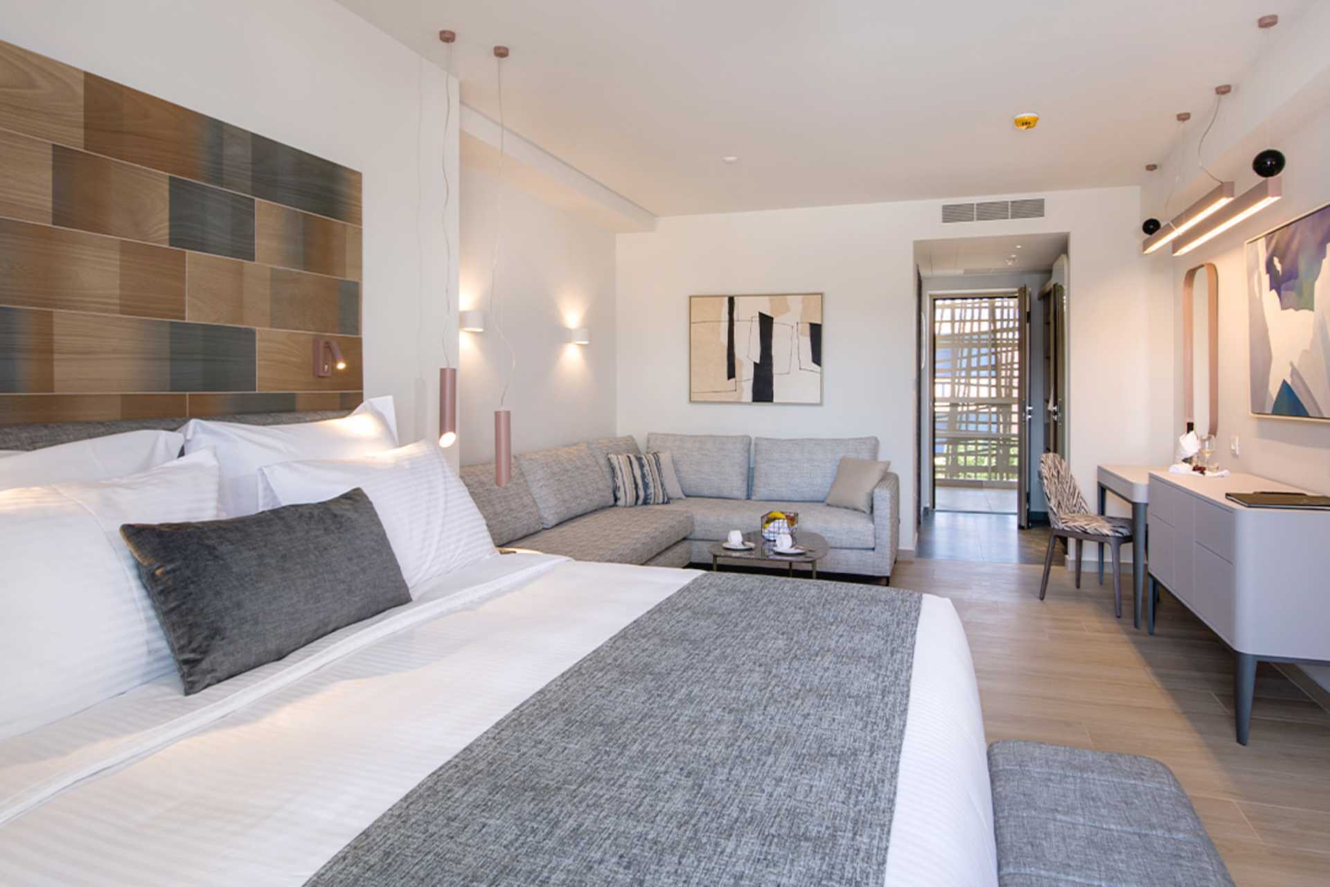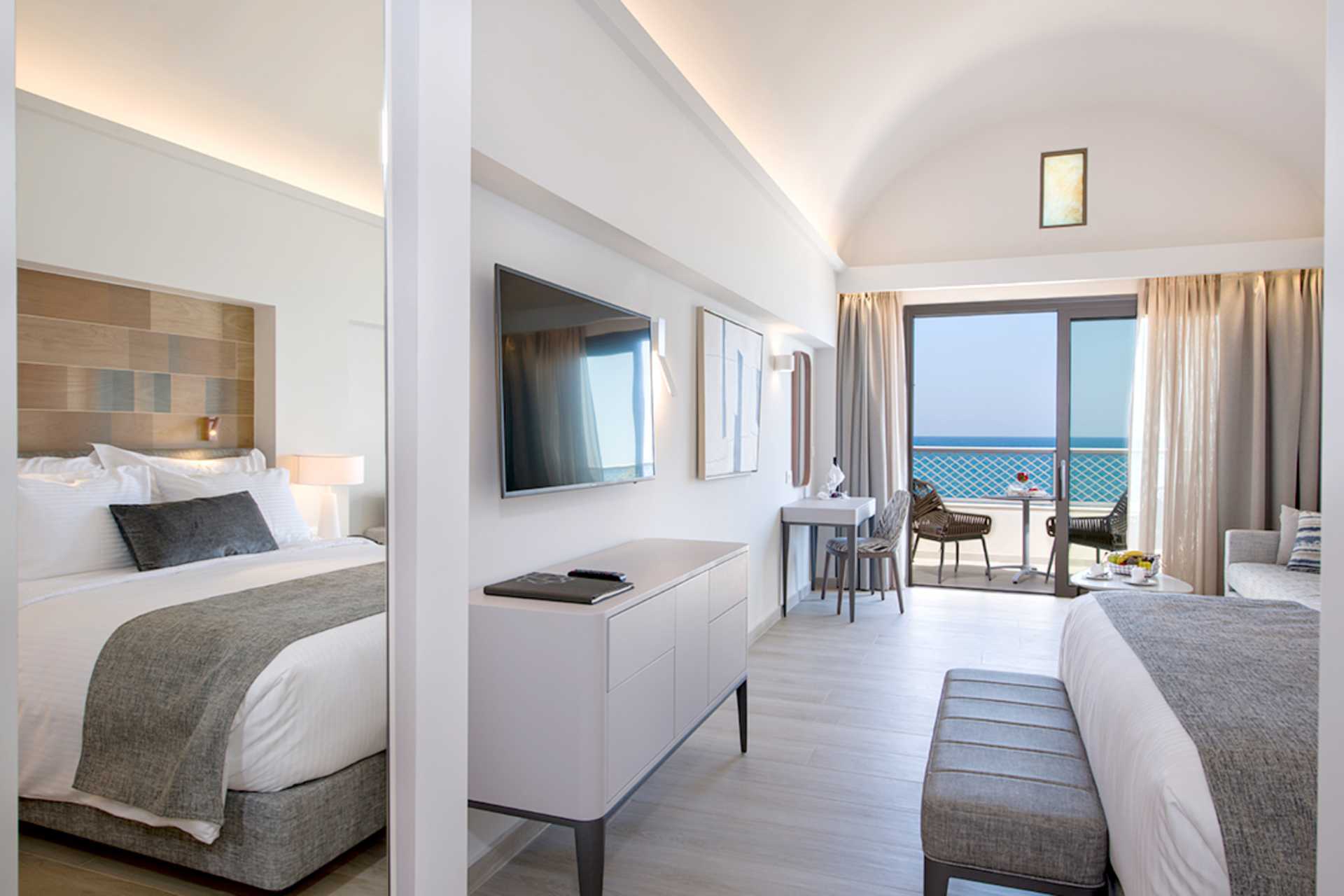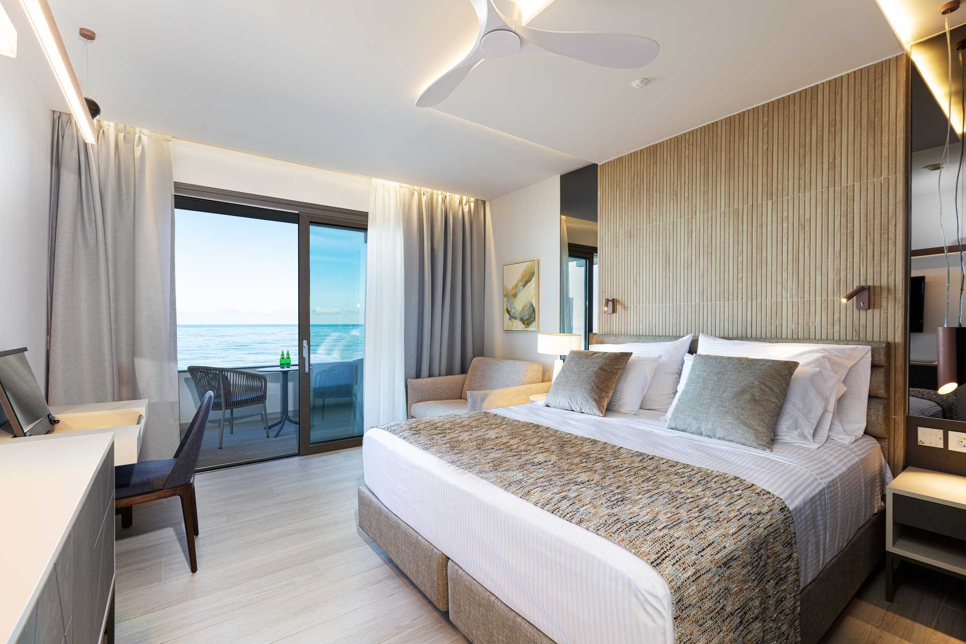 Superior-huone, jossa on parveke ja pääsy jaettuun uima-altaalle, joista osassa on merinäköala ja osassa näkymä uima-altaalle. Ulkotilassa on aurinkotuoleja sekä pöytiä ja tuoleja. Parivuode. Maksuton wifi, ilmastointi ja tallelokero. Jääkaappi. Nespresso-kahvinkeitin - kapselit mukana ja täytetään päivittäin. Vedenkeitin, kahvia ja teetä. Tv kansainvälisillä kanavilla. Silitysrauta ja -lauta. Kylpytakit ja tossut. Hiustenkuivain. Kylpyamme tai suihku ja wc. Siivous 7 krt/viikko.