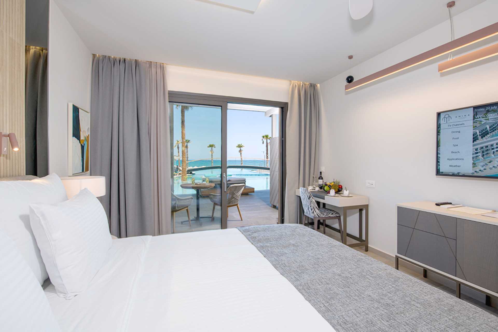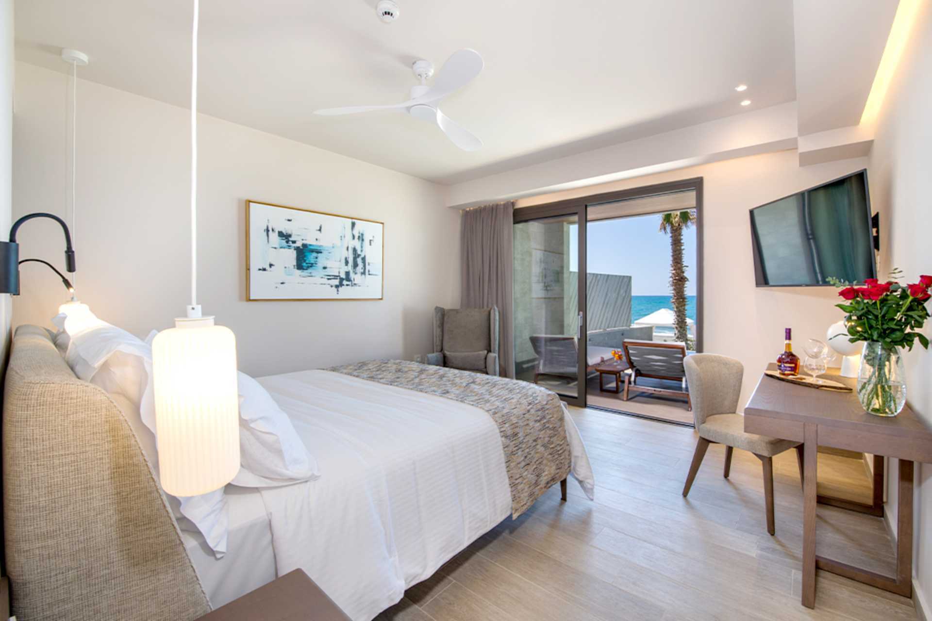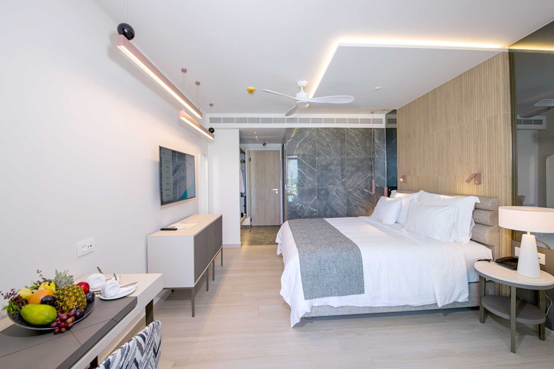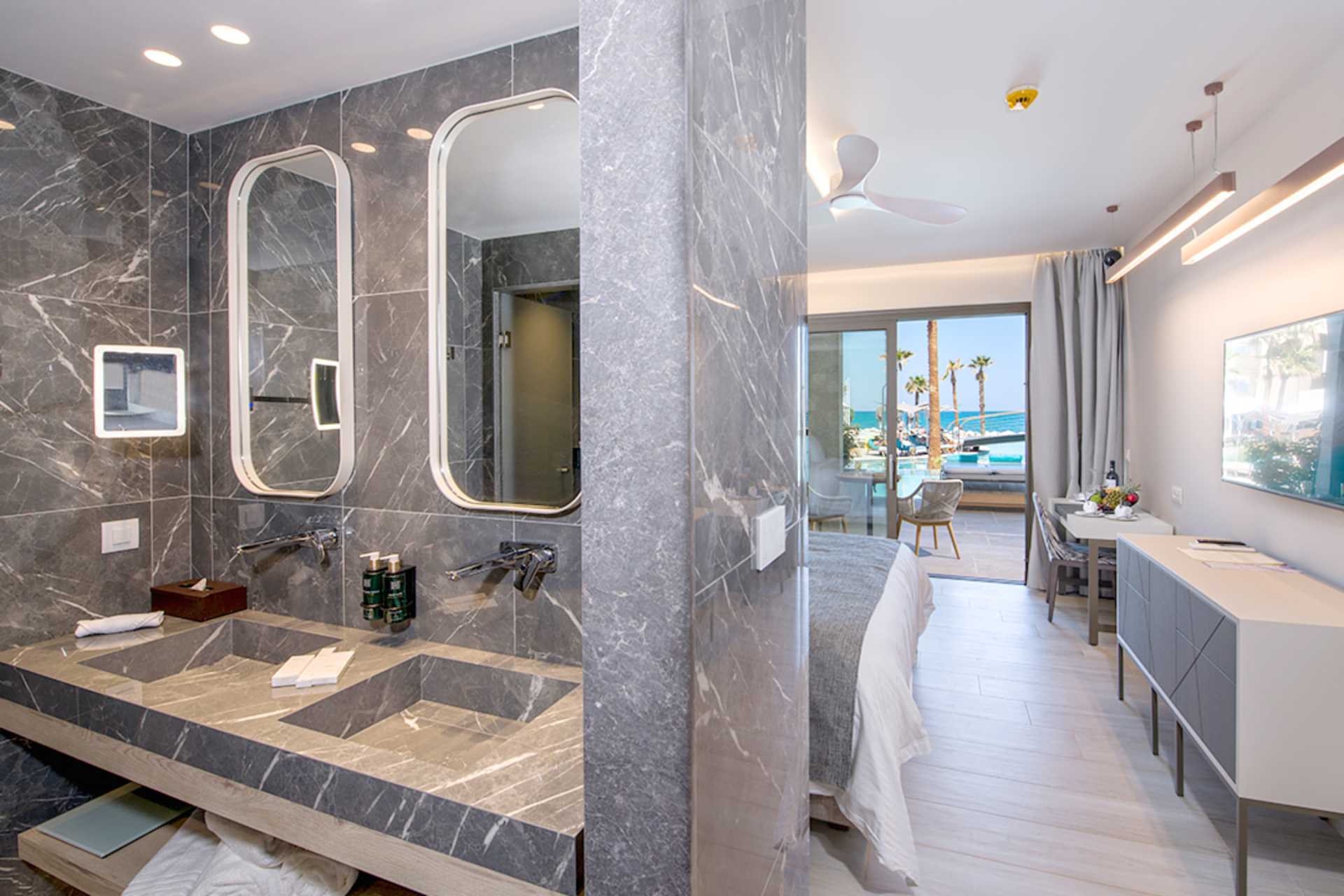 Superior-huone, jossa on parveke ja pääsy jaettuun uima-altaalle, joista osassa on merinäköala ja osassa näkymä uima-altaalle. Ulkotilassa on aurinkotuoleja sekä pöytiä ja tuoleja. Parivuode. Maksuton wifi, ilmastointi ja tallelokero. Jääkaappi. Nespresso-kahvinkeitin - kapselit mukana ja täytetään päivittäin. Vedenkeitin, kahvia ja teetä. Tv kansainvälisillä kanavilla. Silitysrauta ja -lauta. Kylpytakit ja tossut. Hiustenkuivain. Kylpyamme tai suihku ja wc. Siivous 7 krt/viikko.