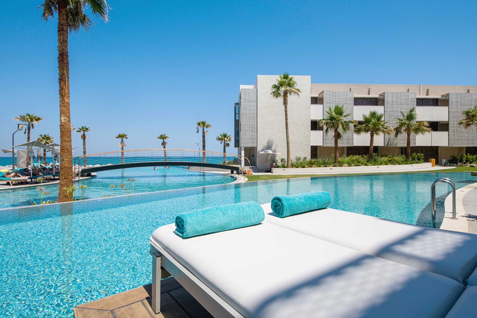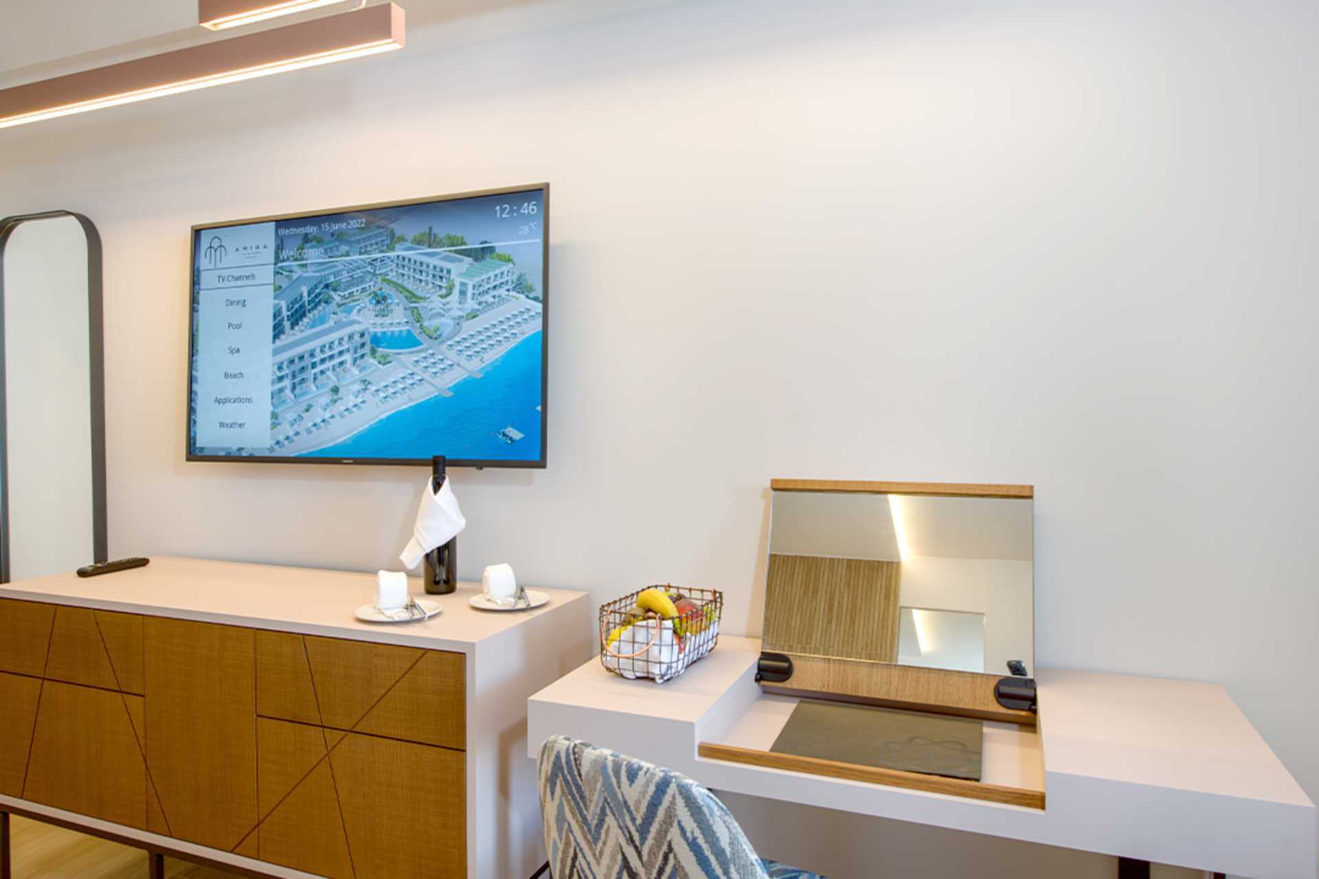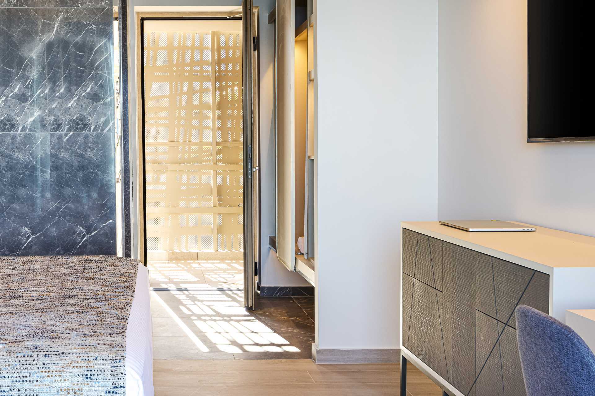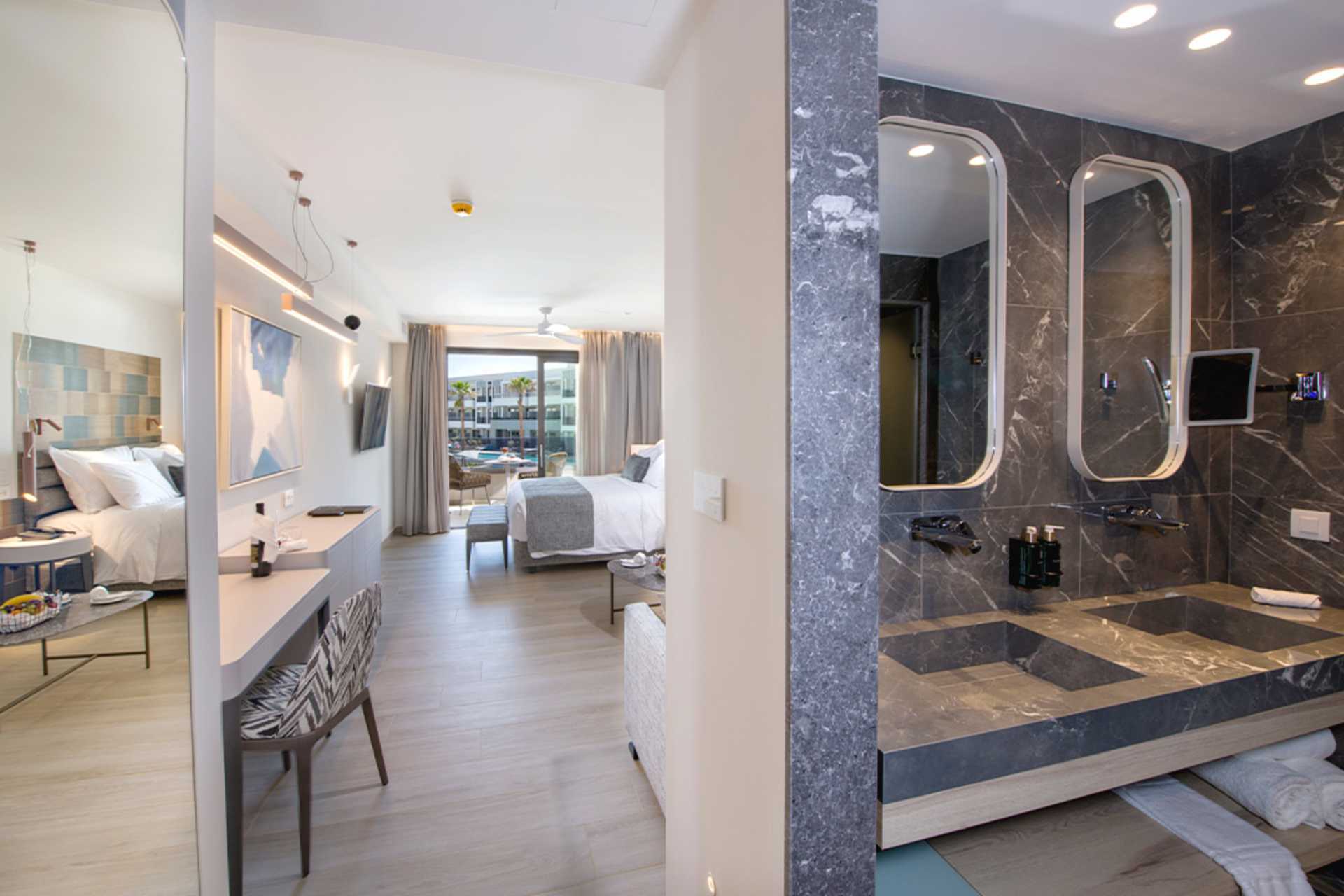 Superior-huone, jossa on parveke ja pääsy jaettuun uima-altaalle, joista osassa on merinäköala ja osassa näkymä uima-altaalle. Ulkotilassa on aurinkotuoleja sekä pöytiä ja tuoleja. Parivuode. Maksuton wifi, ilmastointi ja tallelokero. Jääkaappi. Nespresso-kahvinkeitin - kapselit mukana ja täytetään päivittäin. Vedenkeitin, kahvia ja teetä. Tv kansainvälisillä kanavilla. Silitysrauta ja -lauta. Kylpytakit ja tossut. Hiustenkuivain. Kylpyamme tai suihku ja wc. Siivous 7 krt/viikko.
