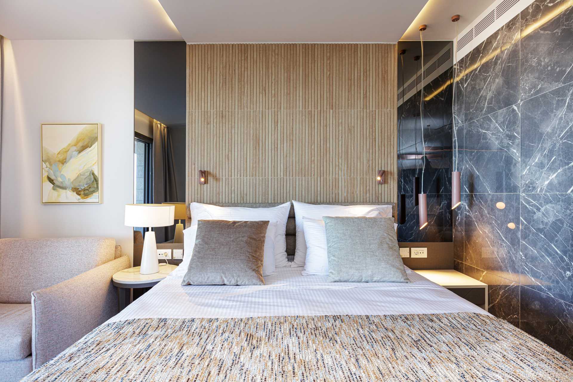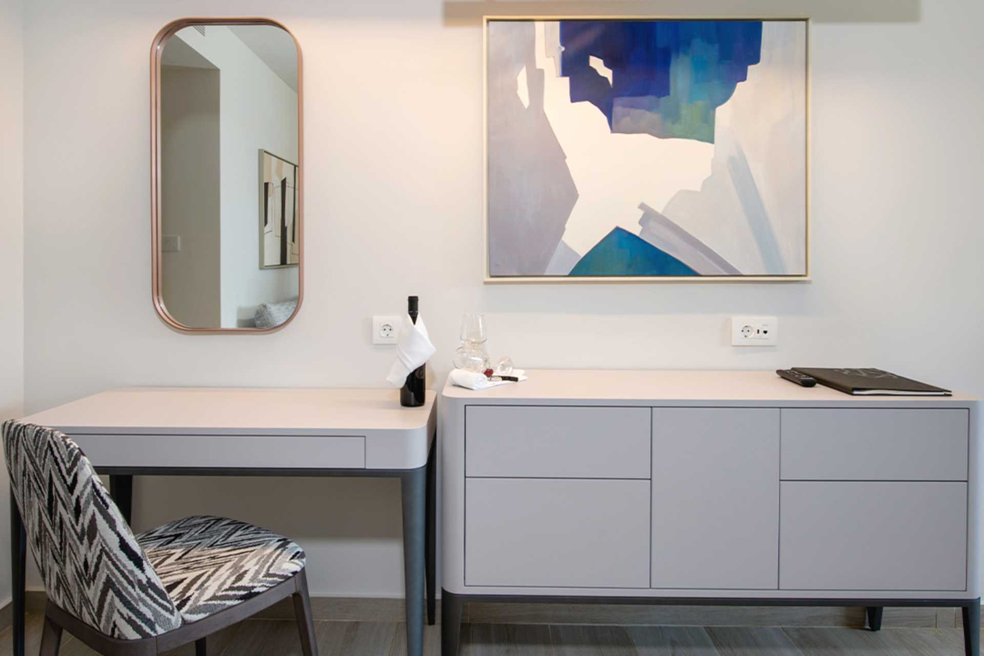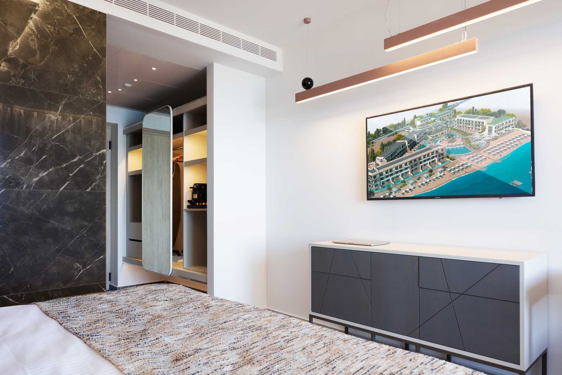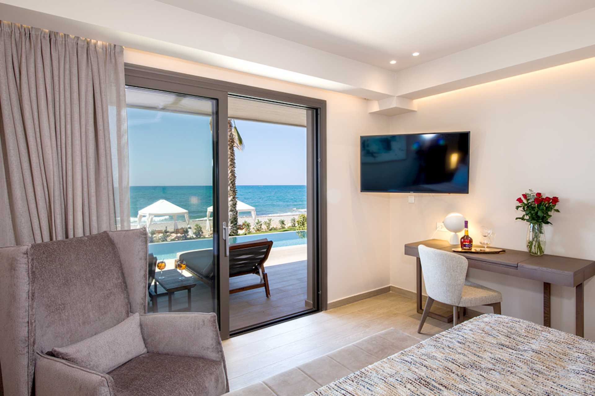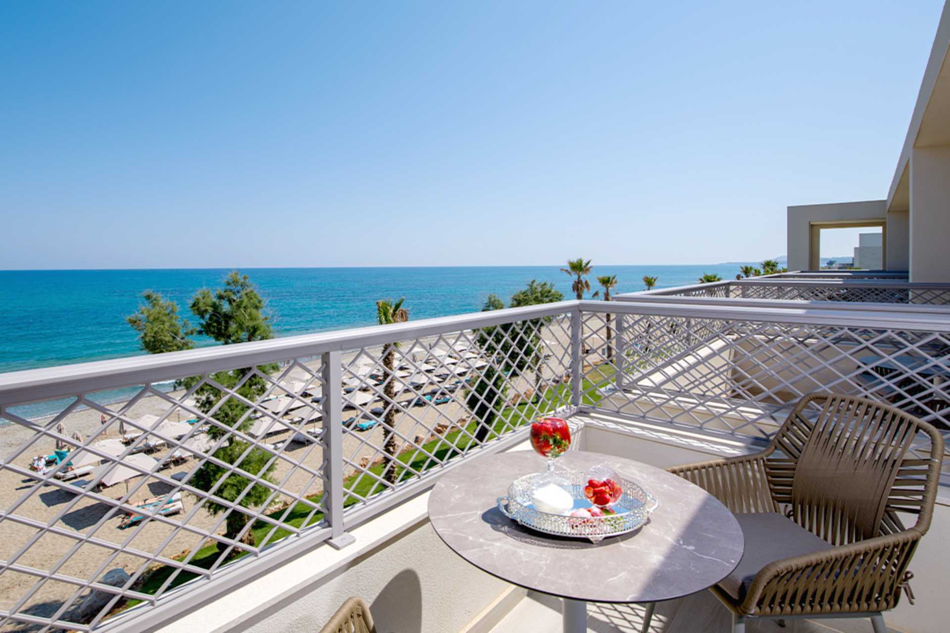 Juniorsviittjä Seafront parvekkeella ja merinäköalalla. Juoniorsviitit sijaitsevat parhaalla sijainnilla lähimpänä rantaa ja merta. Parivuode. Lisävuodemahdollisuus vuodesohvasta. Maksuton wifi, ilmastointi ja tallelokero. Jääkaappi. Espresso-keitin, kapselit sisältyvät ja täytetään päivittäin. Kahvin ja teen keittomahdollisuus. Tv kansainvälisillä kanavilla. Silitysvälineet. Kylpytakki ja tossut. Hiustenkuivain. Amme/suihku ja wc. Siivous 7 krt/viikko.