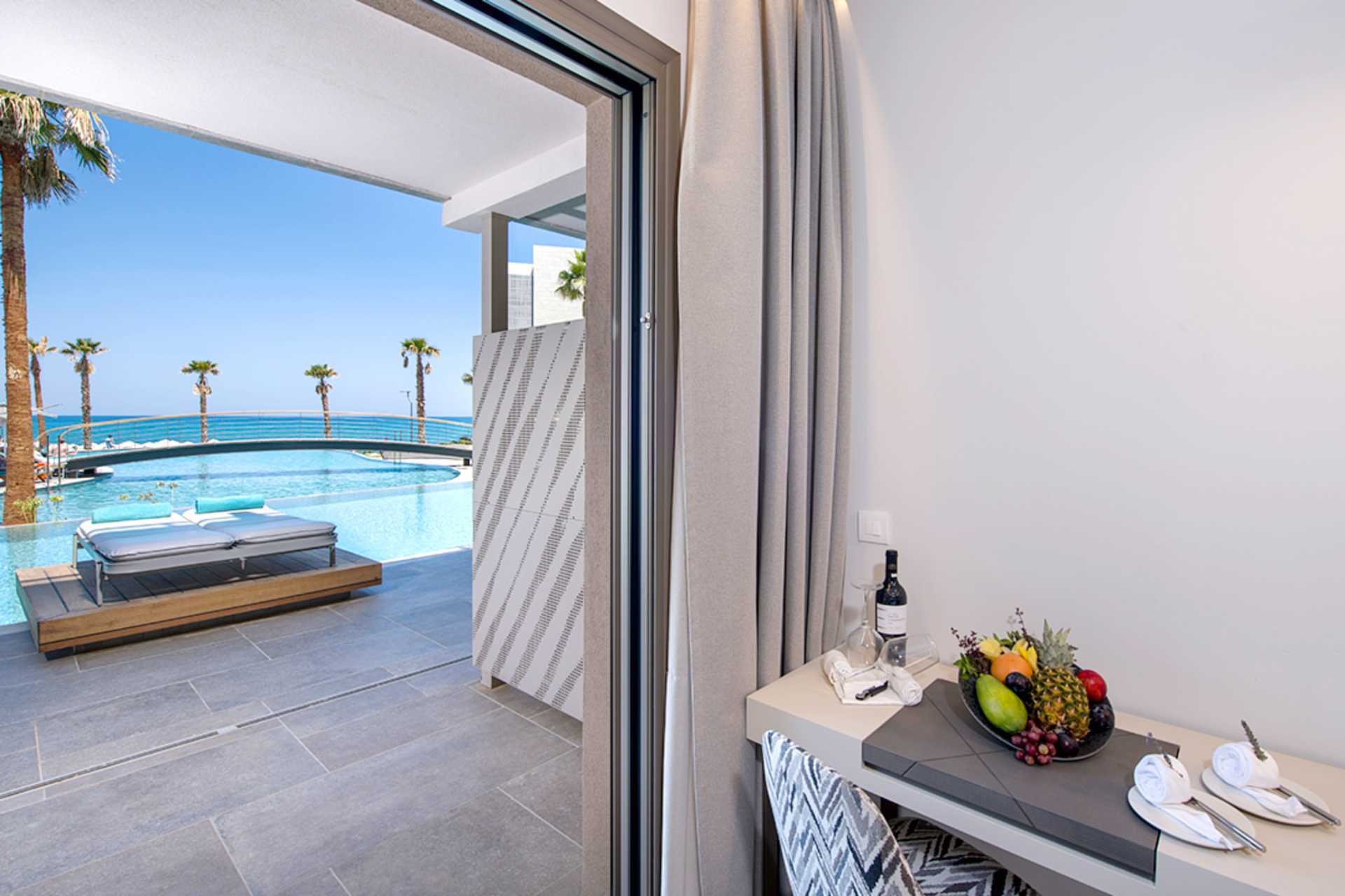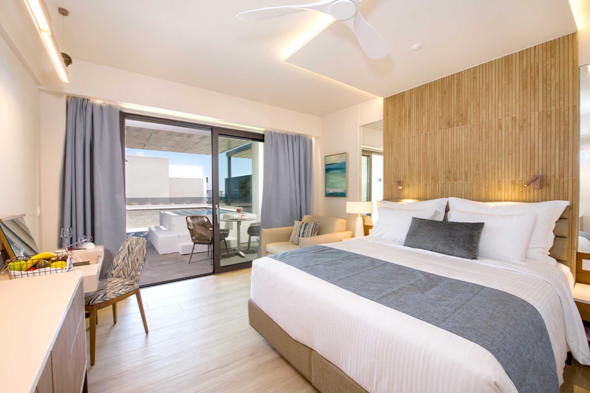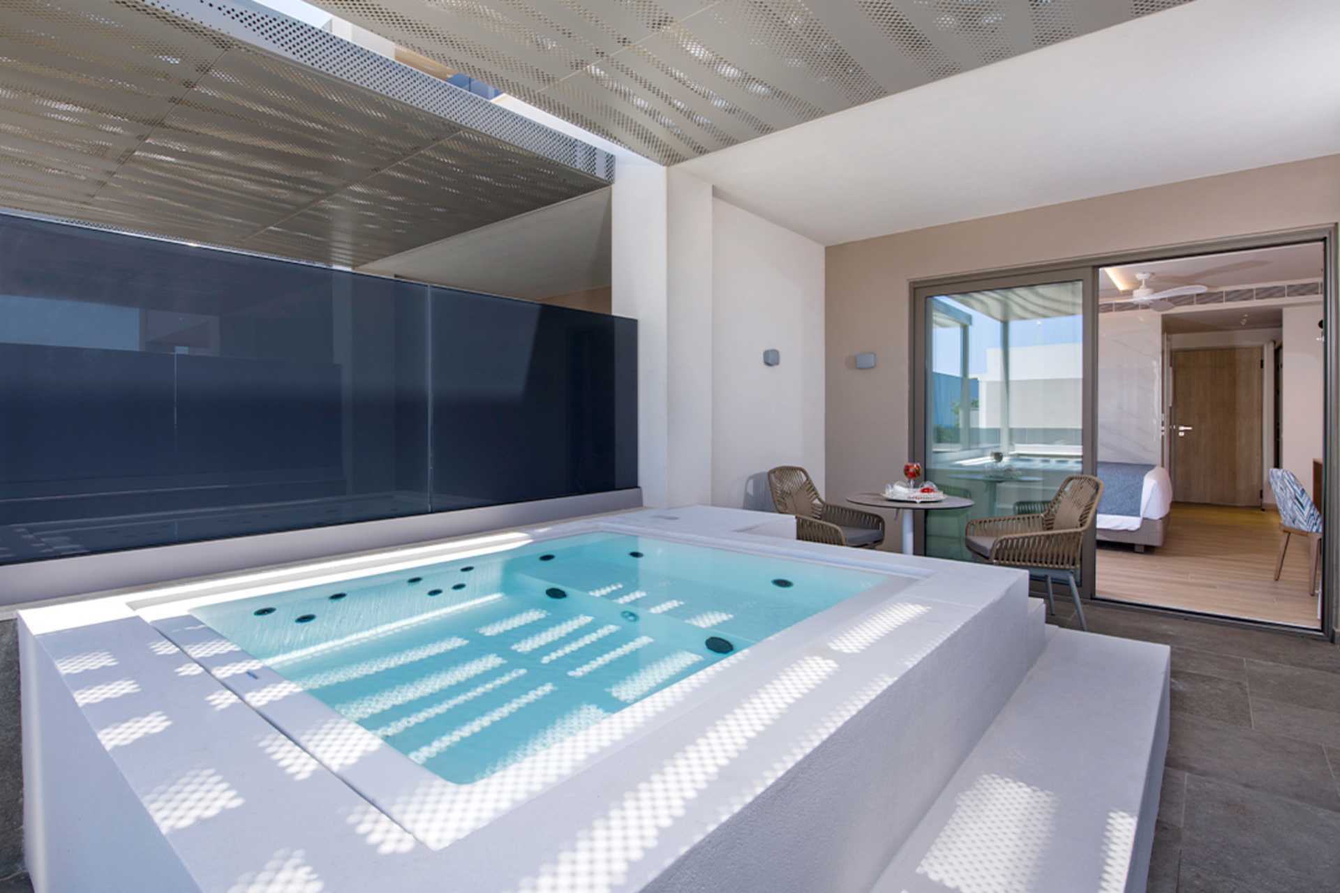 Sviitti, jossa on ulkotila ja oma uima-allas ja merinäköala. Terassilla on aurinkotuoleja sekä pöytiä ja tuoleja. Parivuode. Mahdollisuus saada lisävuode vuodesohvaan. Maksuton wifi, ilmastointi ja tallelokero. Jääkaappi. Espressokeitin - kaapelit mukana ja täytetään päivittäin. Vedenkeitin ja kahvia ja teetä. Tv kansainvälisillä kanavilla. Silitysrauta ja -lauta. Kylpytakit ja tossut. Hiustenkuivaaja. Kylpyhuone ammeella tai suihkulla ja wc. Siivous 7 krt/viikko.