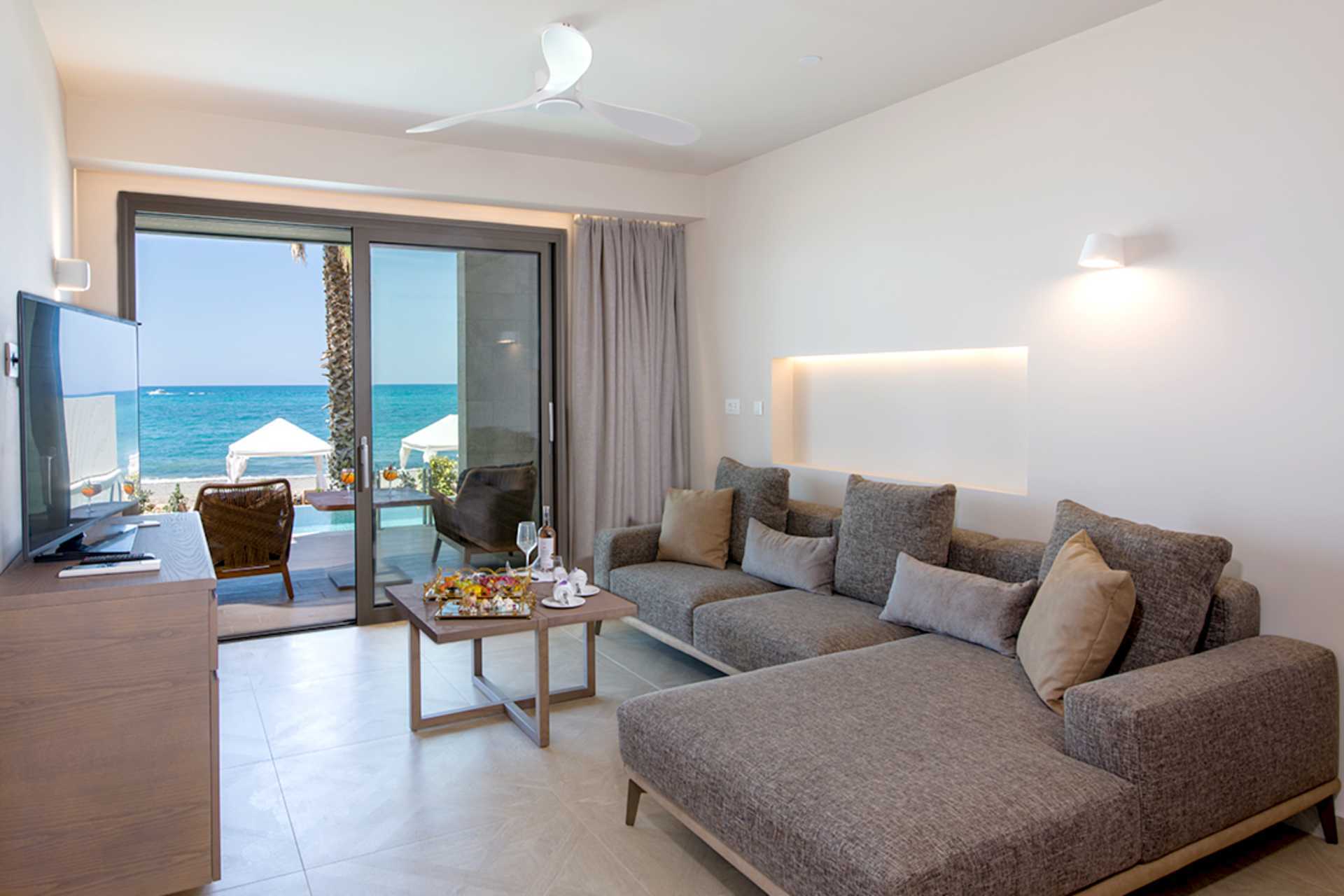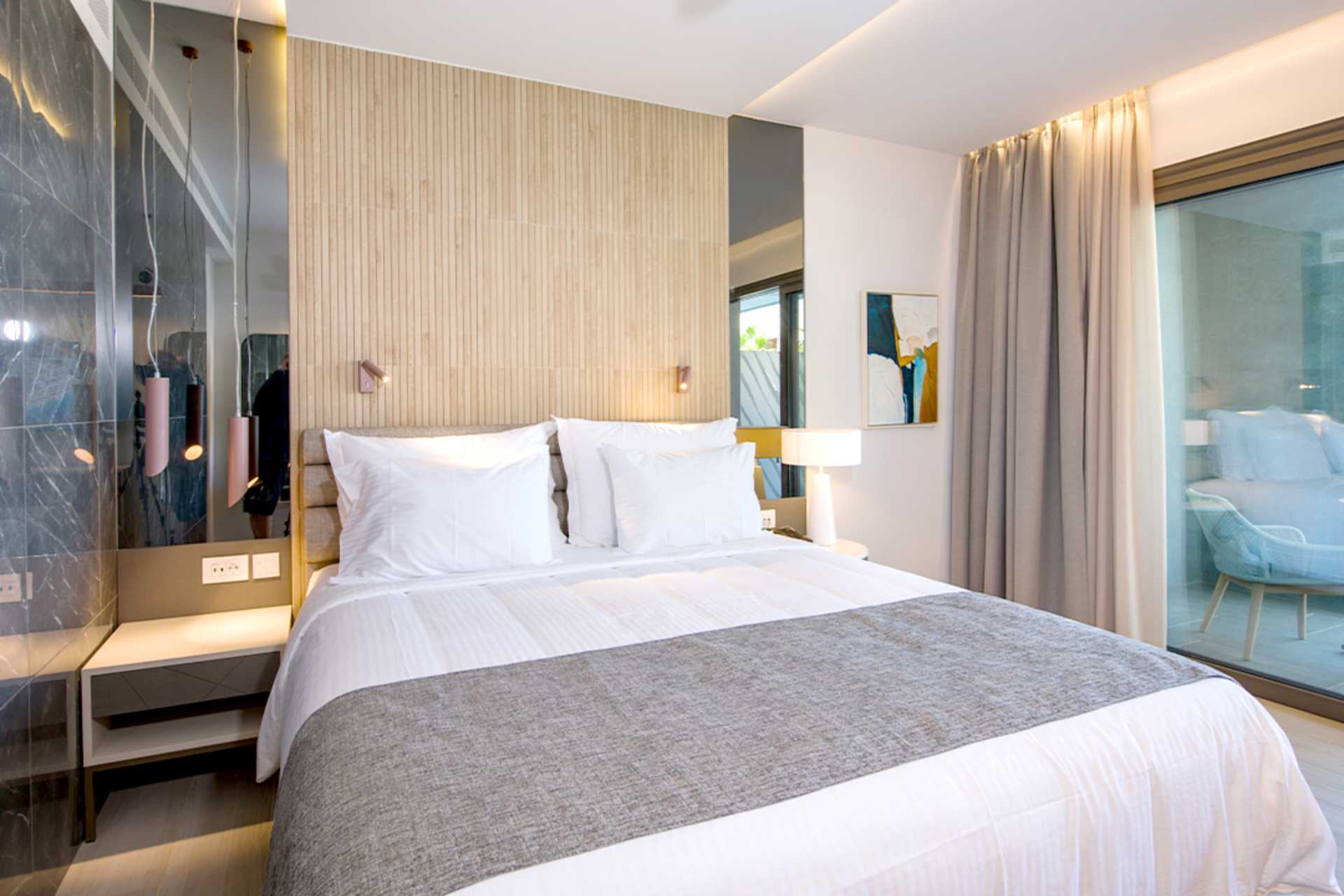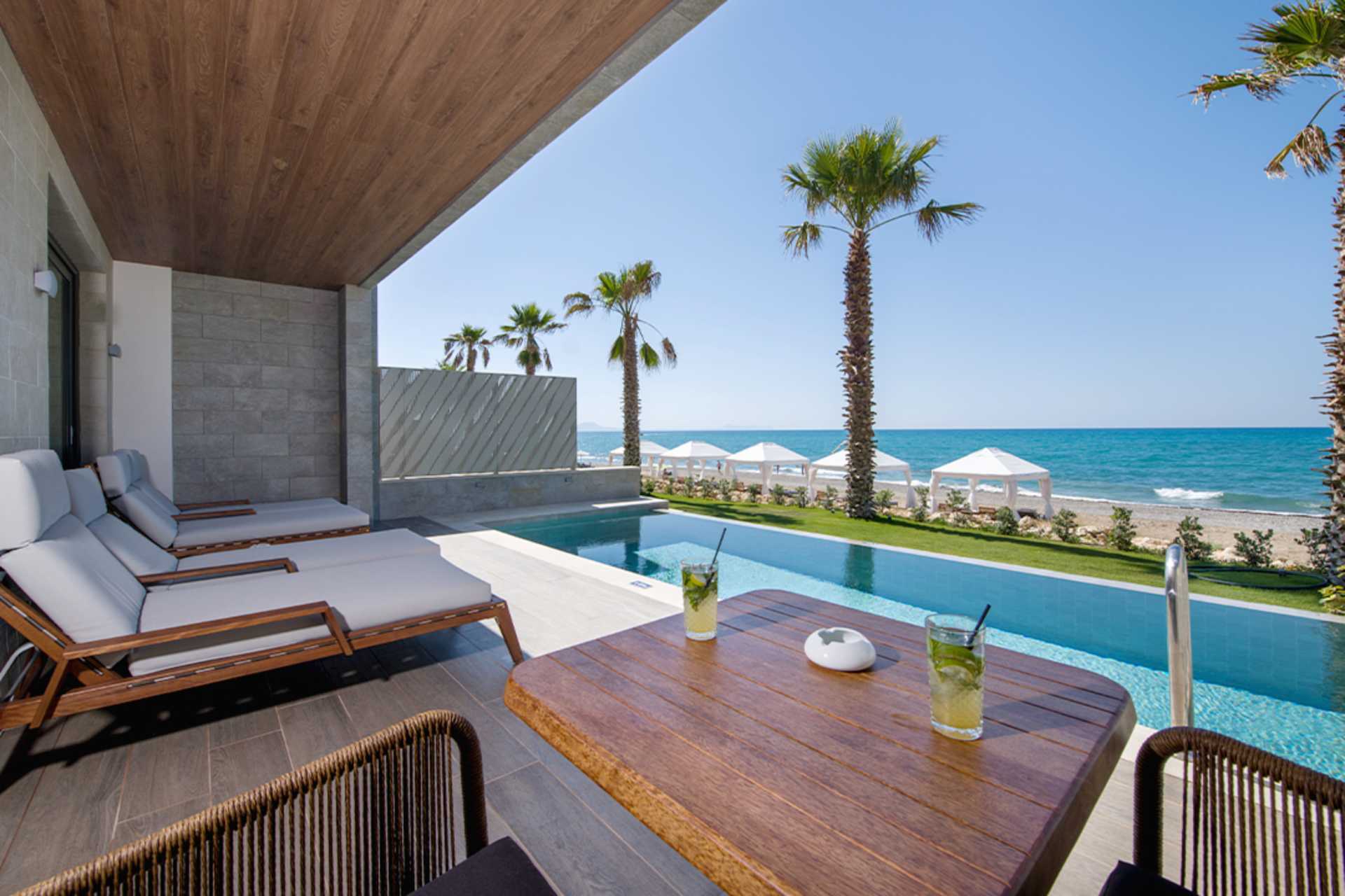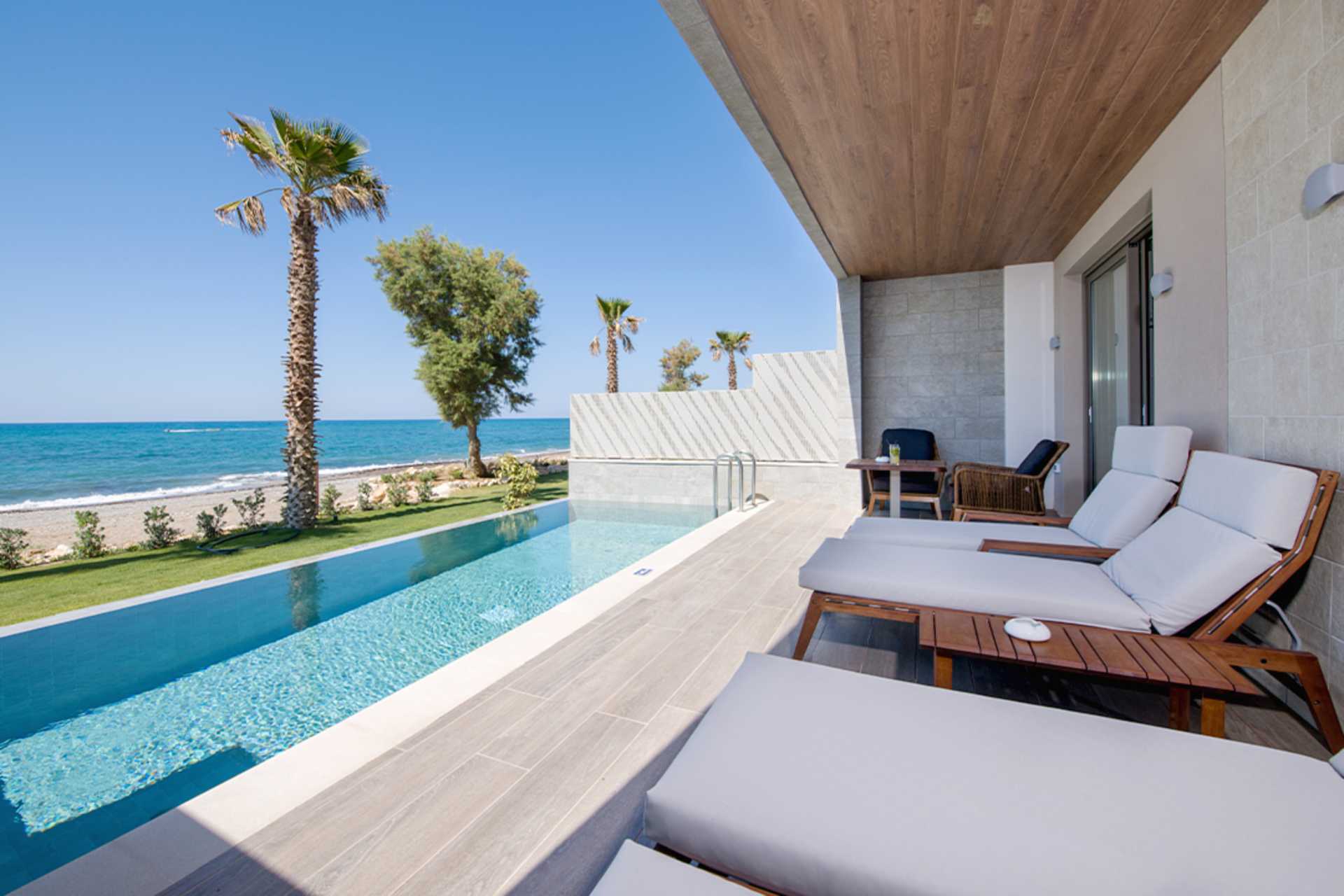 Sviitti, jossa on ulkotila ja oma uima-allas ja merinäköala. Terassilla on aurinkotuoleja sekä pöytiä ja tuoleja. Parivuode. Mahdollisuus saada lisävuode vuodesohvaan. Maksuton wifi, ilmastointi ja tallelokero. Jääkaappi. Espressokeitin - kaapelit mukana ja täytetään päivittäin. Vedenkeitin ja kahvia ja teetä. Tv kansainvälisillä kanavilla. Silitysrauta ja -lauta. Kylpytakit ja tossut. Hiustenkuivaaja. Kylpyhuone ammeella tai suihkulla ja wc. Siivous 7 krt/viikko.
