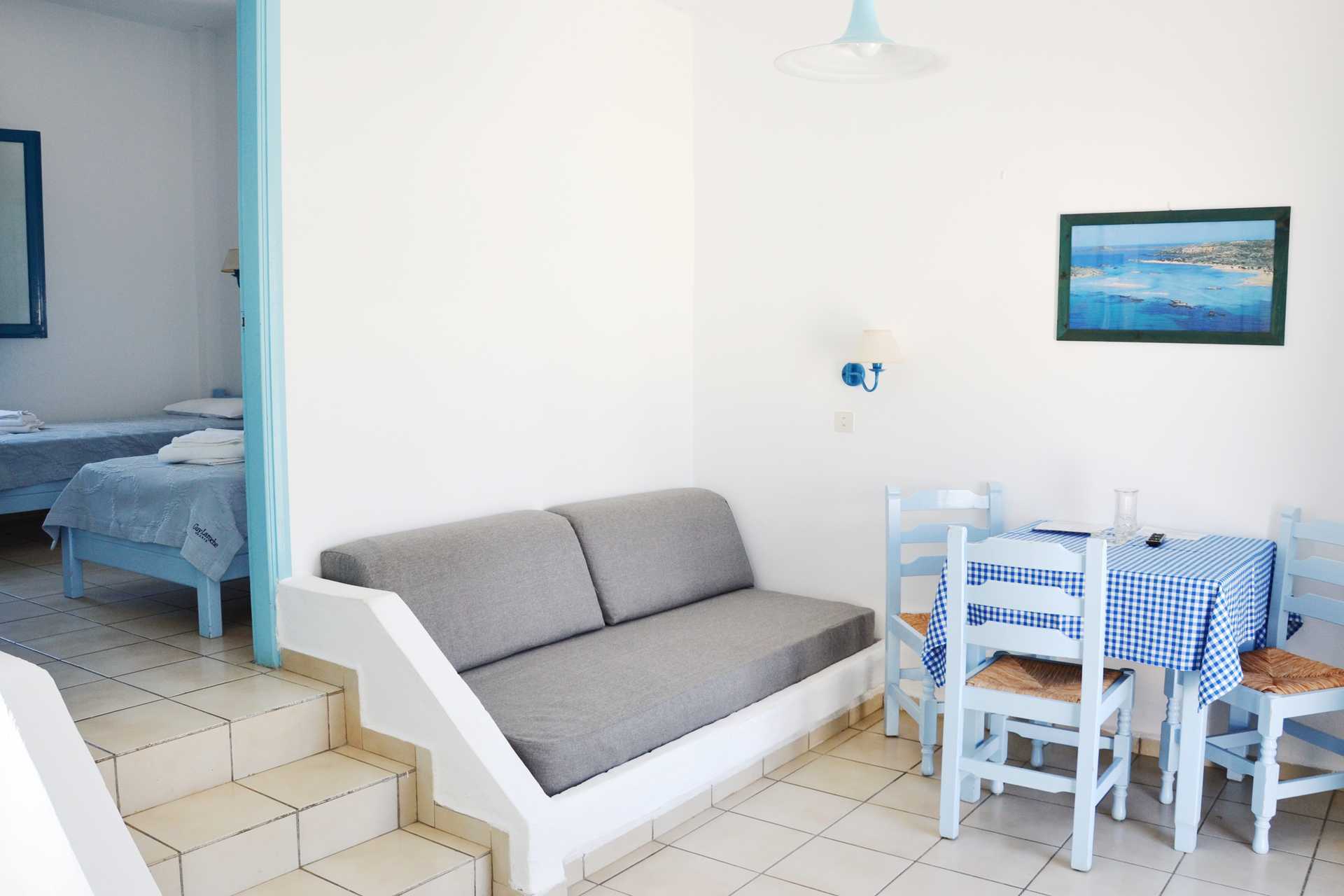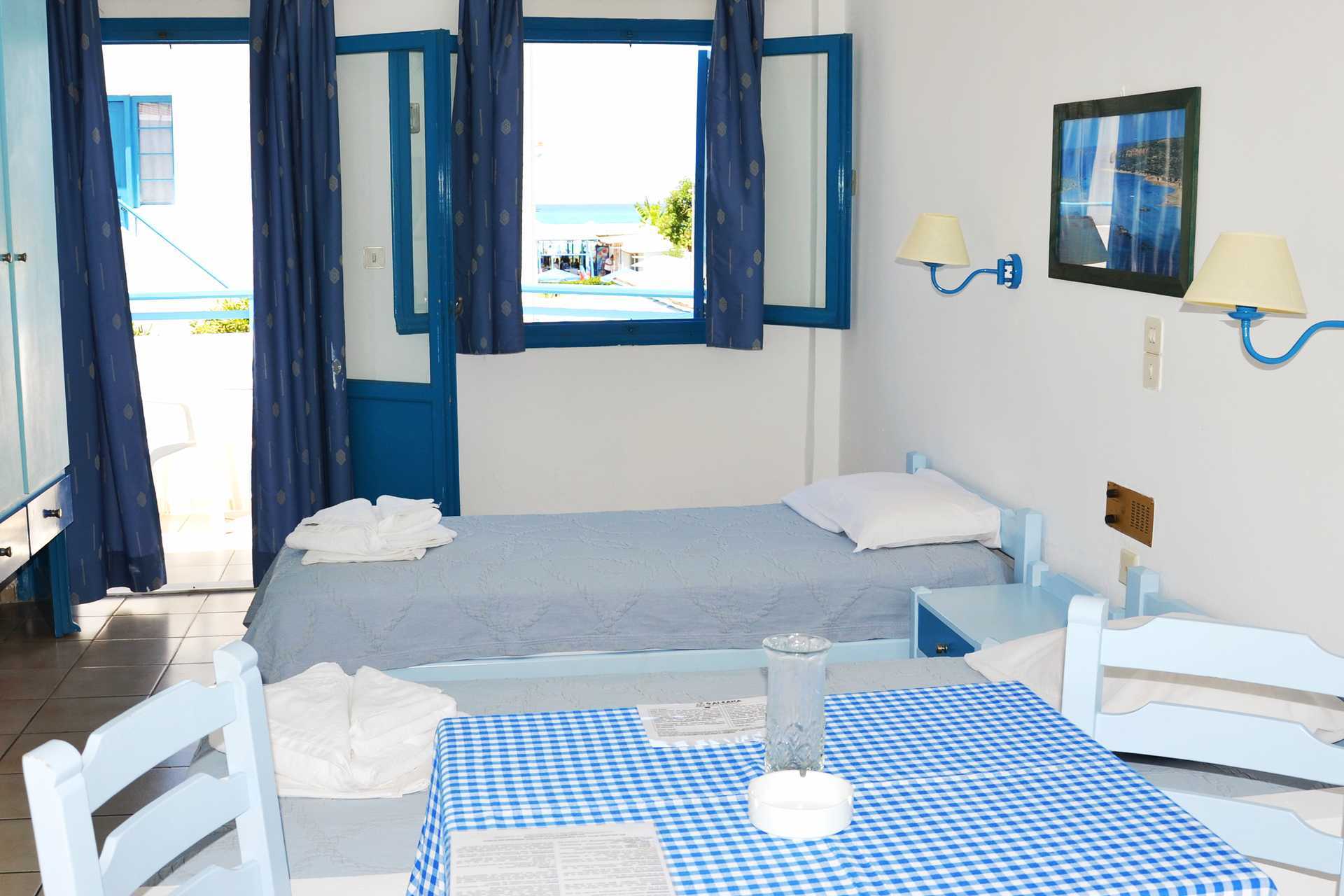 Yksiö, jossa parveke tai terassi. Makuuhuone yhdistetty minikeittiöön. Kaksi yhden hengen sänkyä. Lisävuodemahdollisuus kolmannelle henkilölle. Minikeittiössä keittolevyt, jääkaappi, vedenkeitin, kahvinkeitin ja yksinkertainen keittiövarustus. Maksuton wifi ja ilmastointi. Tallelokero lisämaksusta. Tv kansainvälisillä kanavilla. Hiustenkuivain. Kylpyhuoneessa kylpyamme tai suihku ja wc. Siivous 6 krt/viikko. Alle 2-vuotiaat lapset lasketaan lisävuoteella majoittuviksi henkilöiksi.