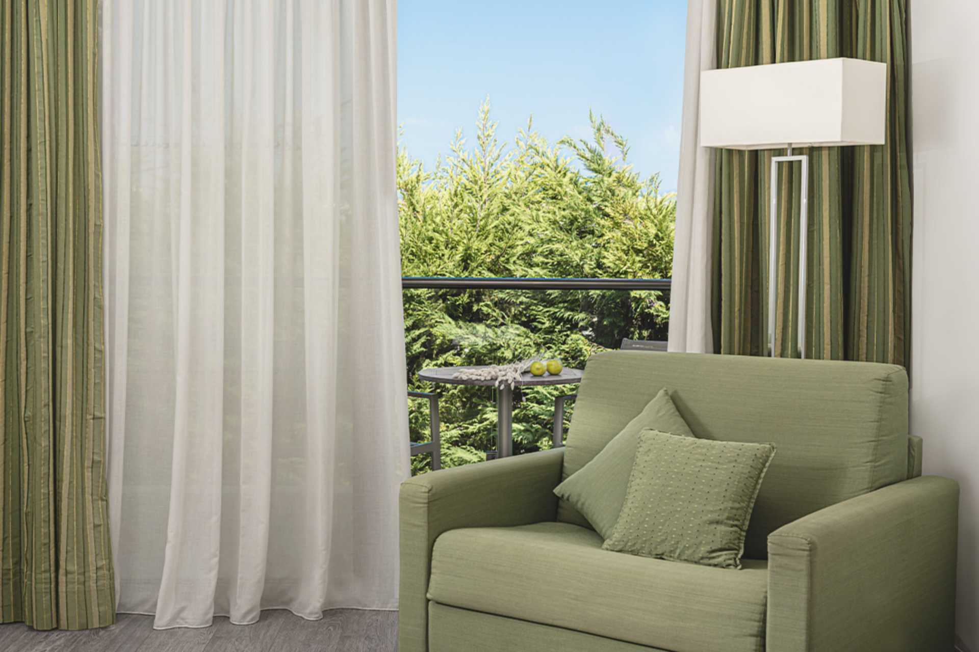 Superior-huone parvekkeella. Parvekkeen ovessa on hyttysverkko. Parivuode tai kaksi yhden hengen sänkyä. Lisävuodemahdollisuus vuodesohvasta. Vedenkeitin, kahvia ja teetä. Minibaari. Maksuton wifi, ilmastointi ja tallelokero. Tv kansainvälisillä kanavilla. Hiustenkuivain. Kylpytakit ja tossut. Kylpyhuonetarvikkeet. Kylpyhuone, jossa poreamme, pyyhekuivain, suihku ja wc. Siivous 7 krt/viikko. Alle 2-vuotiaat lapset lasketaan lisävuoteella majoittuviksi henkilöiksi.