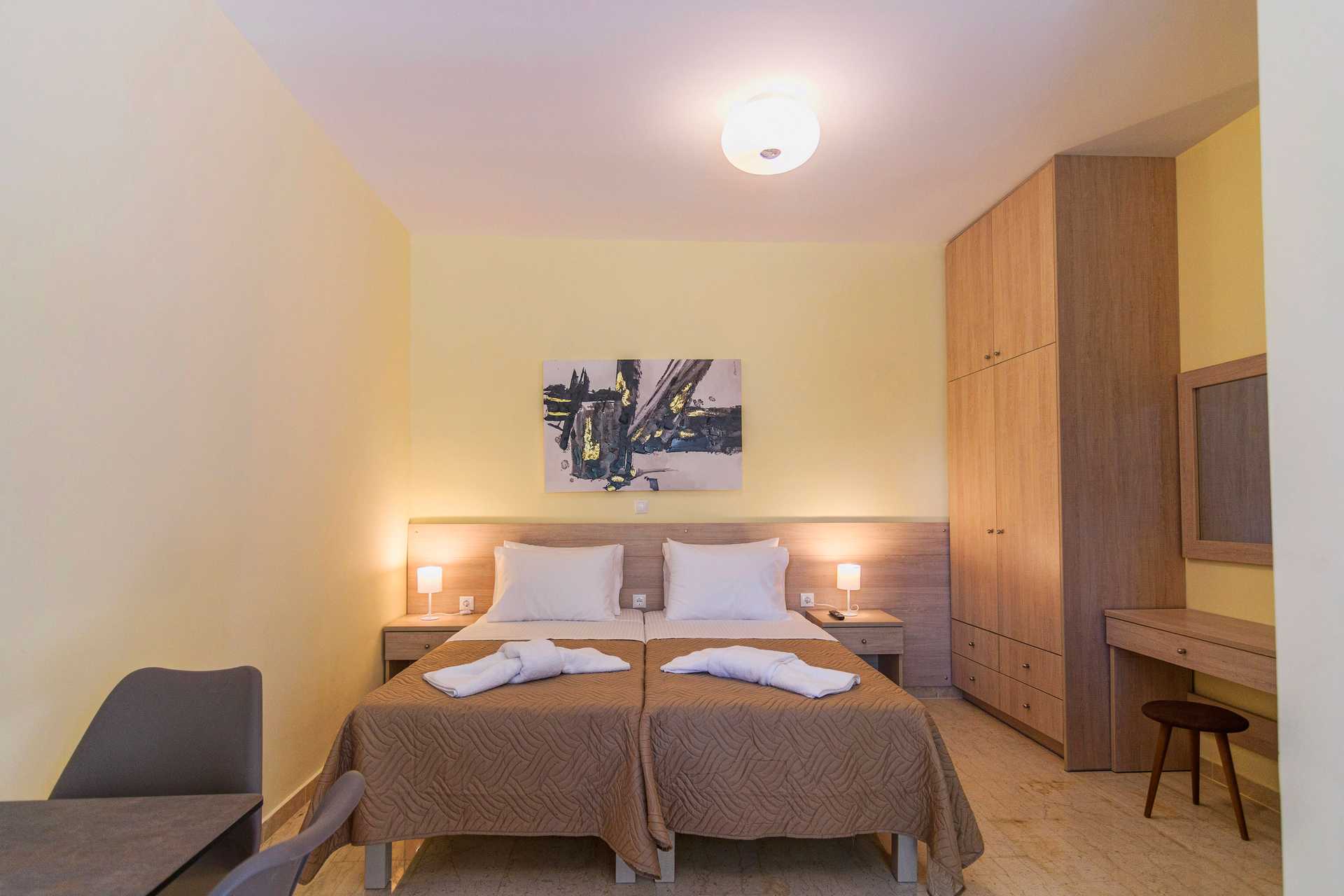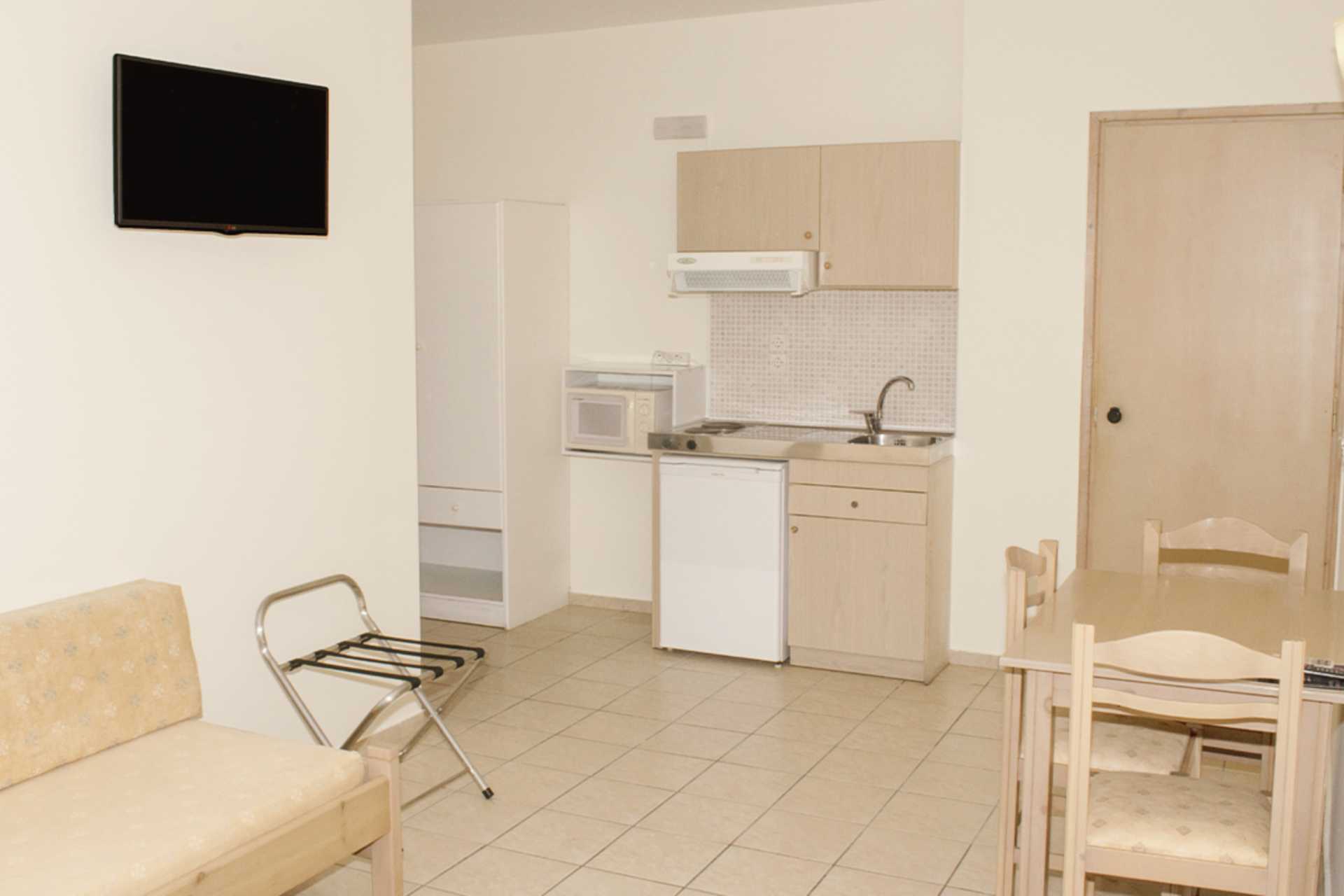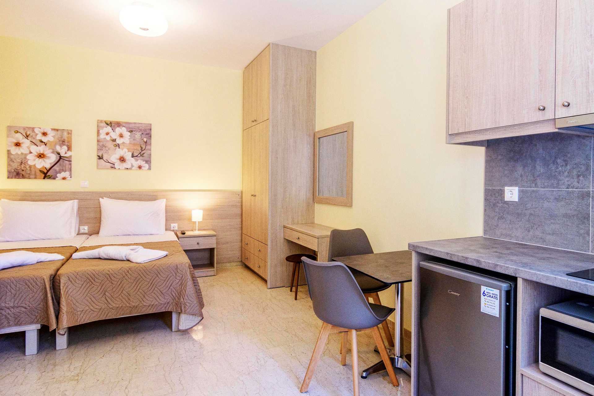 Yksiö parvekkeella. Yhdistetty makuuhuone ja minikeittiö. Parivuode. Lisävuodemahdollisuus vuodesohvasta. Minikeittiössä keittolevyt, jääkaappi, mikro, vedenkeitin ja yksinkertainen keittiövarustus. Maksuton wifi, ilmastointi ja tallelokero. Tv kansainvälisillä kanavilla. Hiustenkuivain. Kylpyhuoneessa suihku ja wc. Siivous 7 krt/viikko.