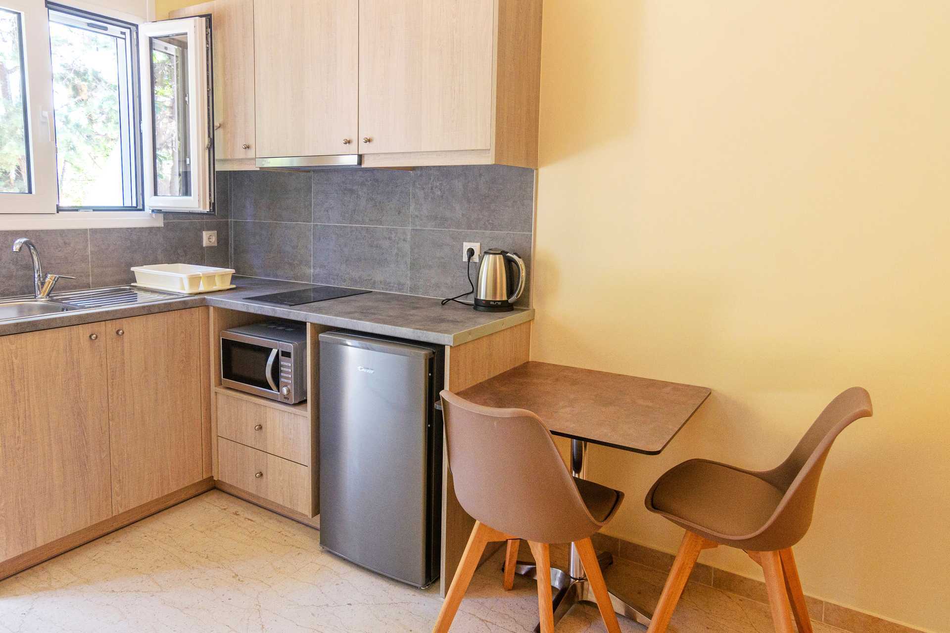 Superior yksiö maaparvekkeella. Yli 16-vuotiaille aikuisille tarkoitetut huoneistot sijaitsevat erillisessä rakennuksessa noin 50 metrin päässä päärakennuksesta. Yhdistetty makuuhuone ja minikeittiö. Parivuode tai kaksi yhden hengen sänkyä. Minikeittiössä keittolevyt, jääkaappi, vedenkeitin, kahvinkeitin ja yksinkertainen keittiövarustus. Ilmastointi, tallelokero ja wifi sisältyvät hintaan. Tv kansainvälisillä kanavilla. Kylpyamme tai suihku ja wc. Siivous 7 krt/viikko.