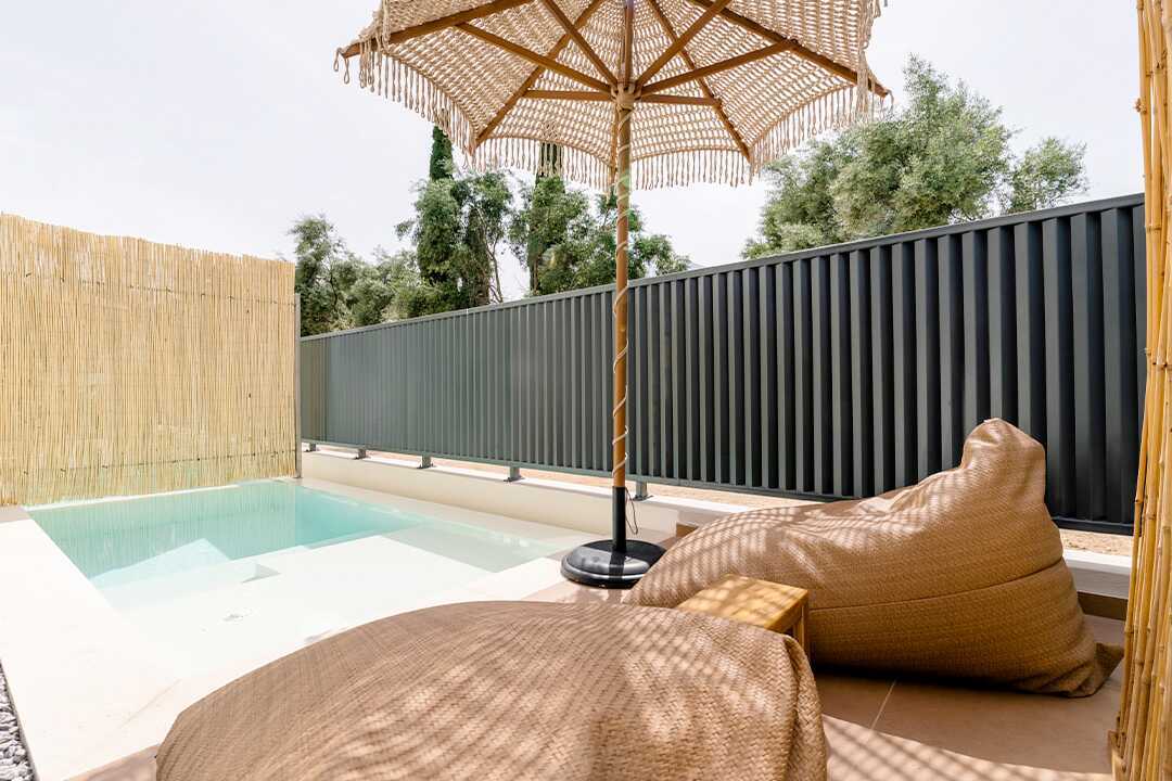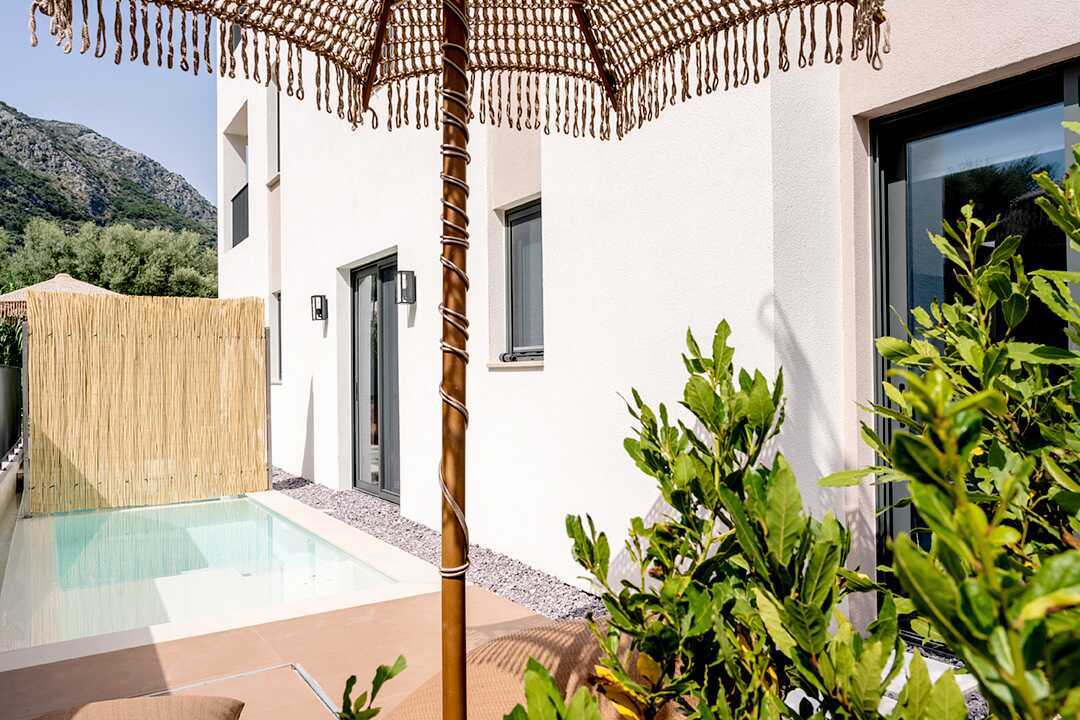 Juniorsviitti maaterassilla ja oma uima-allas. Maaterasilla on aurinkovarjoja ja säkkituoleja. Maksuton wifi ja ilmastointi. Parivuode. Minibaari. Vedenkeitin, kahvia, teetä tai kahvinkeitin. Tv kansainvälisillä kanavilla. Hiustenkuivain. Kylpyhuoneessa suihku ja wc. Siivous 7 krt/viikko.