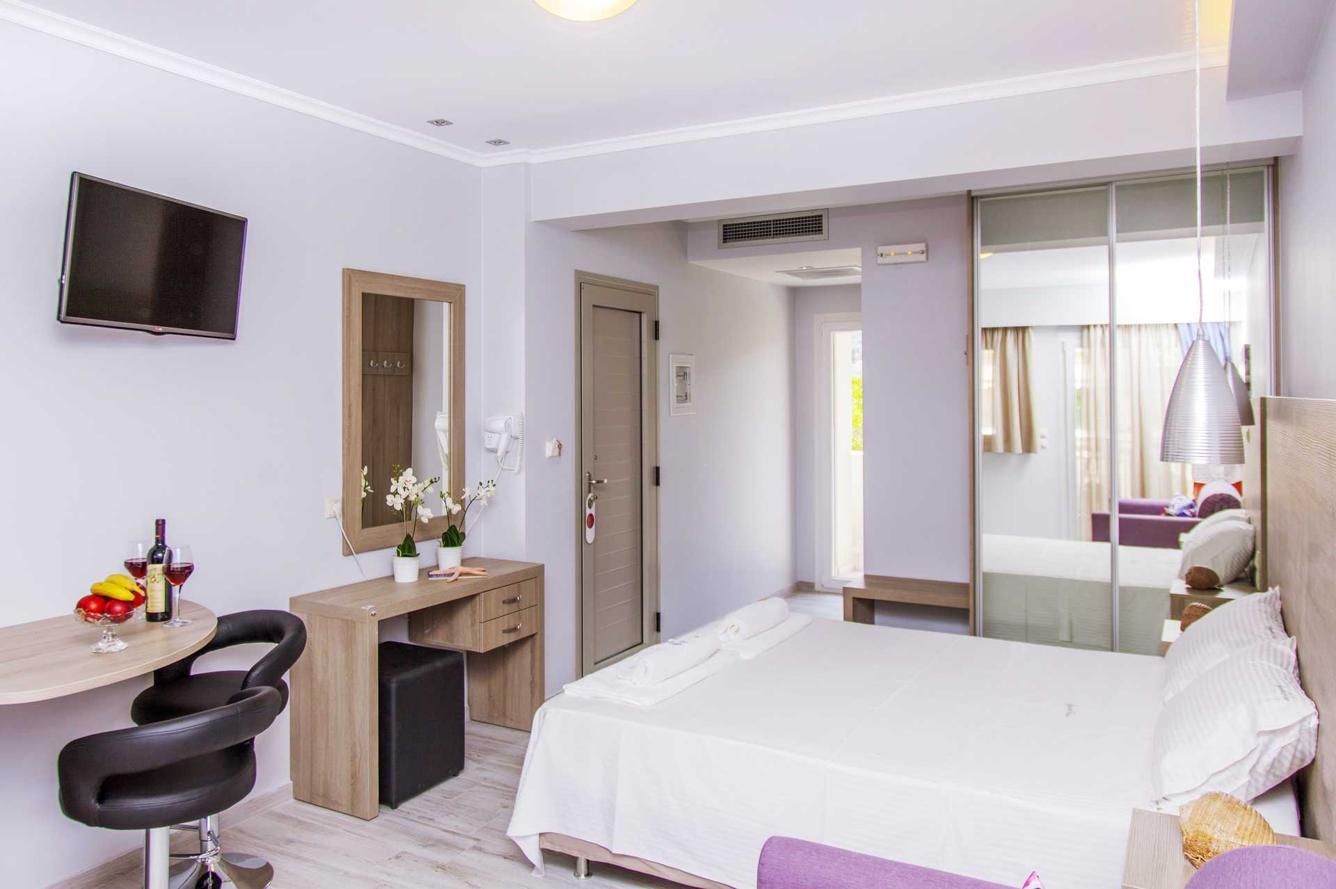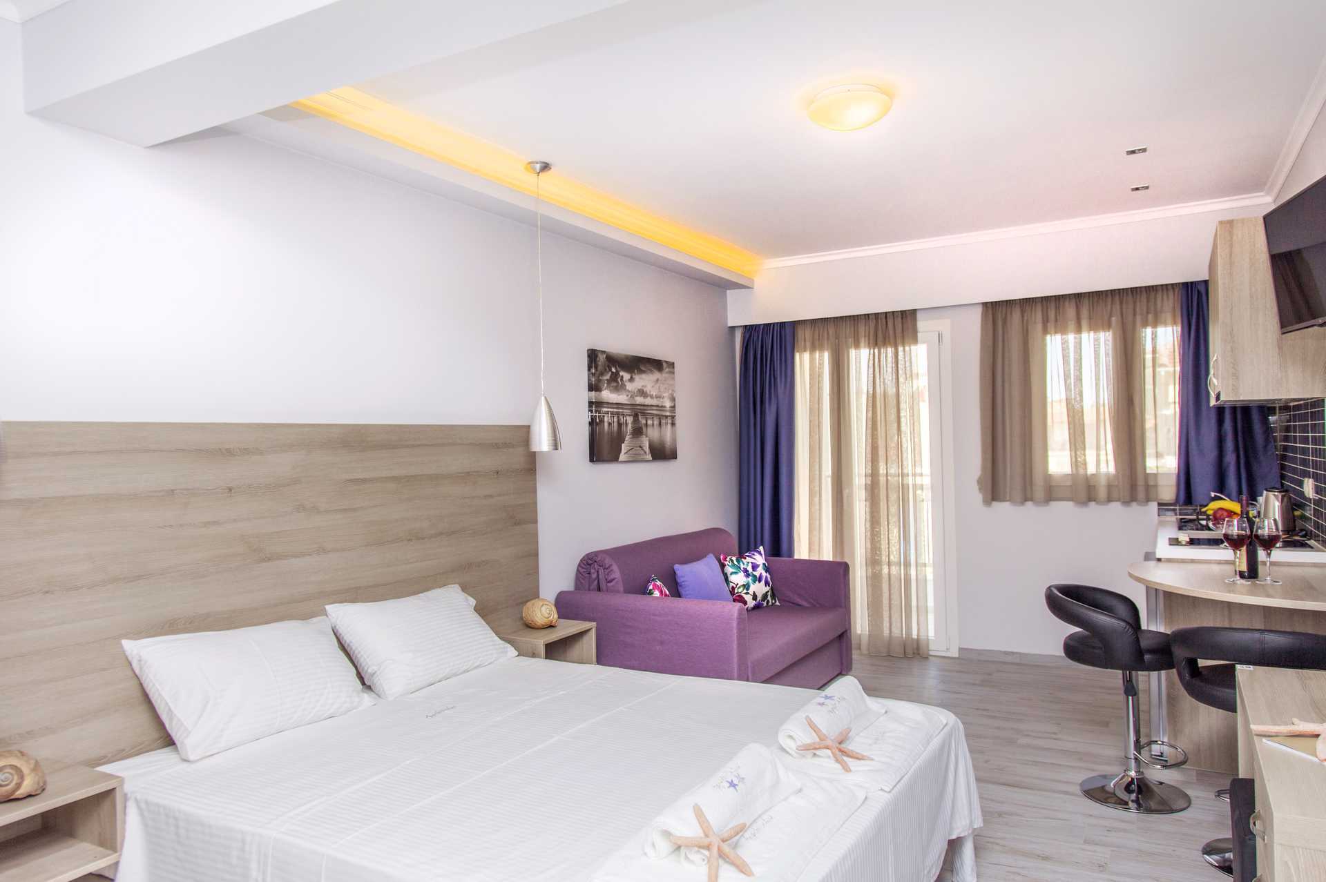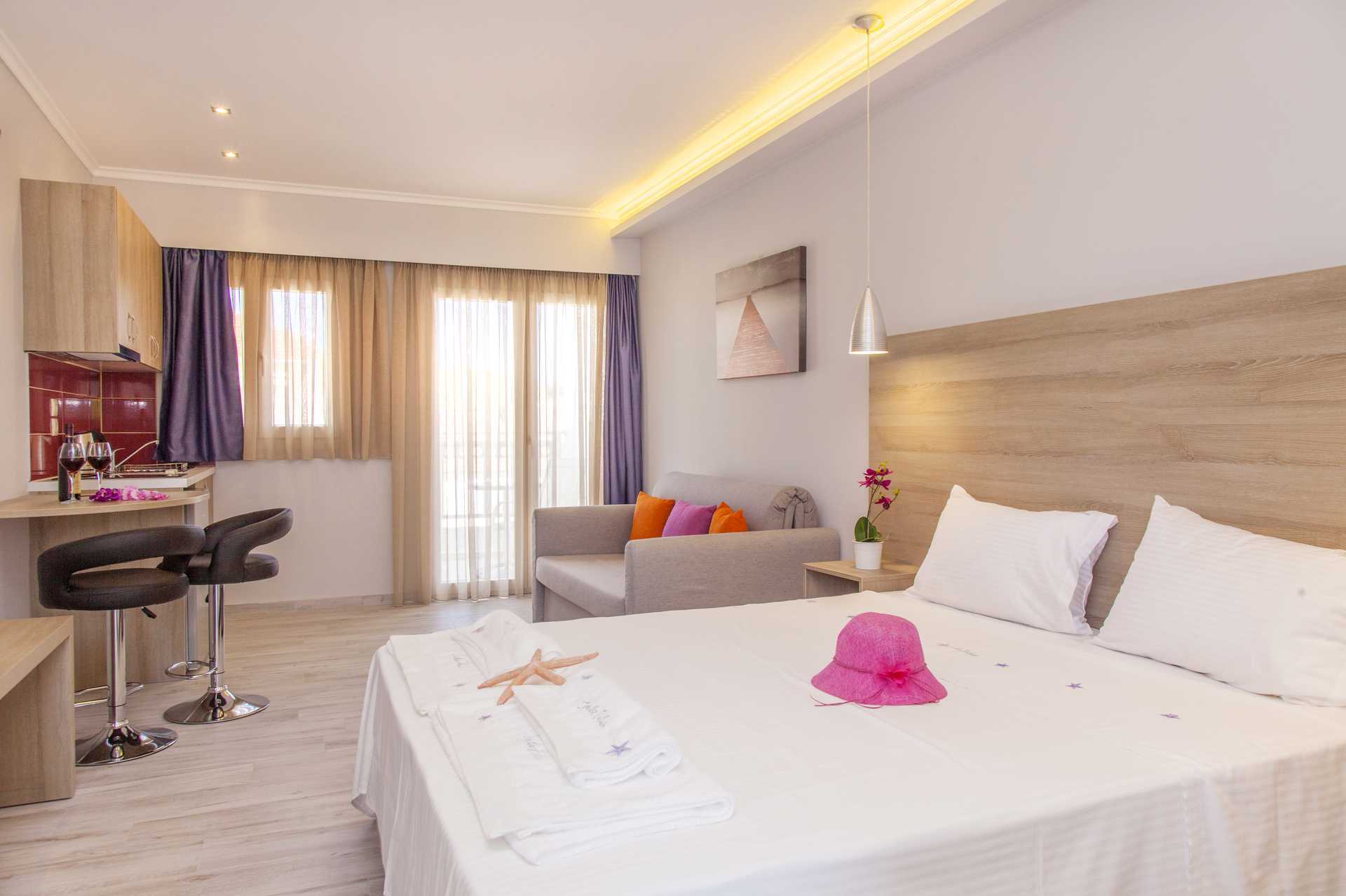 Yksiö parvekkeella. Yhdistetty makuuhuone ja minikeittiö. Parivuode tai kaksi yhden hengen sänkyä. Lisävuodemahdollisuus vuodesohvasta. Neljän henkilön majoittuessa samassa huoneessa voidaan huone kokea ahtaaksi. Minikeittiössä keittolevyt, jääkaappi, vedenkeitin ja yksinkertainen keittiövarustus. Maksuton wifi. Ilmastointi ja tallelokero lisämaksusta. Tv kansainvälisillä kanavilla. Hiustenkuivain. Suihku ja wc. Siivous 6 krt/viikko.
