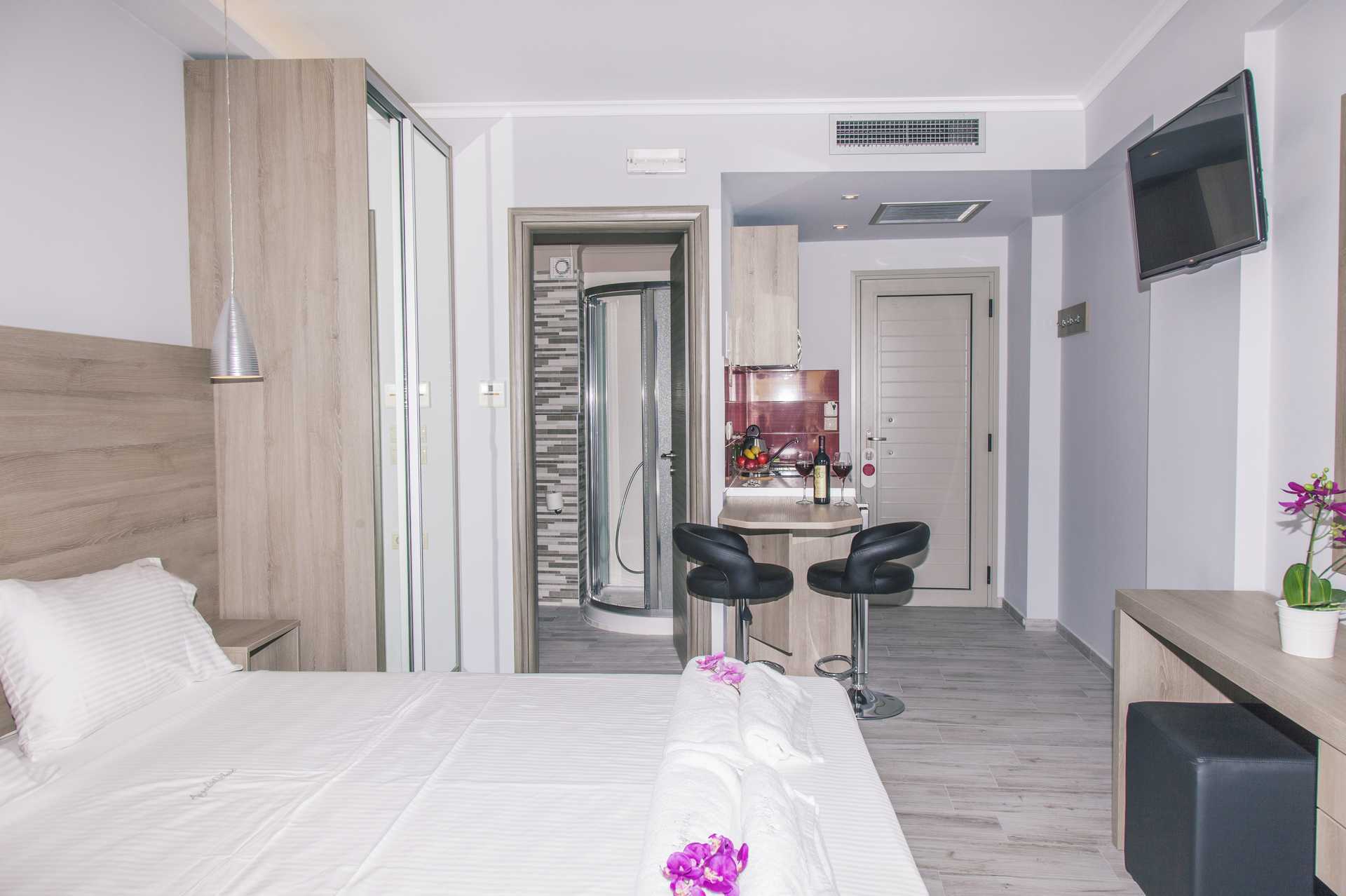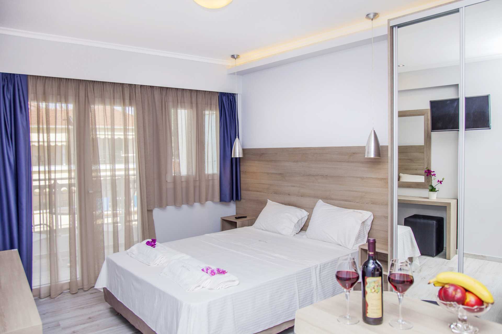 Deluxe -yksiö parvekkeella. Yhdistetty makuuhuone ja minikeittiö. Parivuode tai kaksi yhden hengen sänkyä. Lisävuodemahdollisuus vuodesohvasta. Minikeittiö, jossa on keittolevyt, jääkaappi ja yksinkertaiset keittiövälineet. Baaritiski. Maksuton wifi. Ilmastointi ja tallelokero lisämaksusta. Tv kansainvälisillä kanavilla. Hiustenkuivain. Suihku ja wc. Siivous 6 krt/viikko.