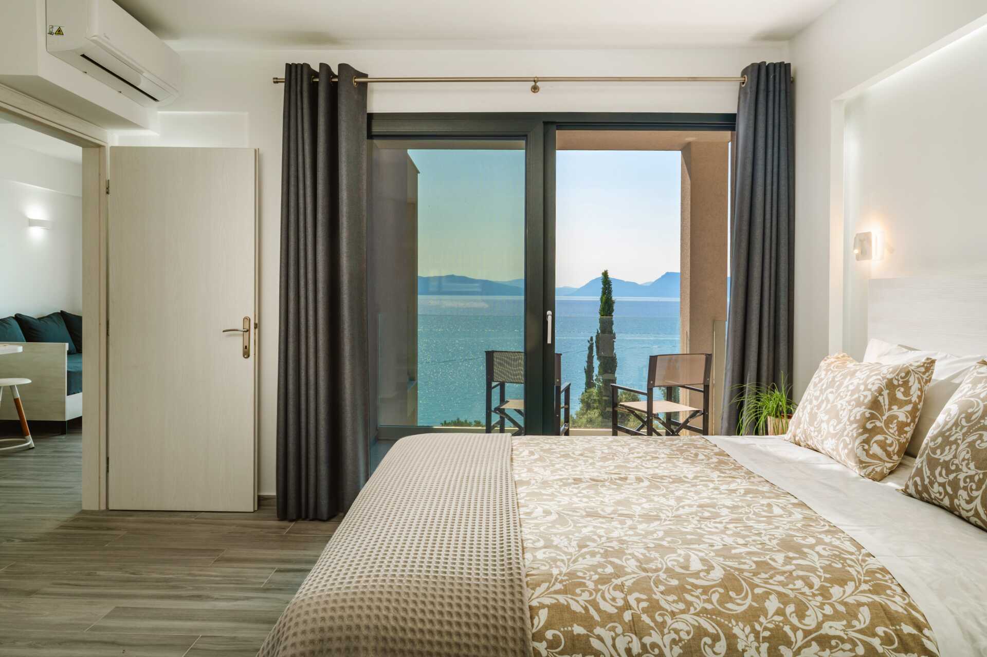Yksiö Parvekkeen tai Maaterassin kanssa, molemmista merinäköala. Yhdistetty makuuhuone ja minikeittiö. Parivuode. Lisävuodemahdollisuus yhden hengen sängystä. Minikeittiössä keittolevyt, uuni, jääkaappi ja yksinkertainen keittiövarustus. Maksuton wifi, ilmastointi ja tallelokero. Tv kansainvälisillä kanavilla. Suihku ja wc. Siivous 6 krt/viikko.