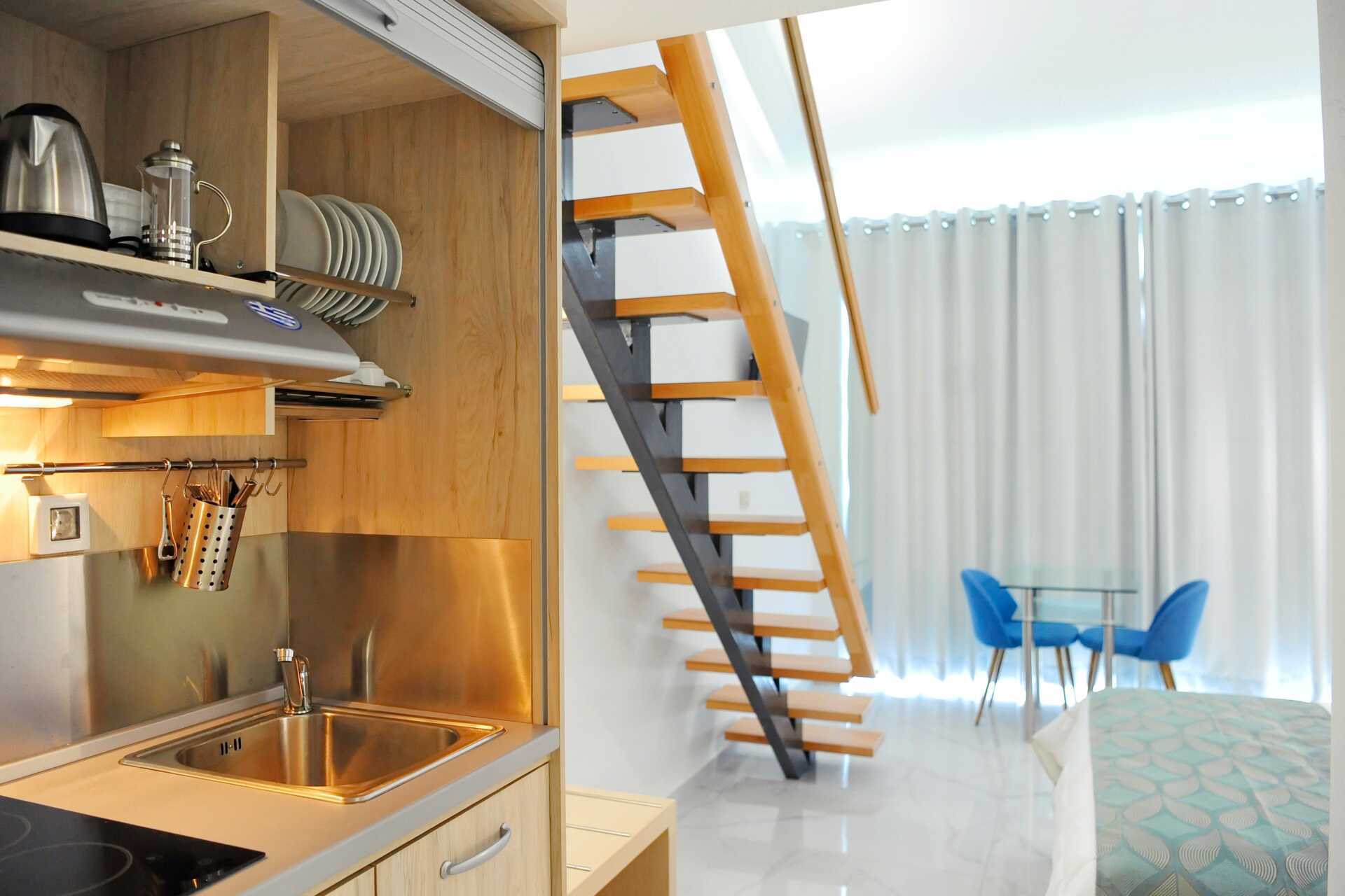 Kaksikerroksinen yksiö, jossa parveke ja näköala uima-altaalle. Huoneisto sijaitsee hotellin uudessa osassa. Sisääntulokerroksessa on parivuode, minikeittiö ja erillinen wc. Yläkerrassa on makuuparvi, jossa kaksi erillistä sänkyä ja kylpyhuone. Minikeittiössä keittolevyt, jääkaappi, vedenkeitin ja yksinkertainen keittiövarustus. Maksuton wifi, ilmastointi ja tallelokero. Tv paikallisilla kanavilla. Kylpyhuoneessa amme/ suihku ja wc. Siivous 6 krt/viikko.