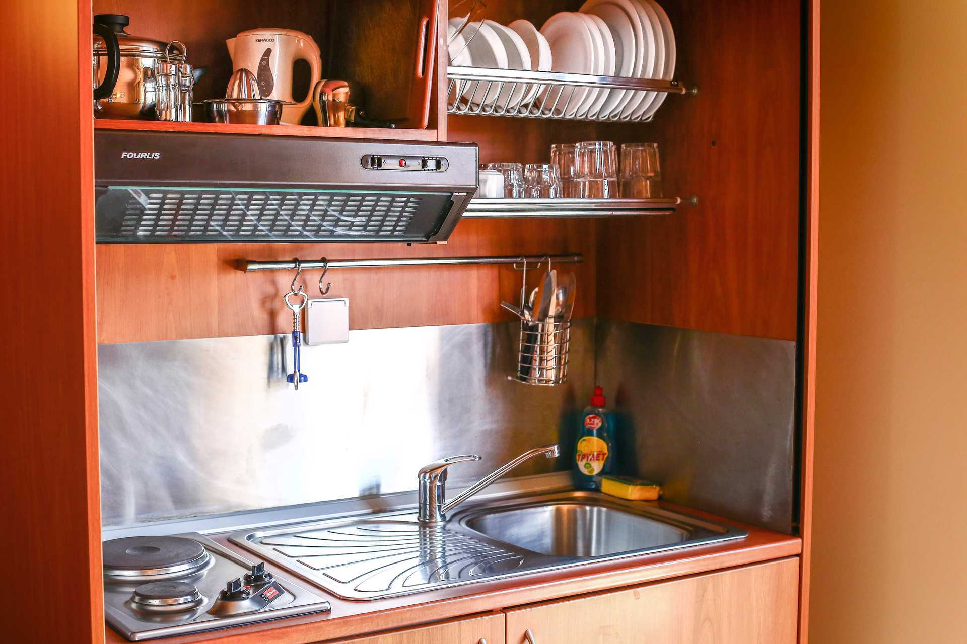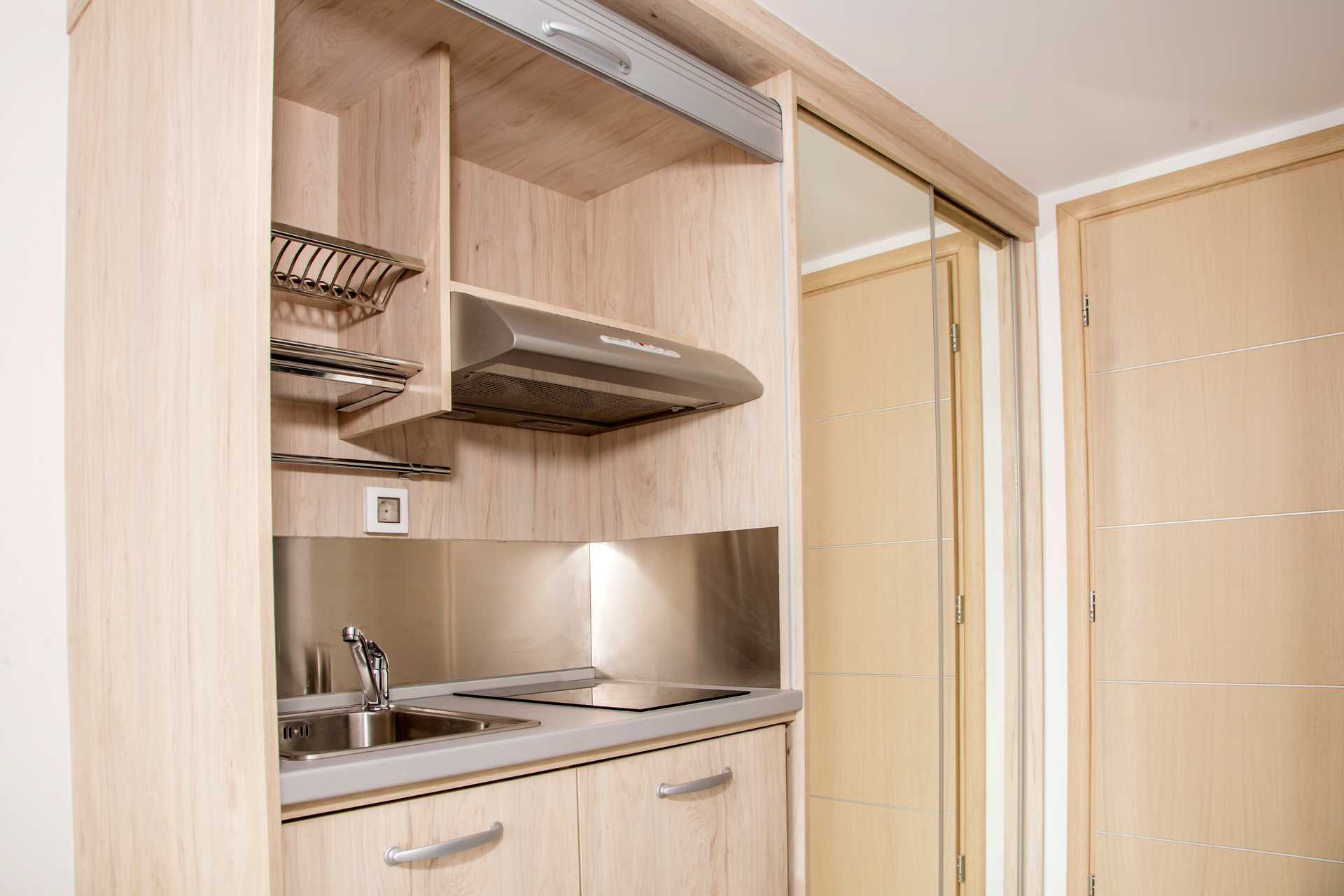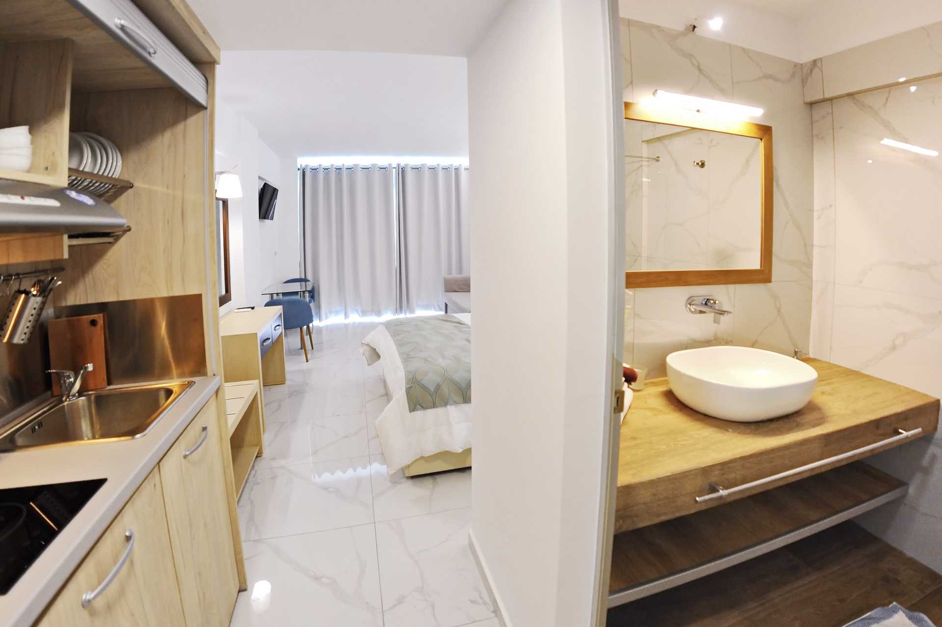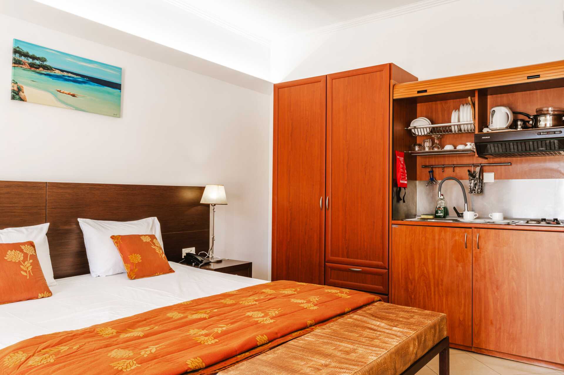 Yksiö, parvekkeella tai maaparvekkeella, joista osasta on näkymä uima-altaalle. Kaikki yksiöt sijaitsevat vanhemmassa osassa. Yhdistetty makuuhuone ja minikeittiö. Parivuode tai kaksi yhden hengen sänkyä. Lisävuodemahdollisuus vuodesohvasta. Minikeittiö, jossa jääkaappi, liesi, vedenkeitin ja yksinkertaiset keittiövälineet. Maksuton wifi, ilmastointi ja tallelokero. Tv paikallisilla kanavilla. Hiustenkuivain. Suihku ja wc. Siivous 6 krt/viikko. Kalusteet voivat vaihdella asuntojen välillä.