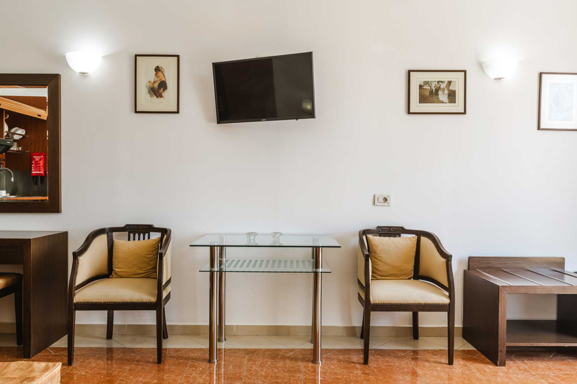 Kaksioita, joissa on parveke allasnäkymällä. Kaksiot sijaitsevat hotellin vanhassa osassa. Makuuhuone ja yhdistetty olohuone ja minikeittiö. Parivuode tai kaksi yhden hengen vuodetta. Lisävuodemahdollisuus vuodesohvasta. Minikeittiö, jossa on jääkaappi, keittolevyt, vedenkeitin ja yksinkertainen keittiövarustus. Maksuton wifi, ilmastointi ja tallelokero. Tv paikalliskanavilla. Kylpyamme tai suihku ja wc. Siivous 6 krt/viikko.